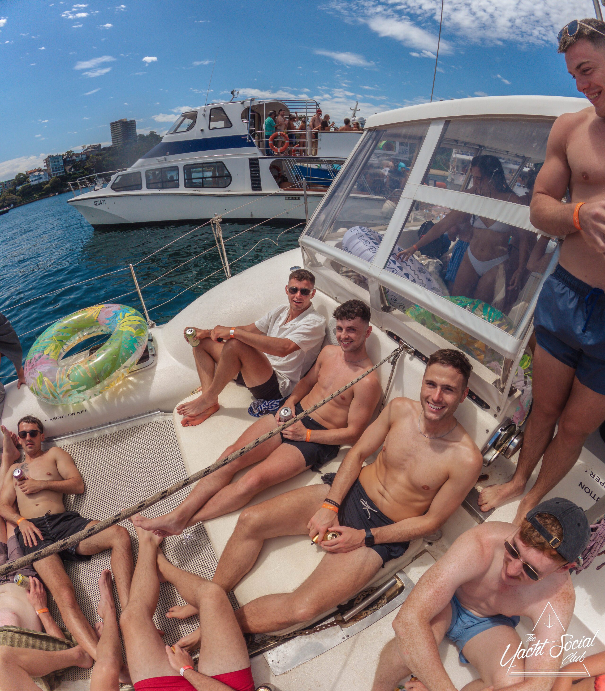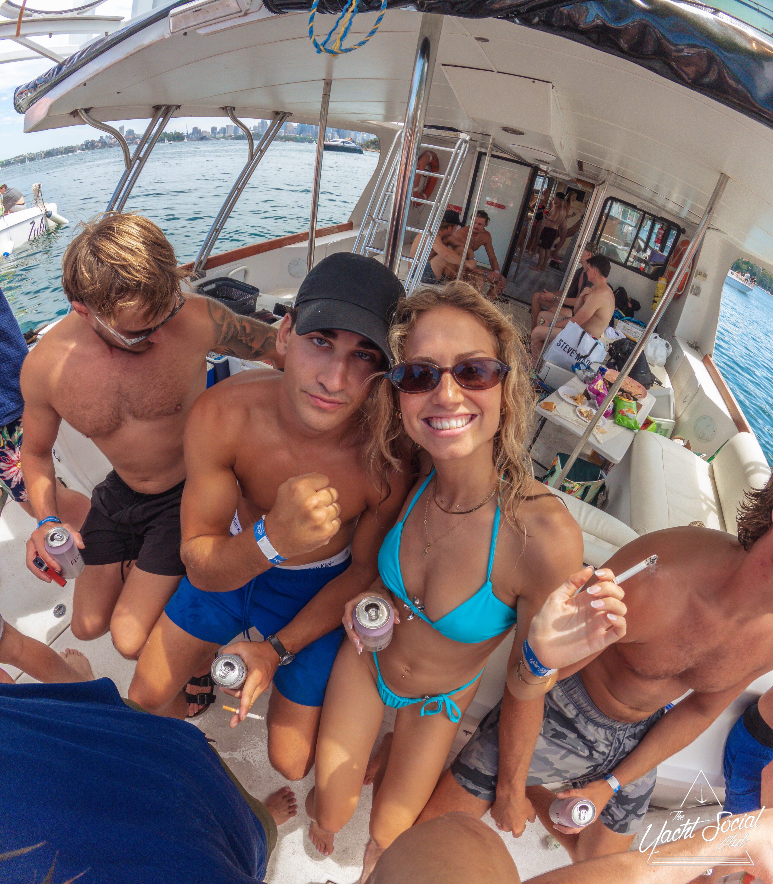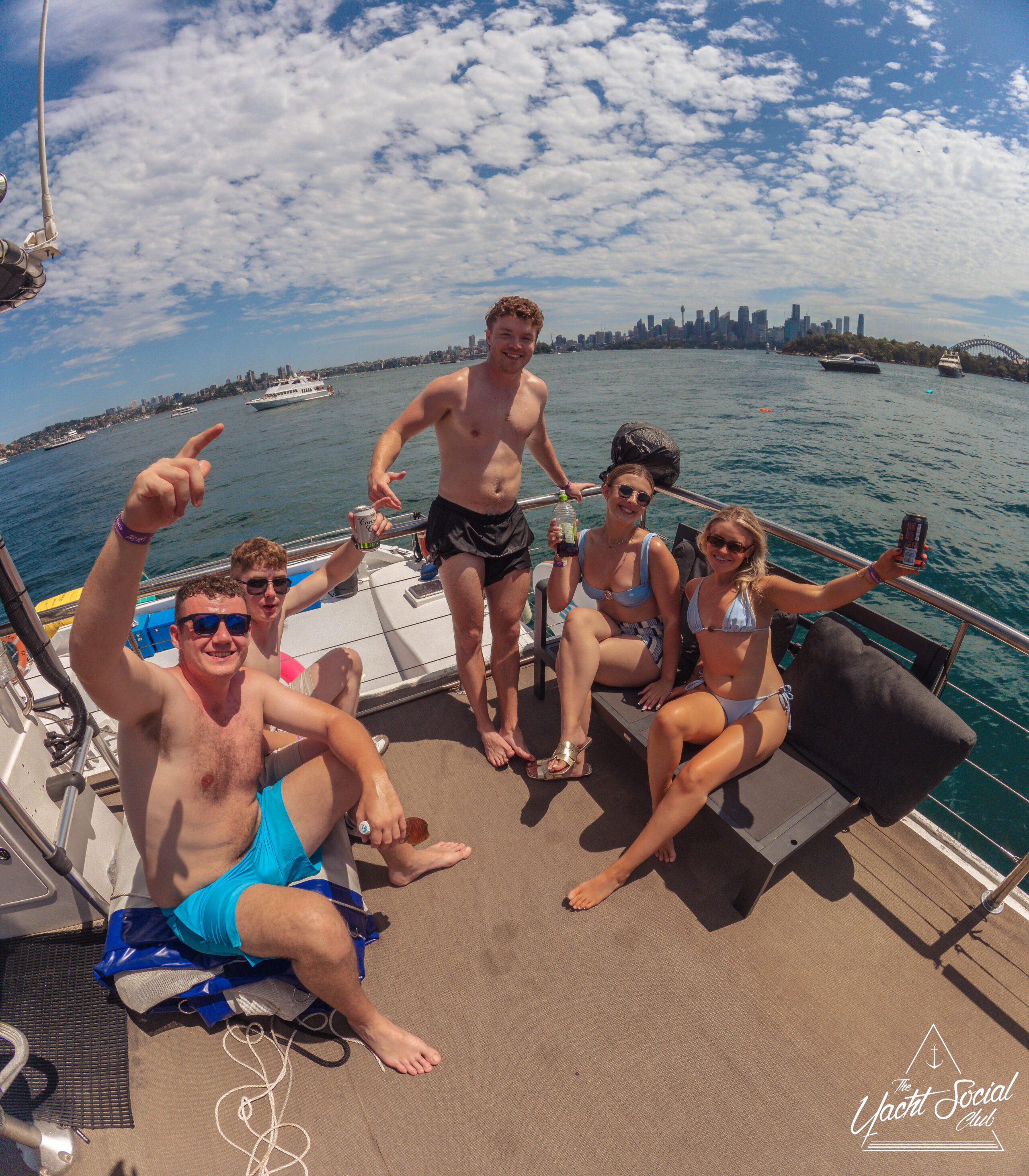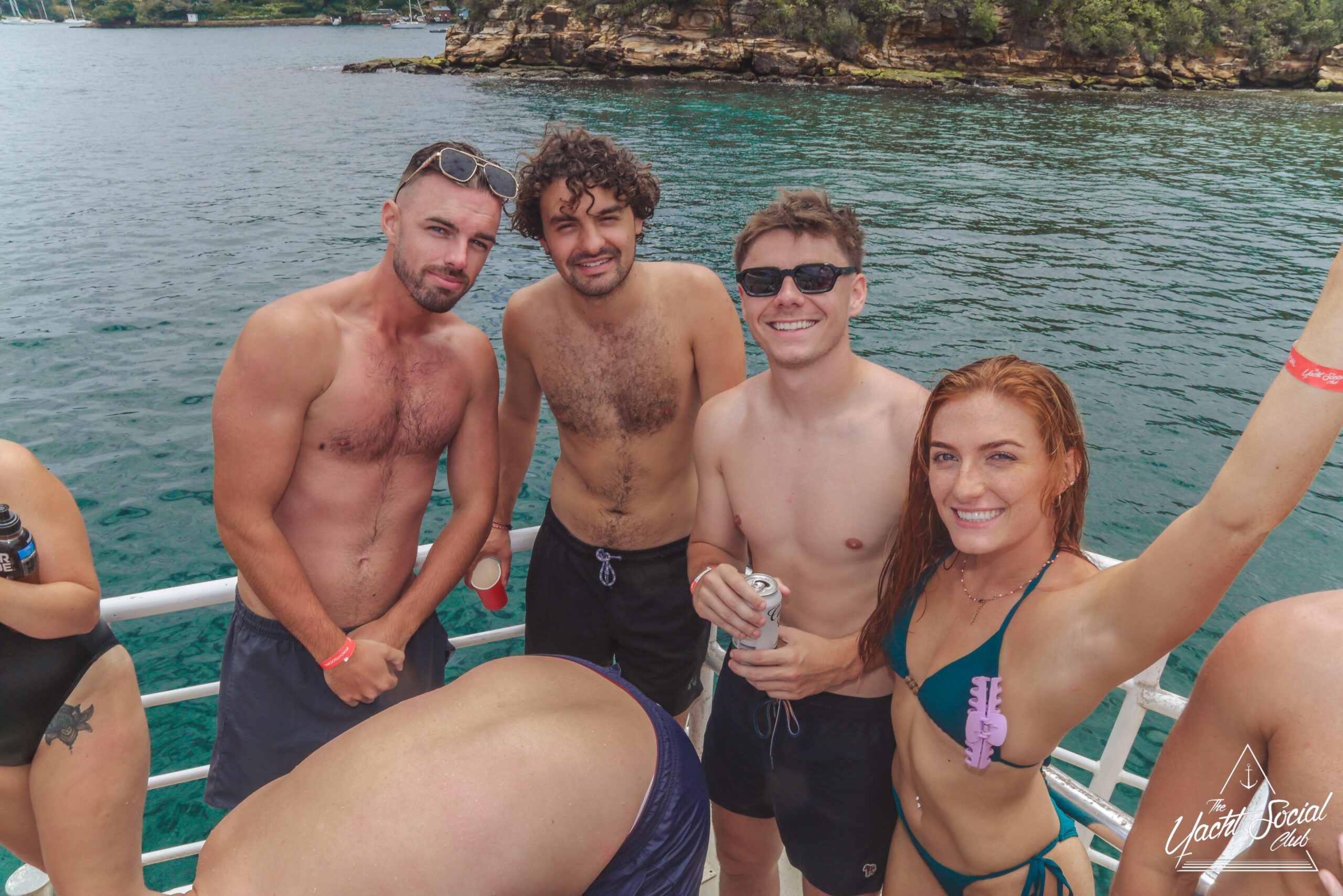 Five young adults in swimsuits smile for a group photo on a boat during a lively yacht party, with more people, boats, and blue skies visible in the background. Some are holding drinks, and the mood is festive and fun.