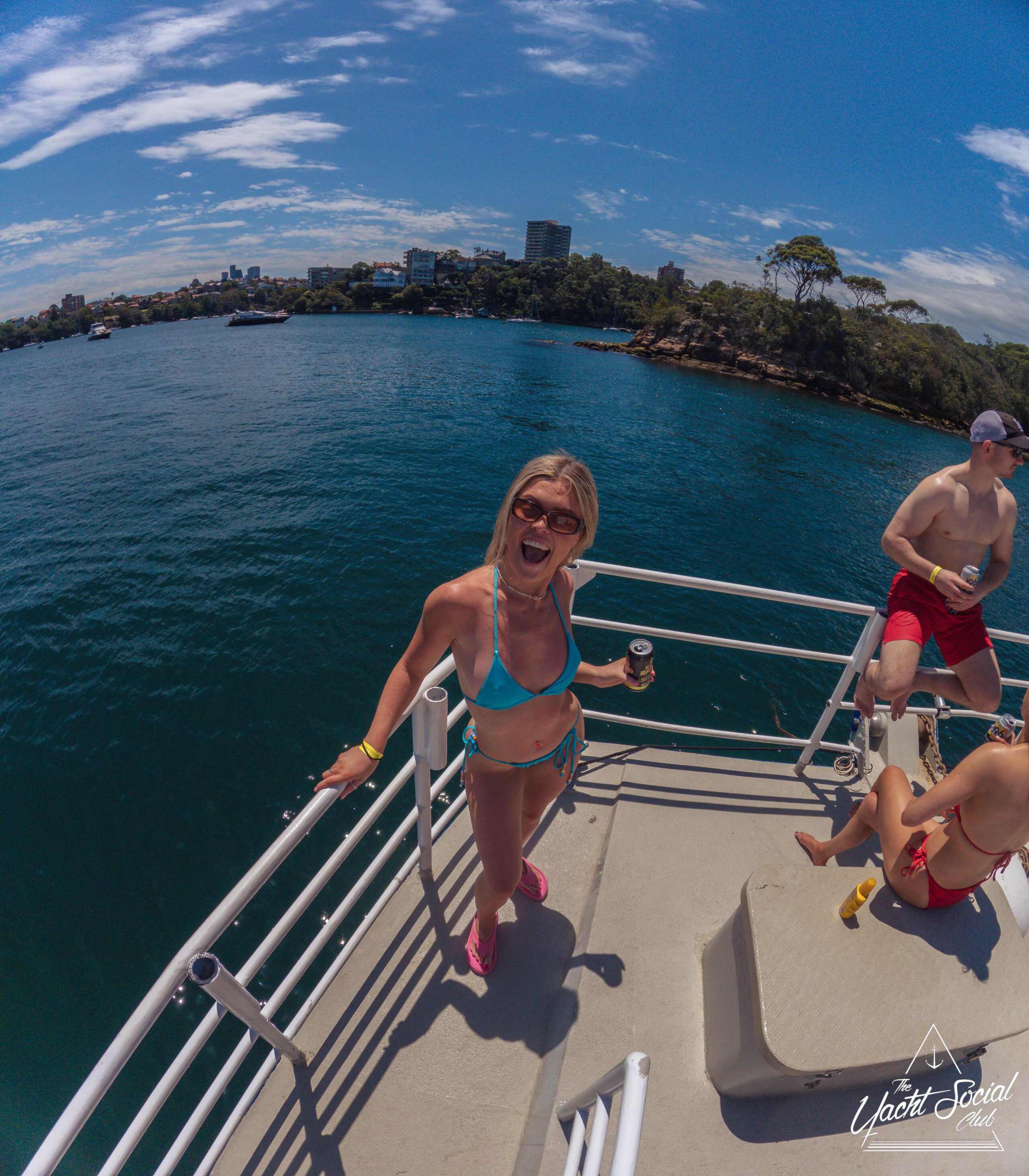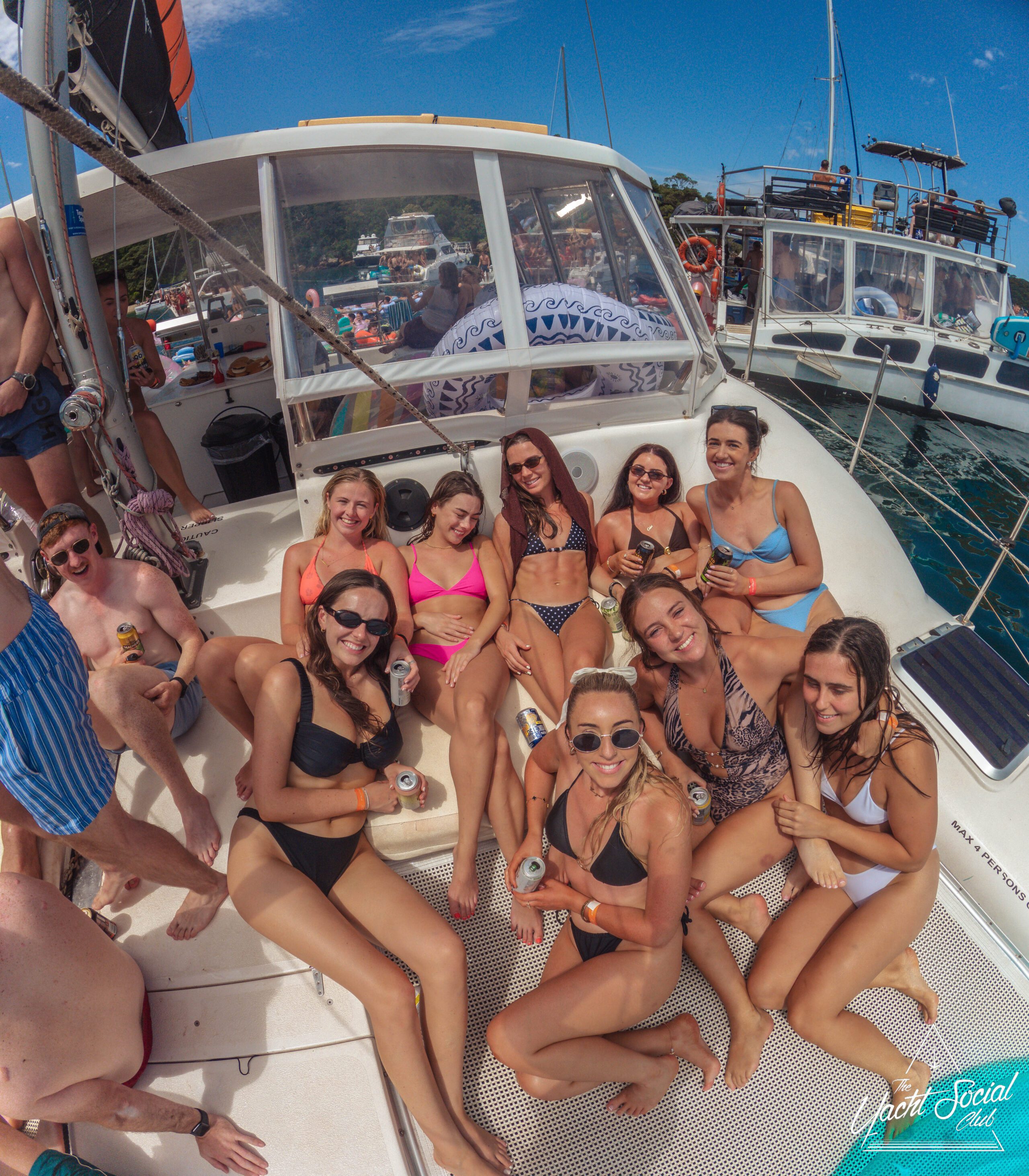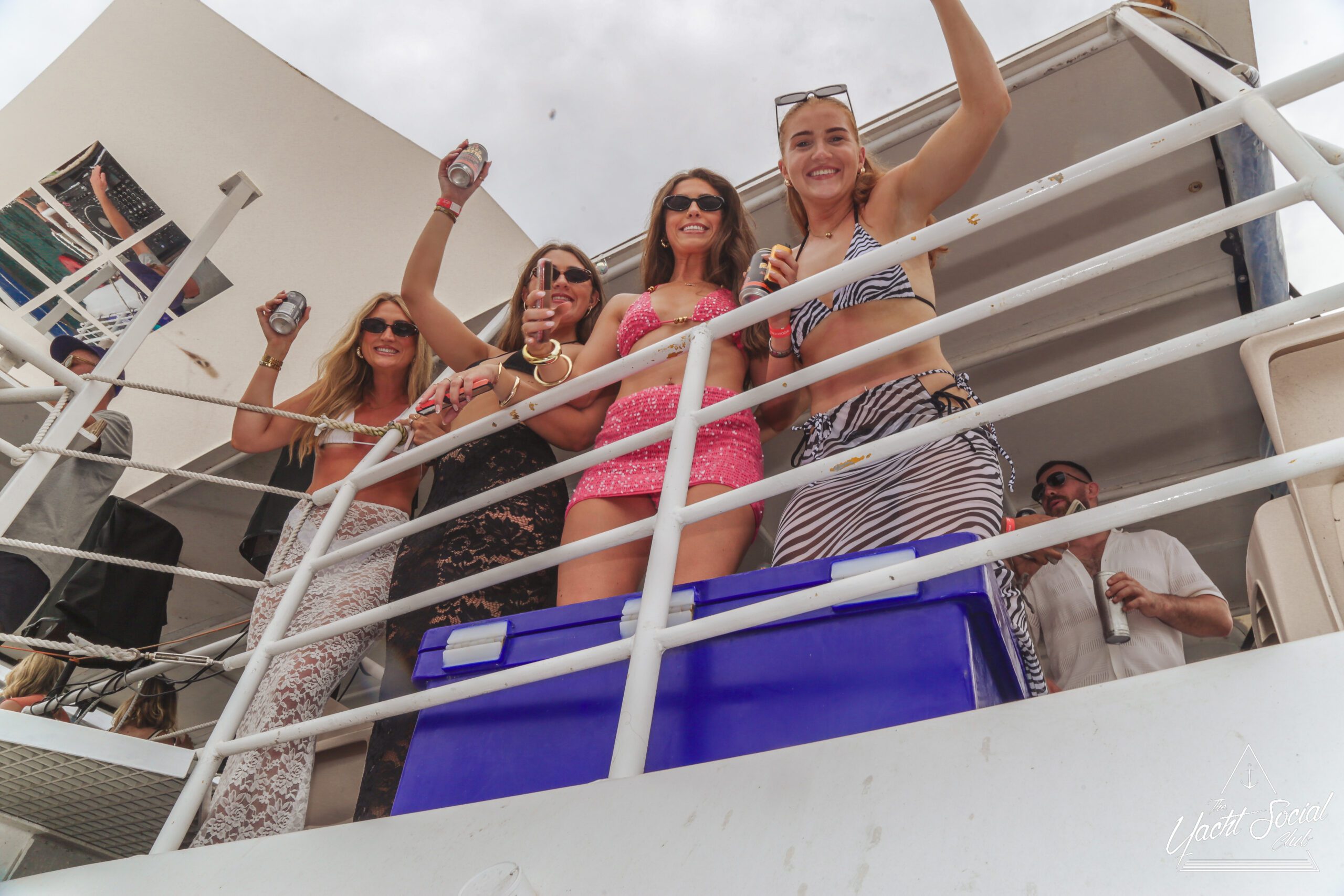Four women in bikinis smiling and holding drinks pose together on a boat under a sunny sky, with water, boats, and blue sky visible in the background. A "Yacht Social" logo is in the bottom right corner.