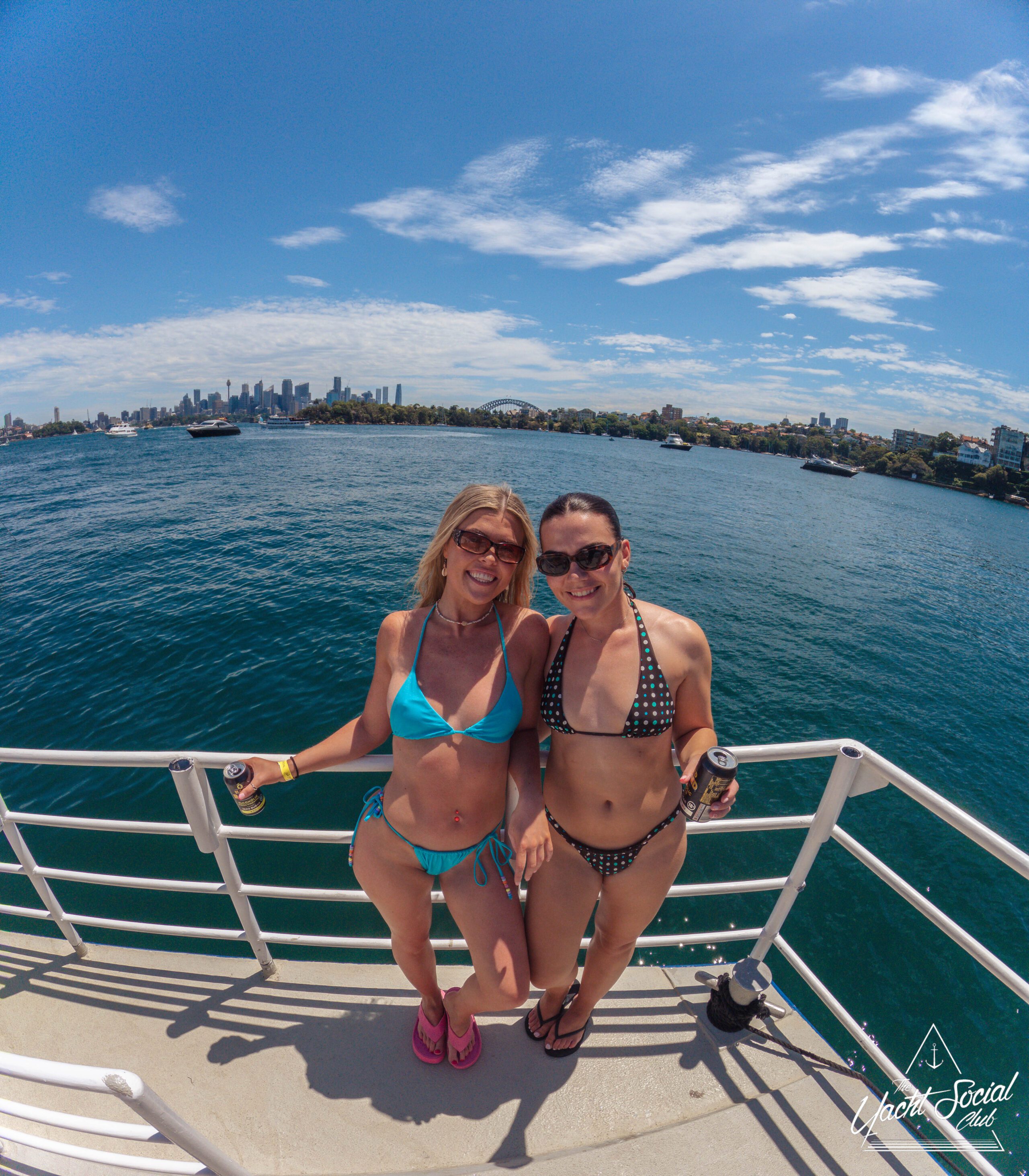 Two women in bikinis smiling and holding drinks stand on the deck of a boat with blue water and a city skyline in the background under a sunny sky.