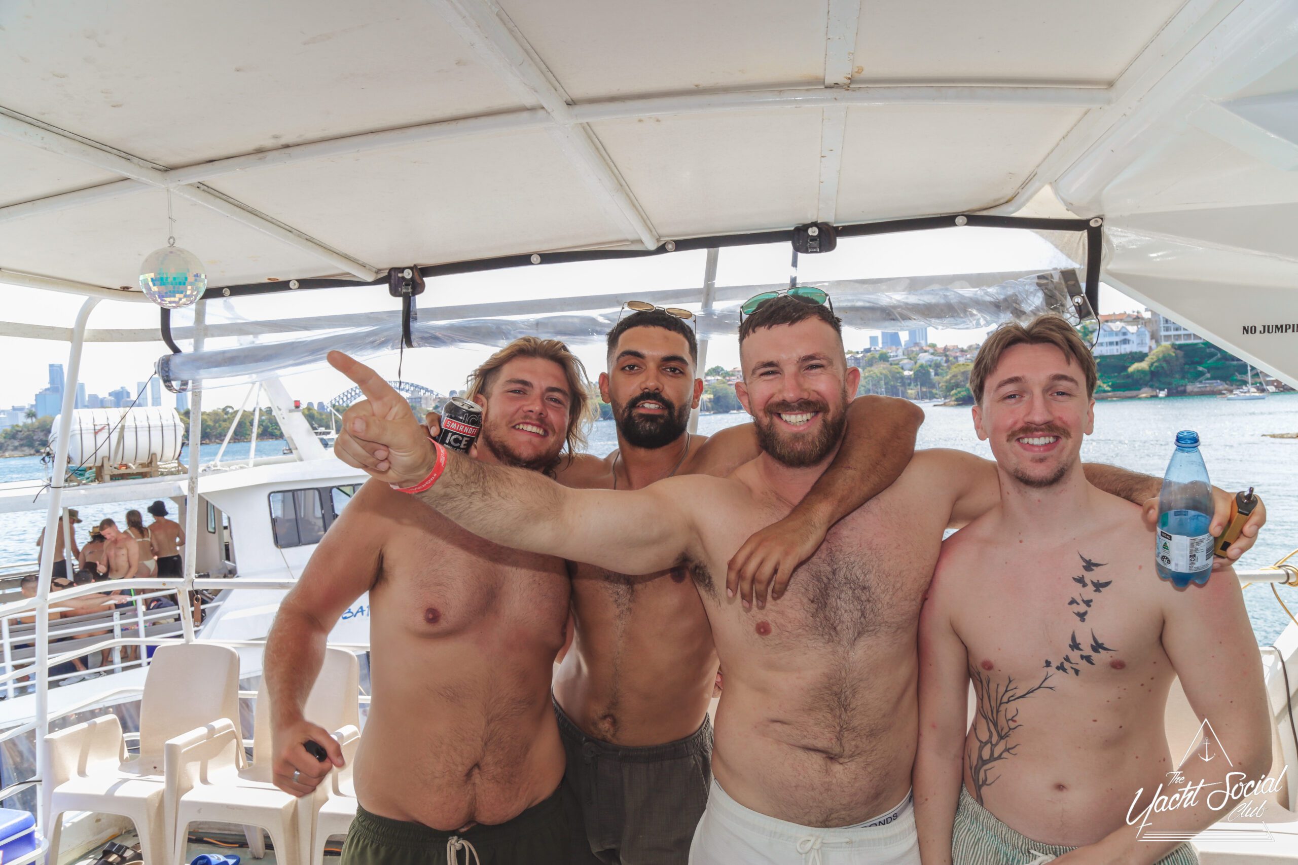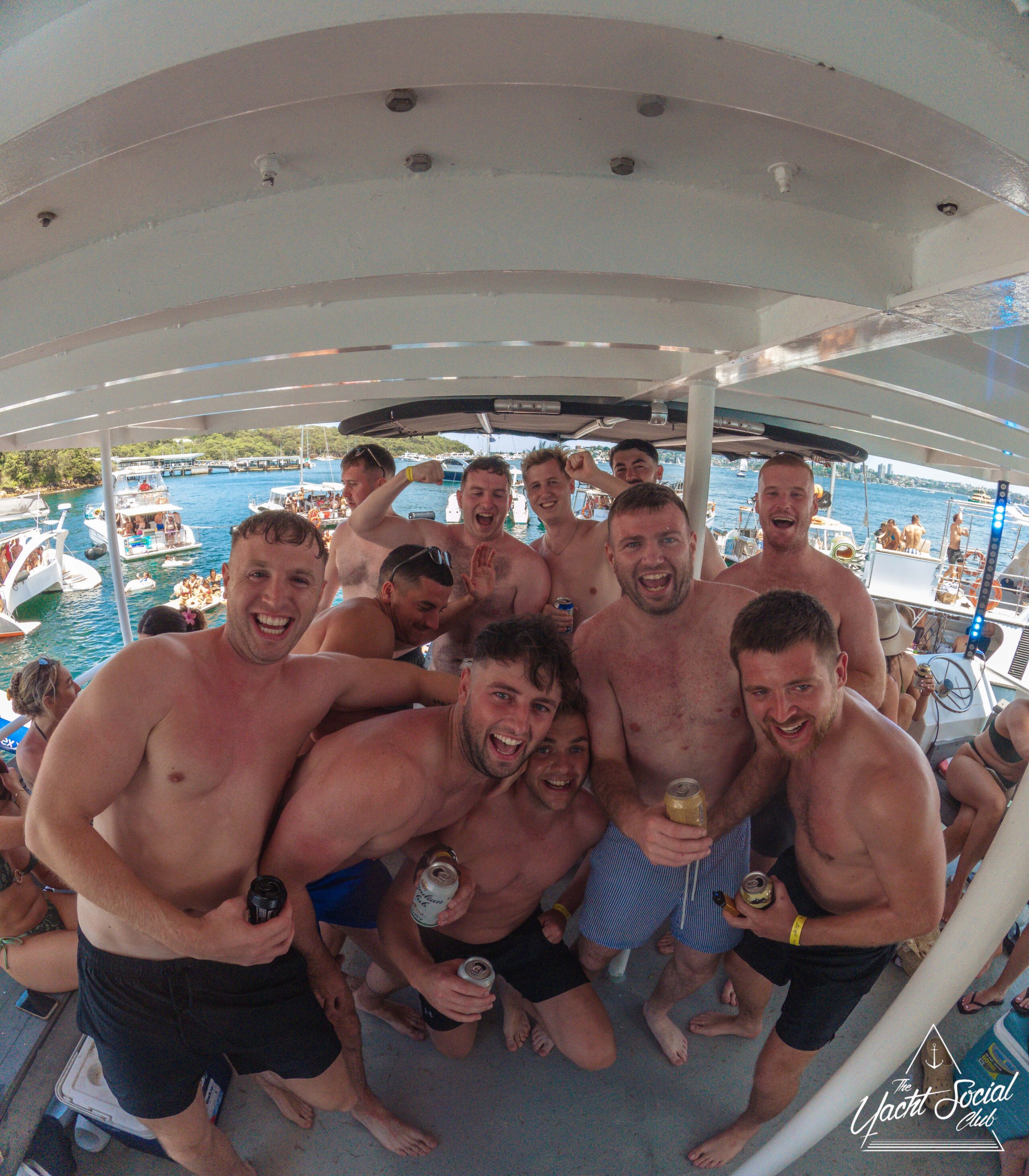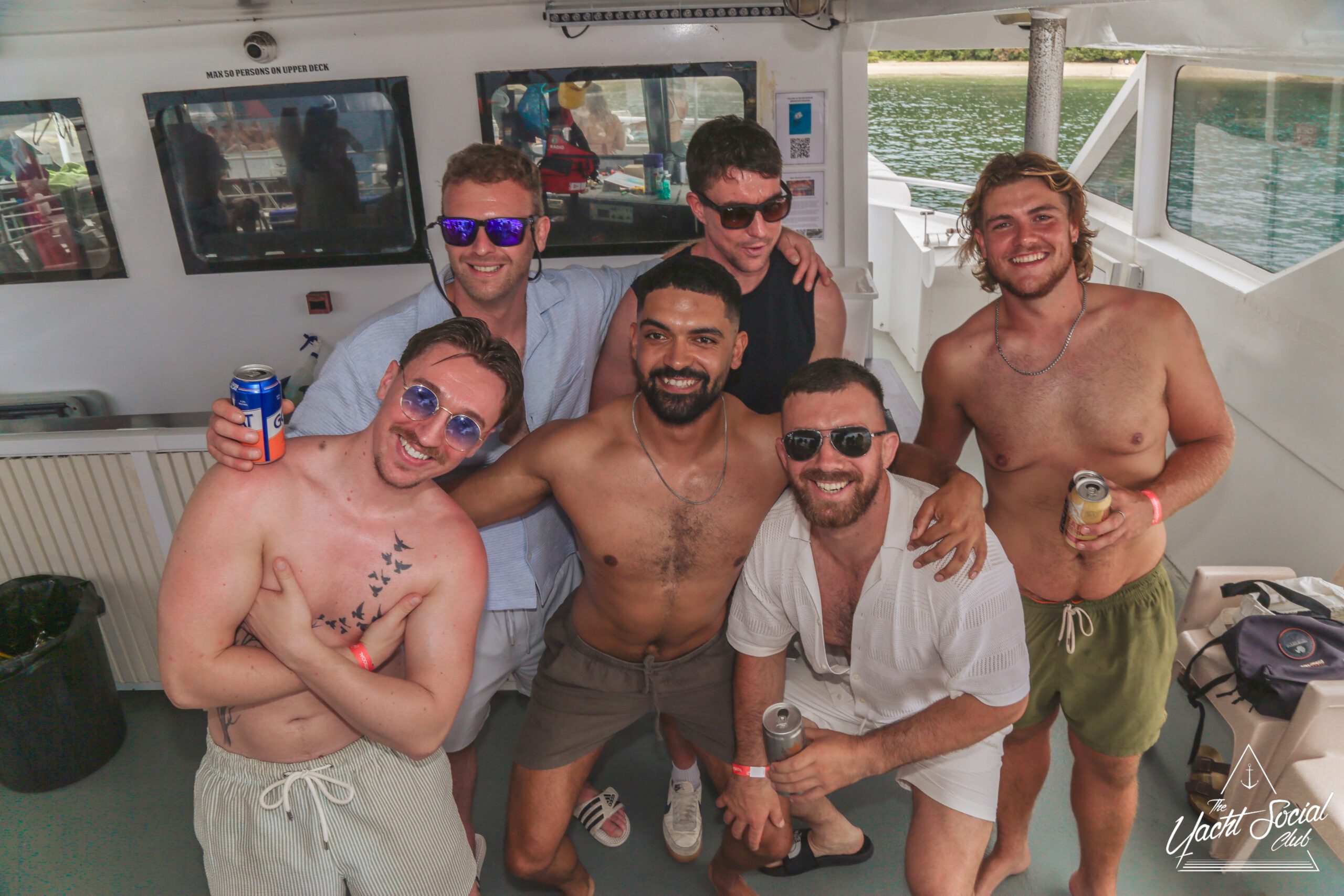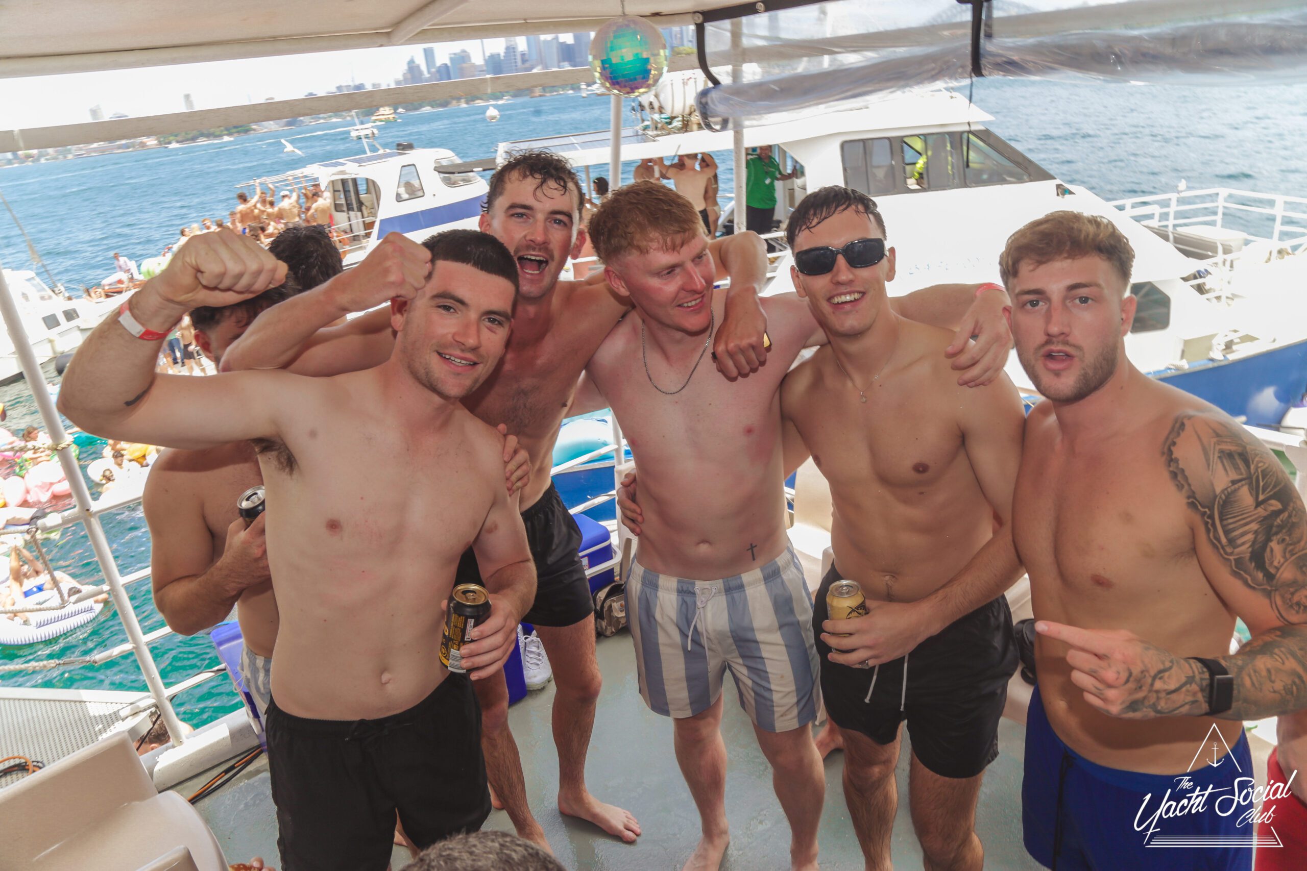 A group of shirtless men smile and pose with drinks on a crowded party boat, with other boats and people visible in the water behind them on a sunny day.