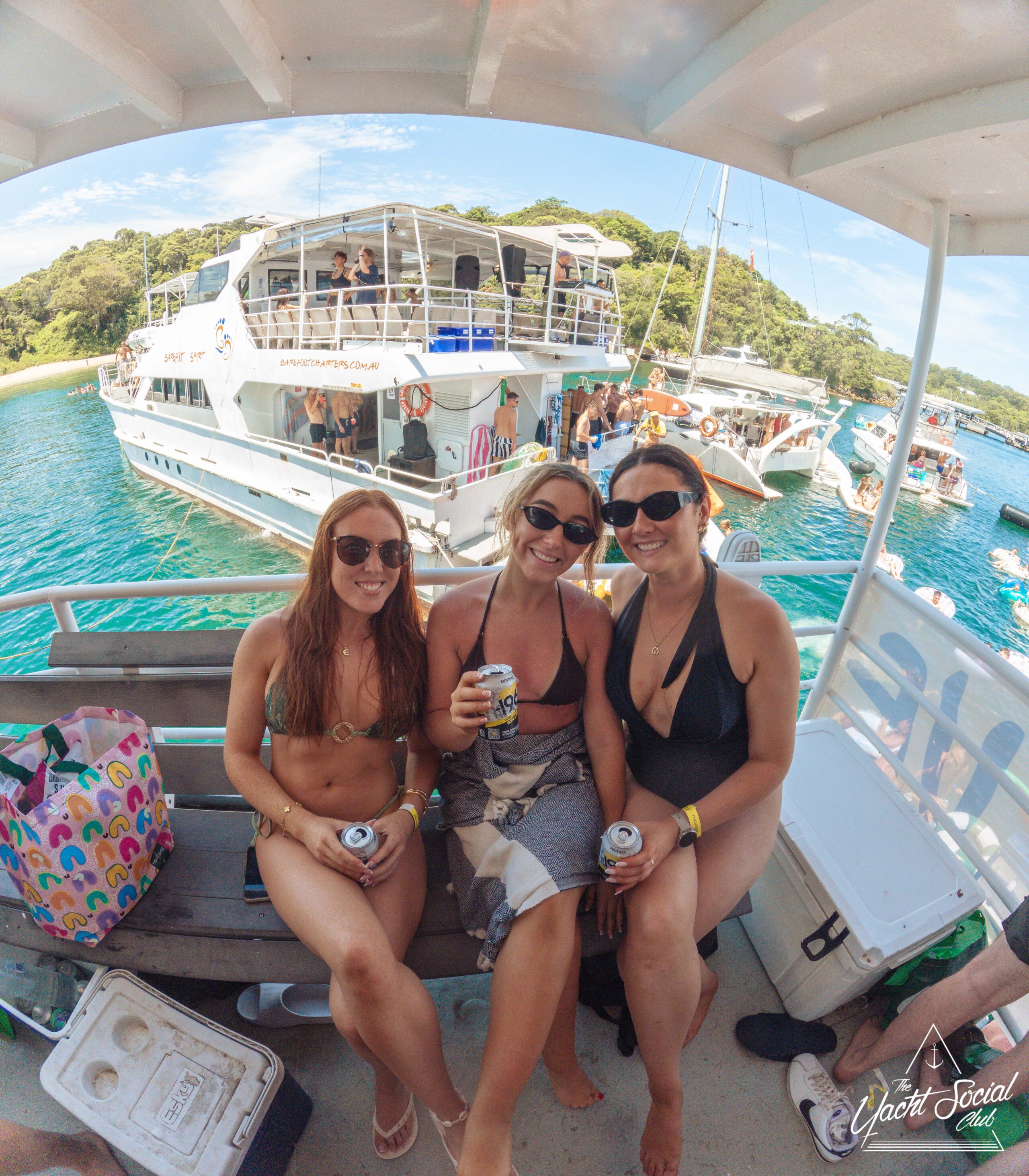 Three women in swimsuits smile and pose with drinks on a boat, surrounded by other people and boats on clear blue water under a sunny sky; a festive, summery atmosphere.