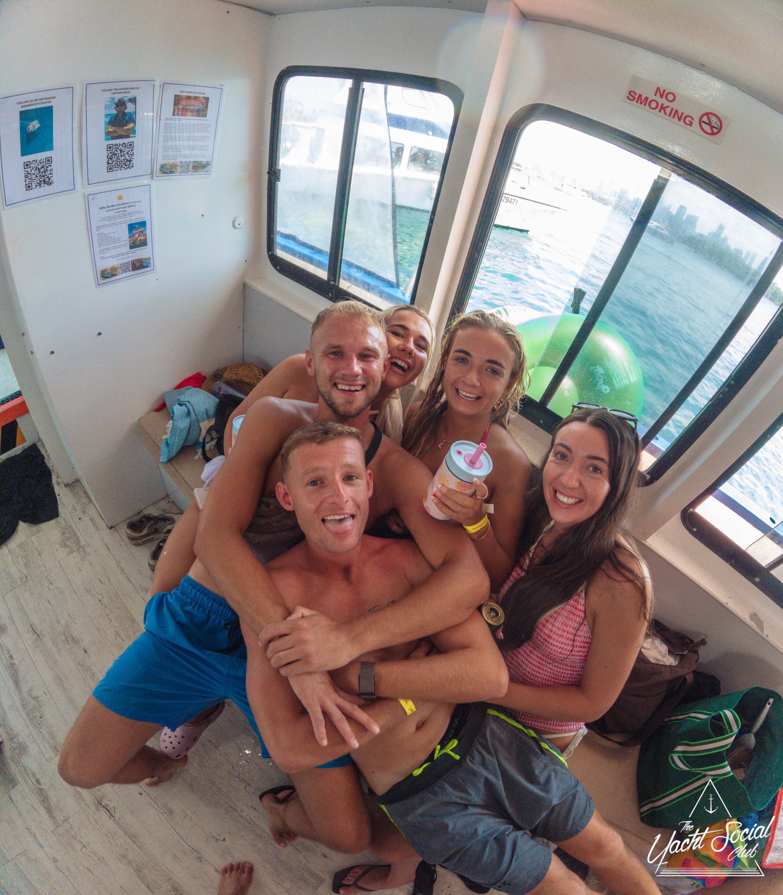 Five smiling young adults in swimsuits pose closely together inside a boat, with water and another boat visible through the window. One person holds a drink. The atmosphere is casual and joyful.
