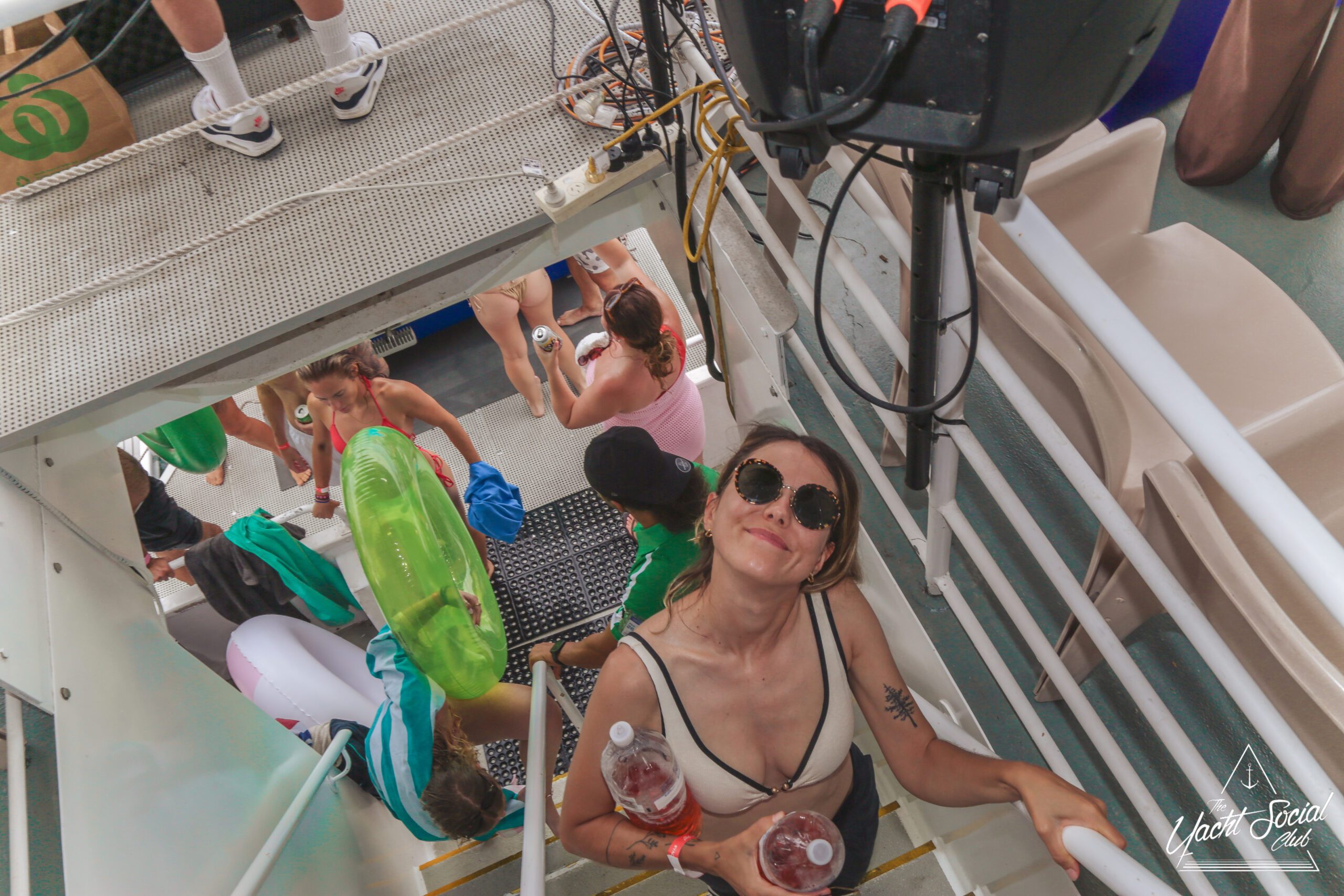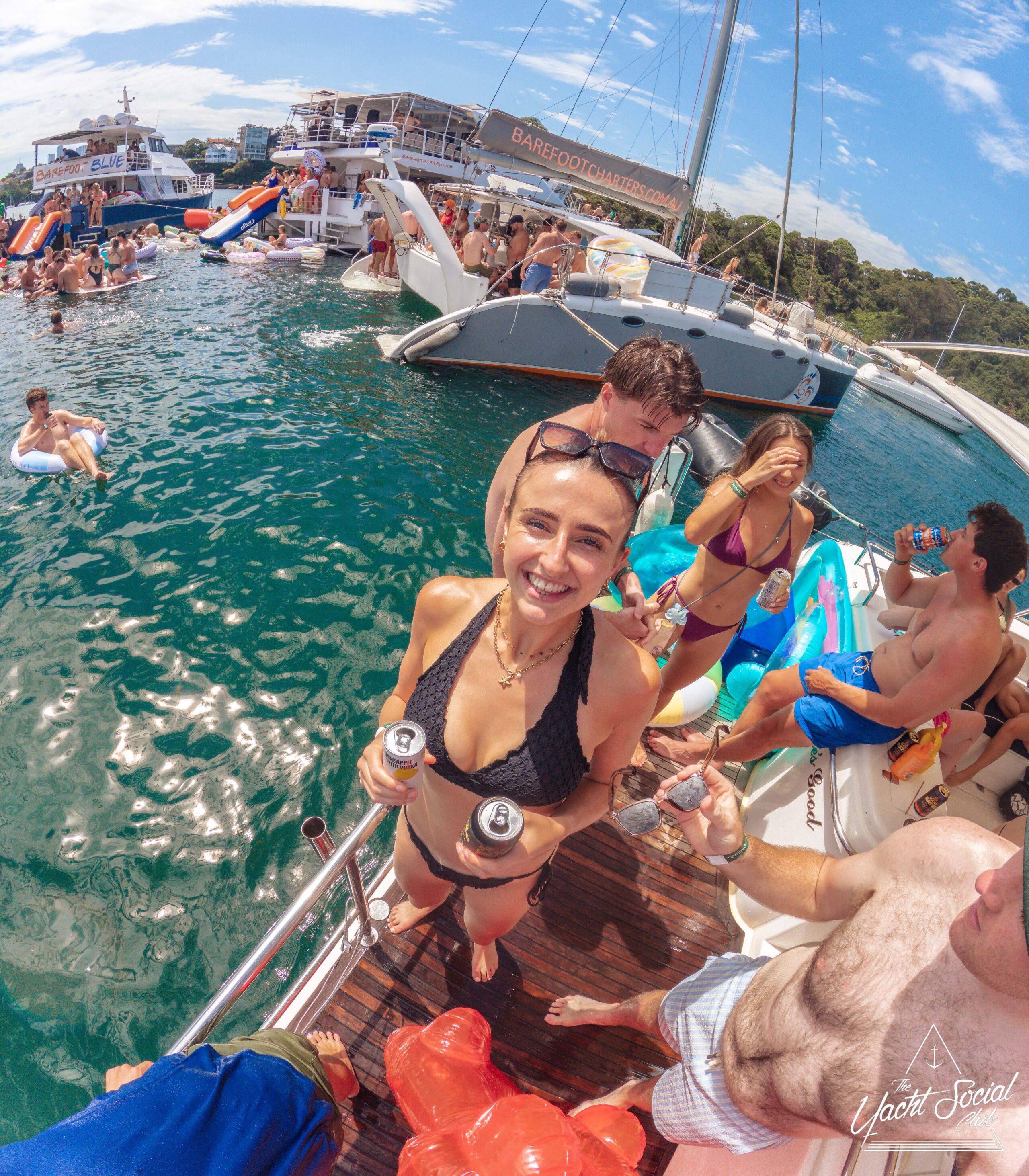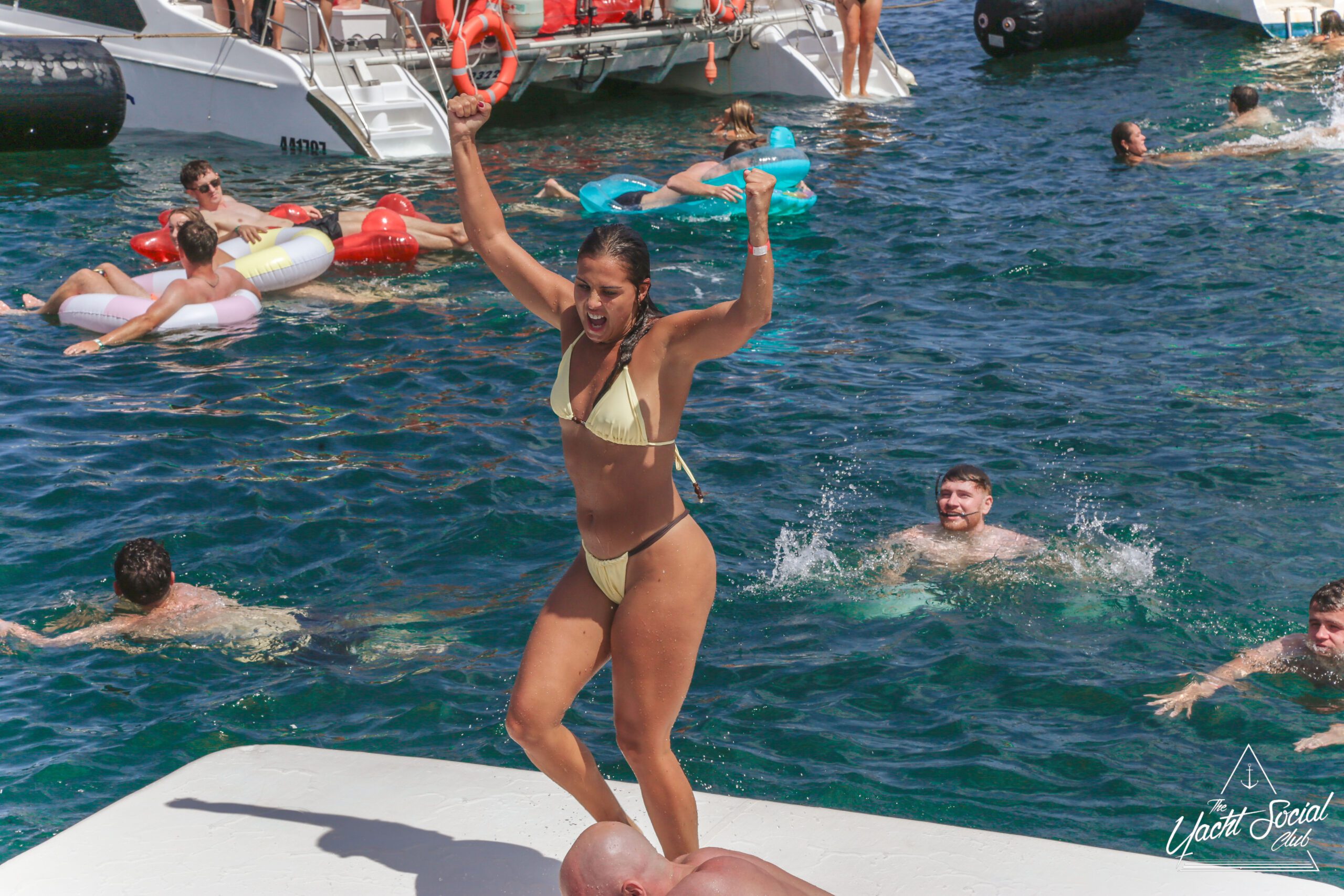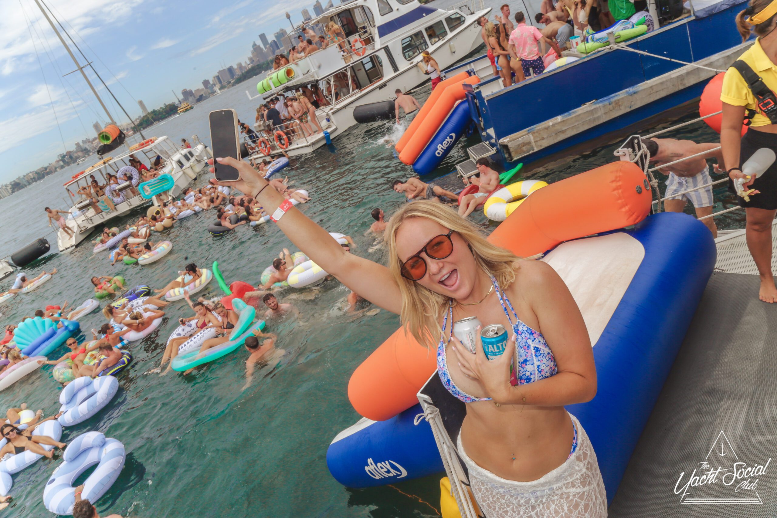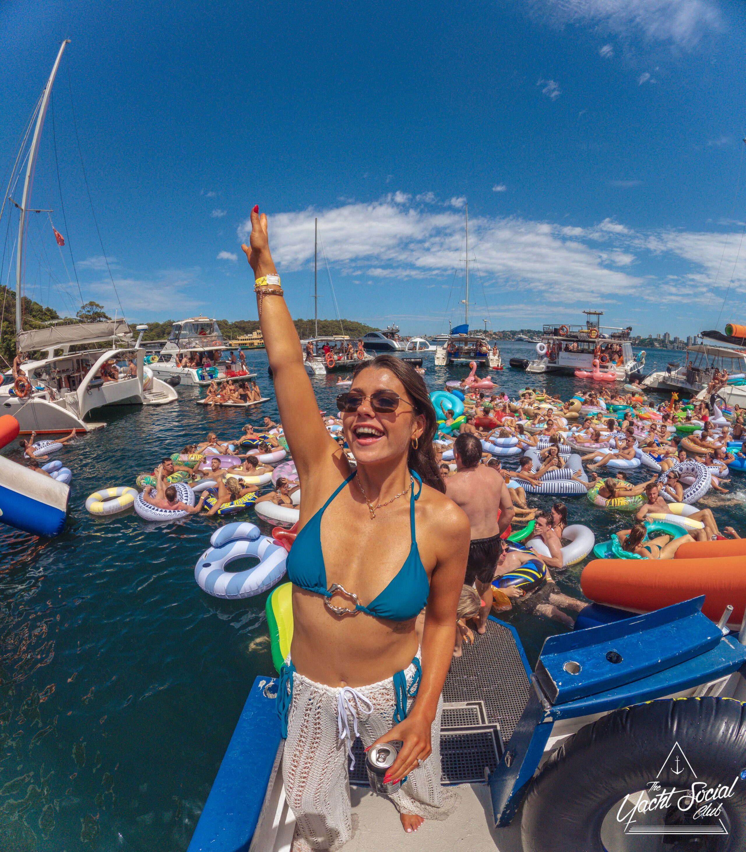 A woman in a black bikini smiles and raises her arm while holding a drink at a lively boat party. People swim and float on inflatables in blue water, with boats and more partygoers in the background.