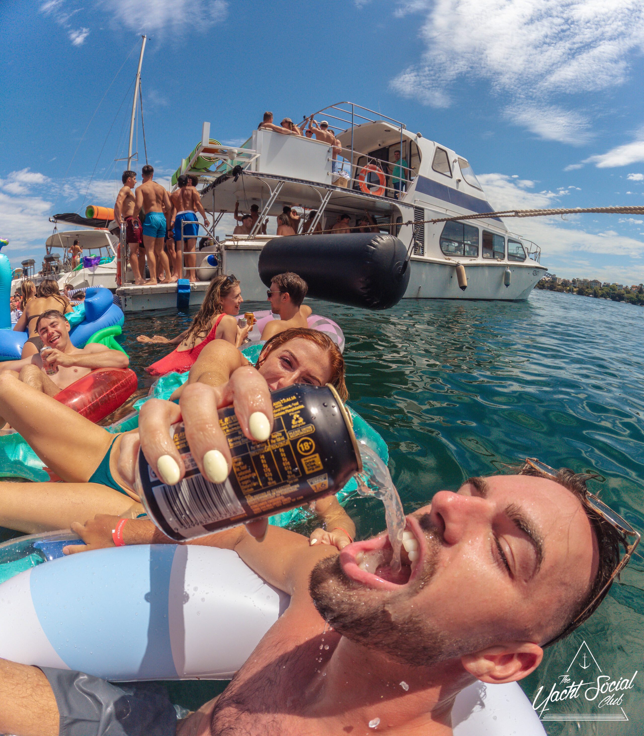 A man on a float pours a drink into his mouth from a can while lounging with friends on colorful inflatables in the water; a party boat with more people is seen in the background.