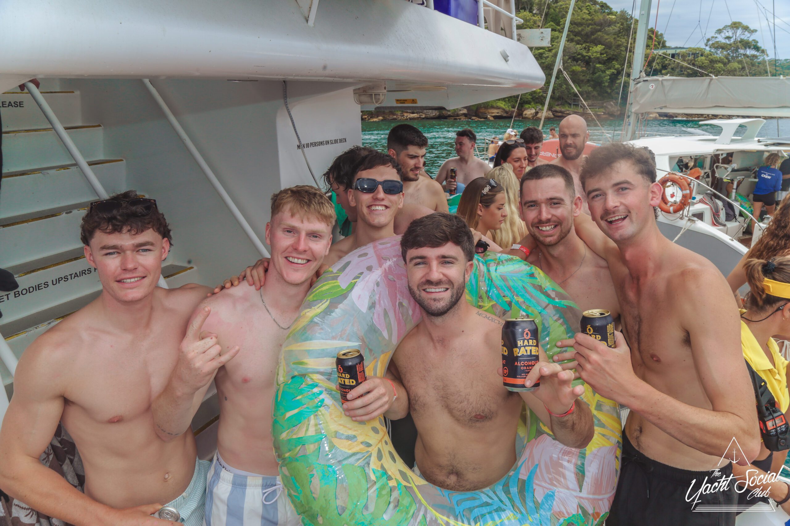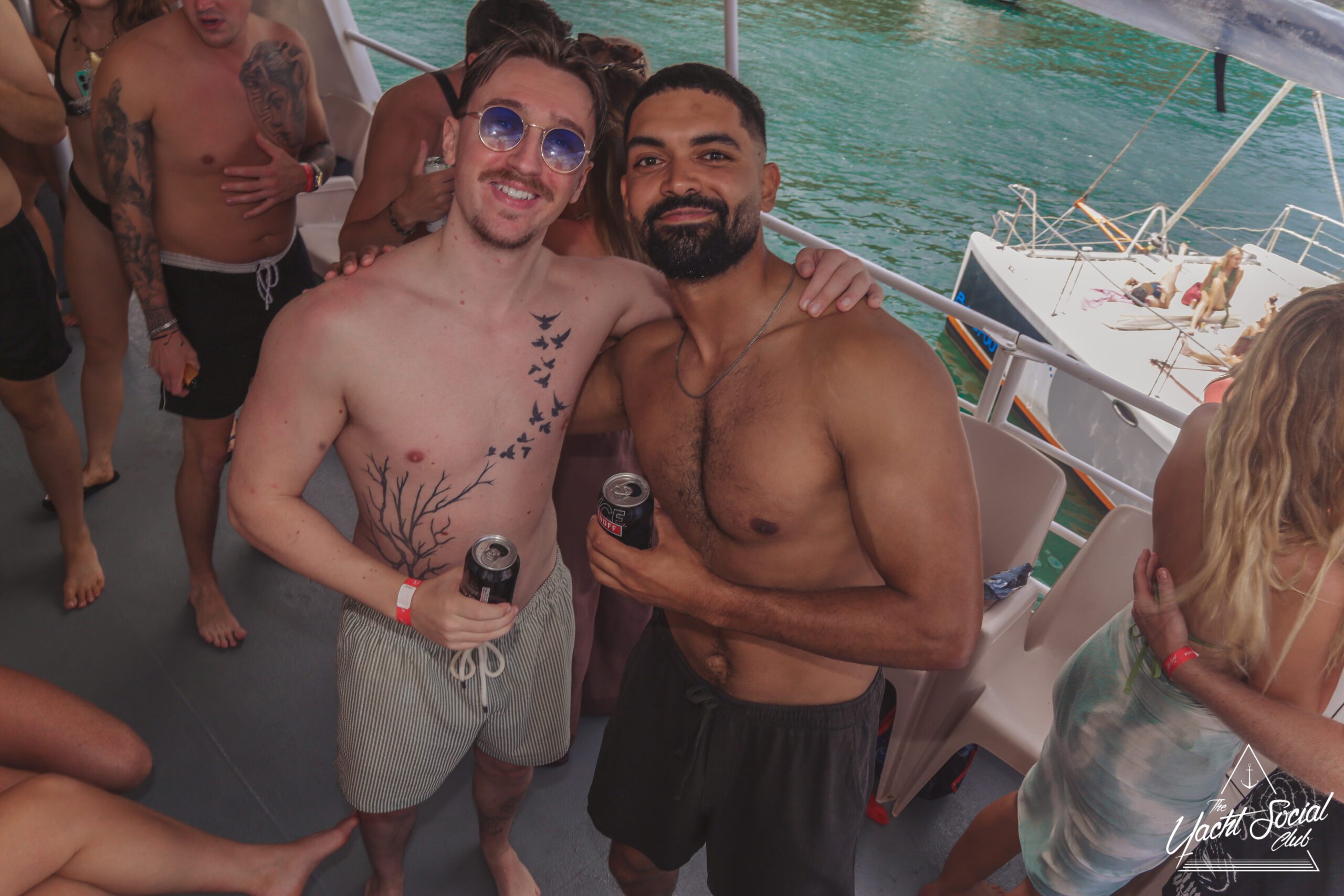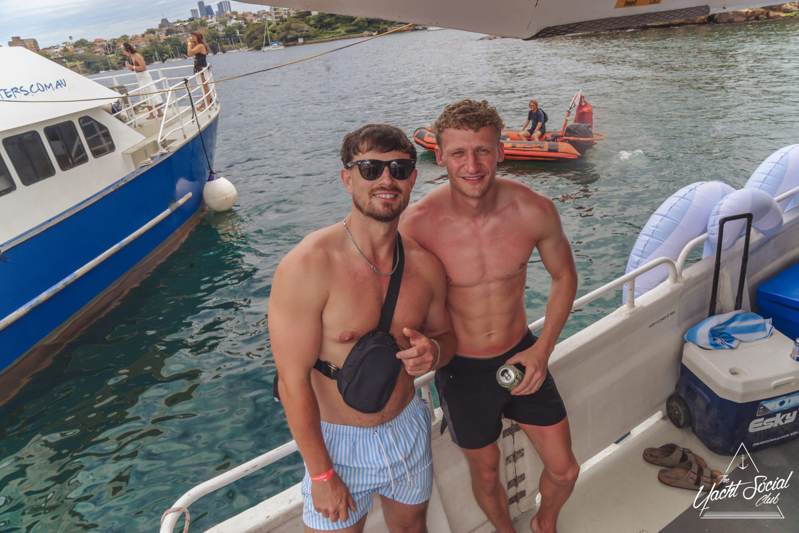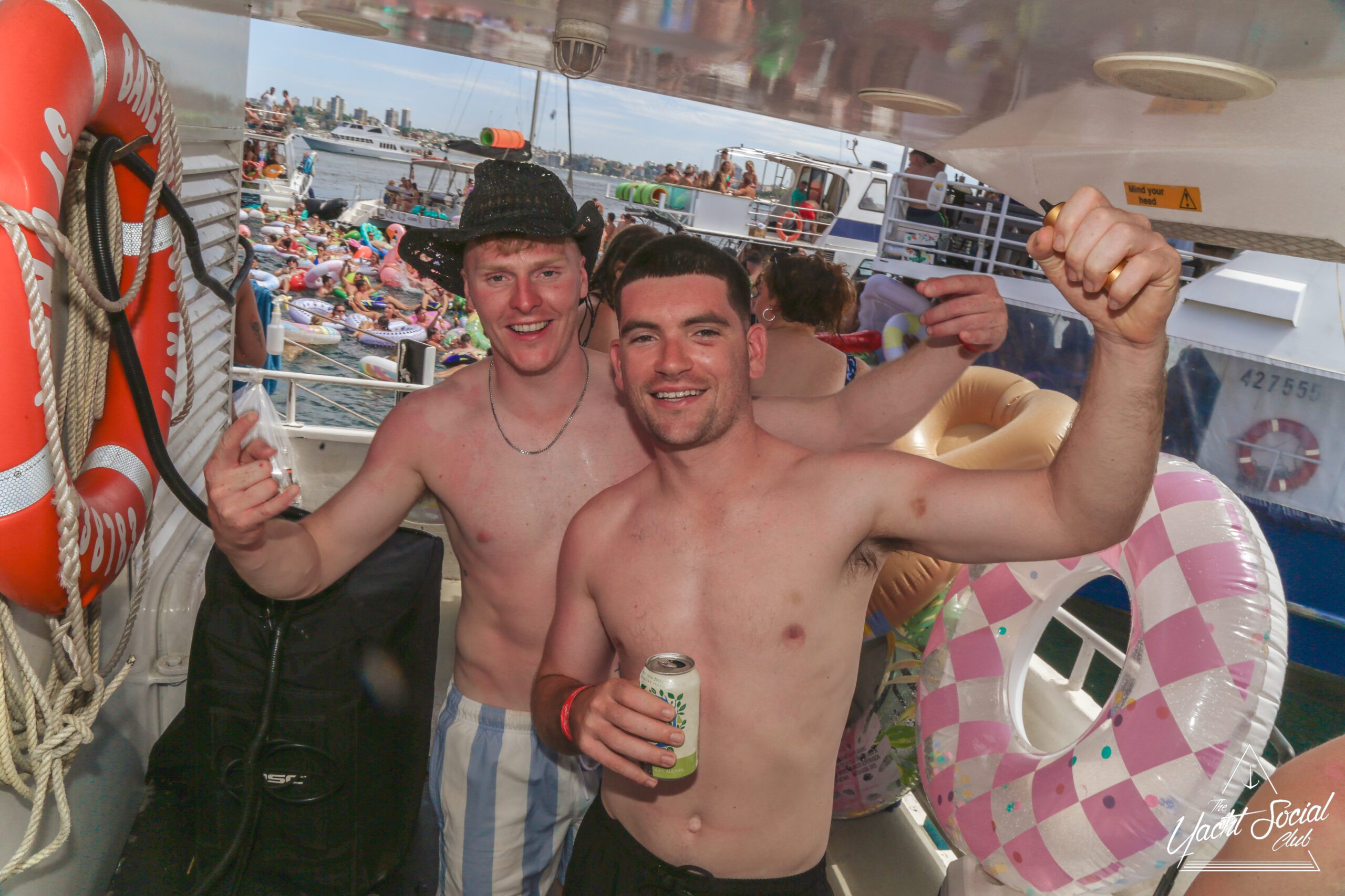 Two young men smile and pose with drinks at a lively boat party. Other people swim, lounge on inflatables, and gather on nearby boats under a bright blue sky. The atmosphere is festive and fun.