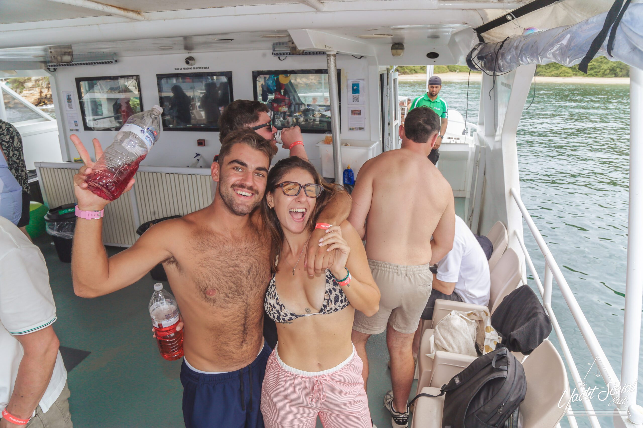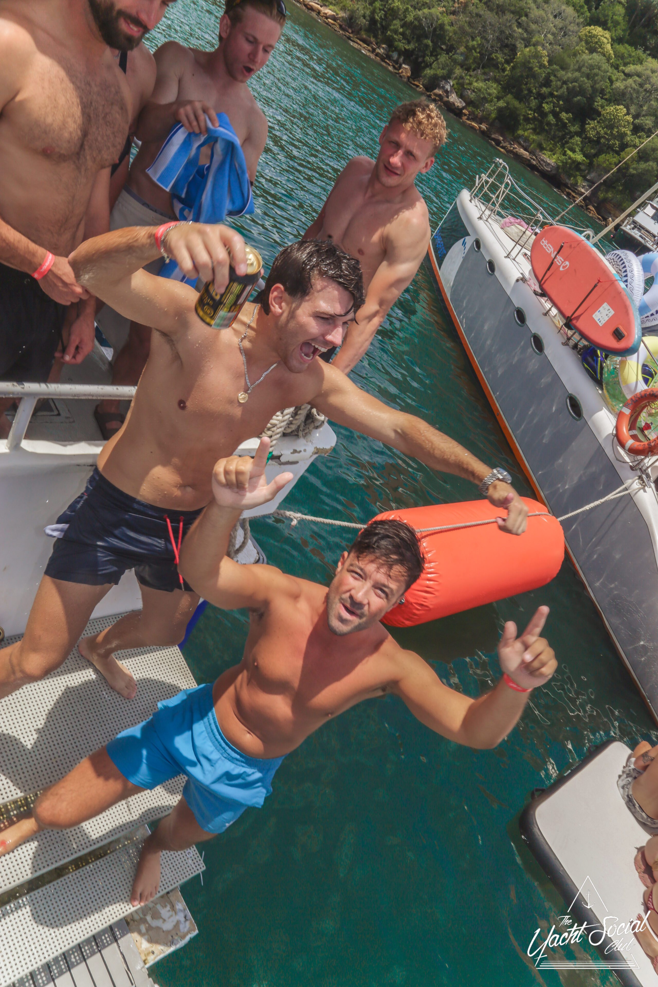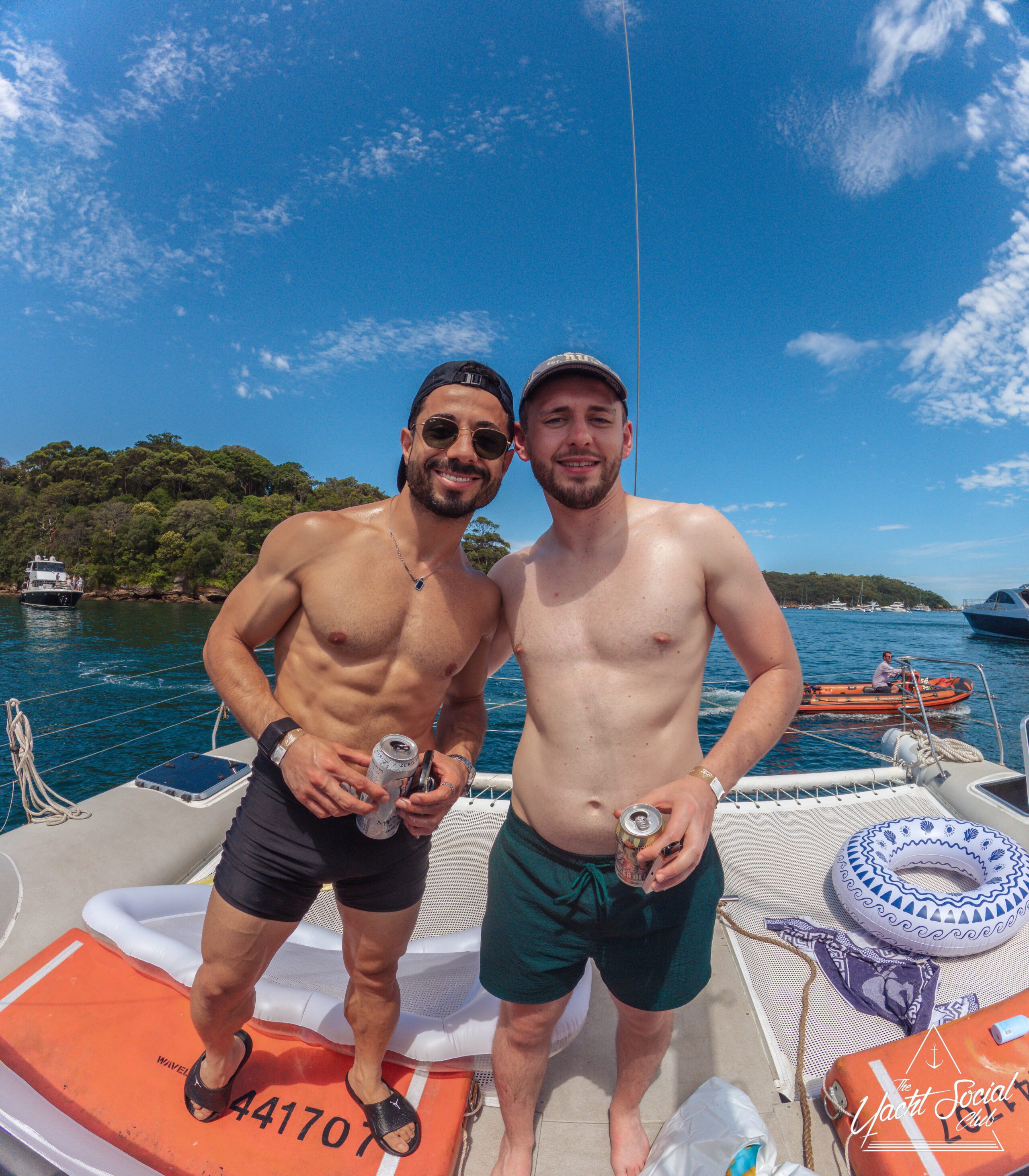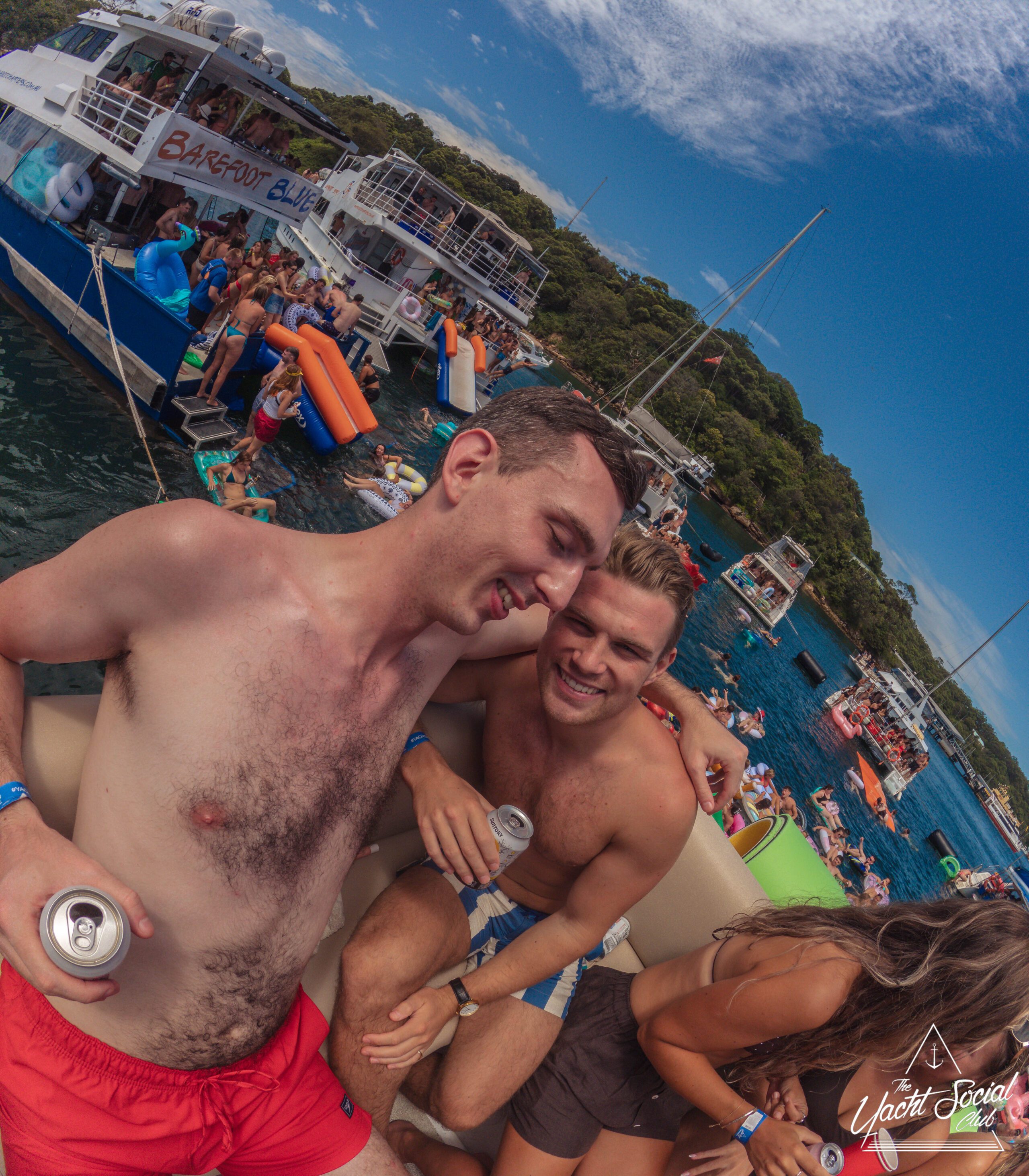 Two young men smile and pose with drinks at a lively boat party. Other people swim, lounge on inflatables, and gather on nearby boats under a bright blue sky. The atmosphere is festive and fun.