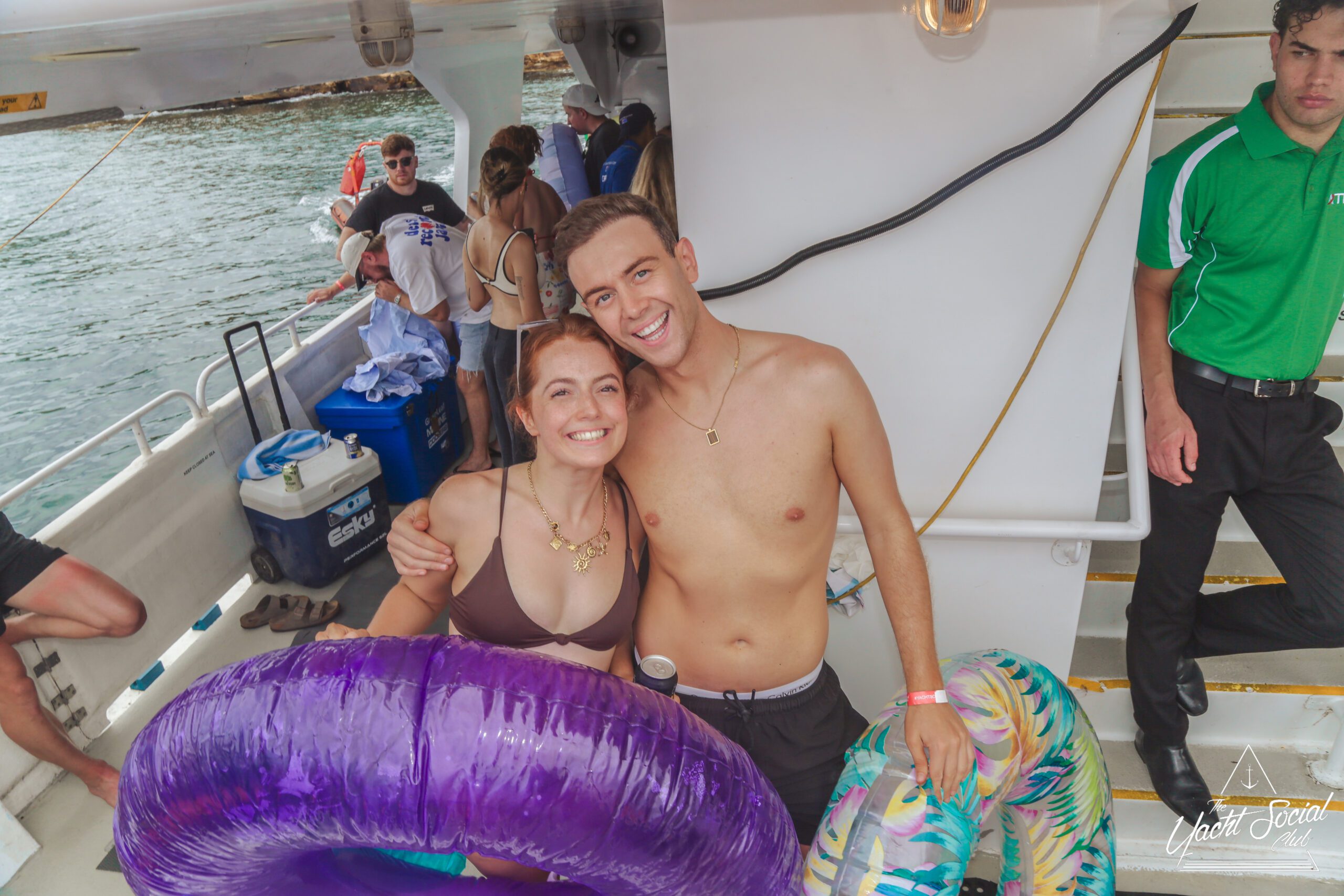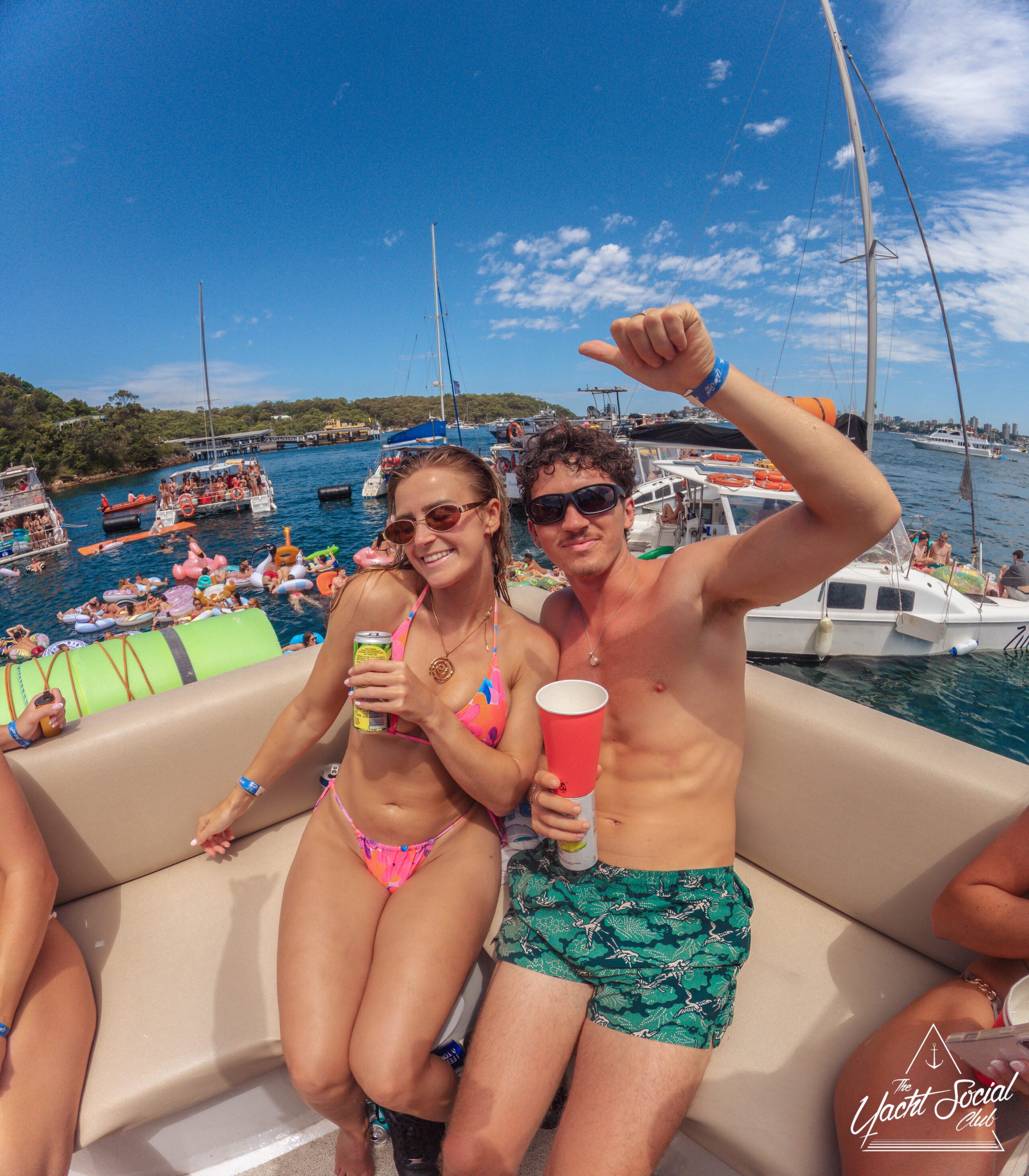 A smiling man and woman in swimwear hold drinks and pose for a photo on a boat, with people, other boats, and floaties visible in the water in the background. The mood is festive and summery.