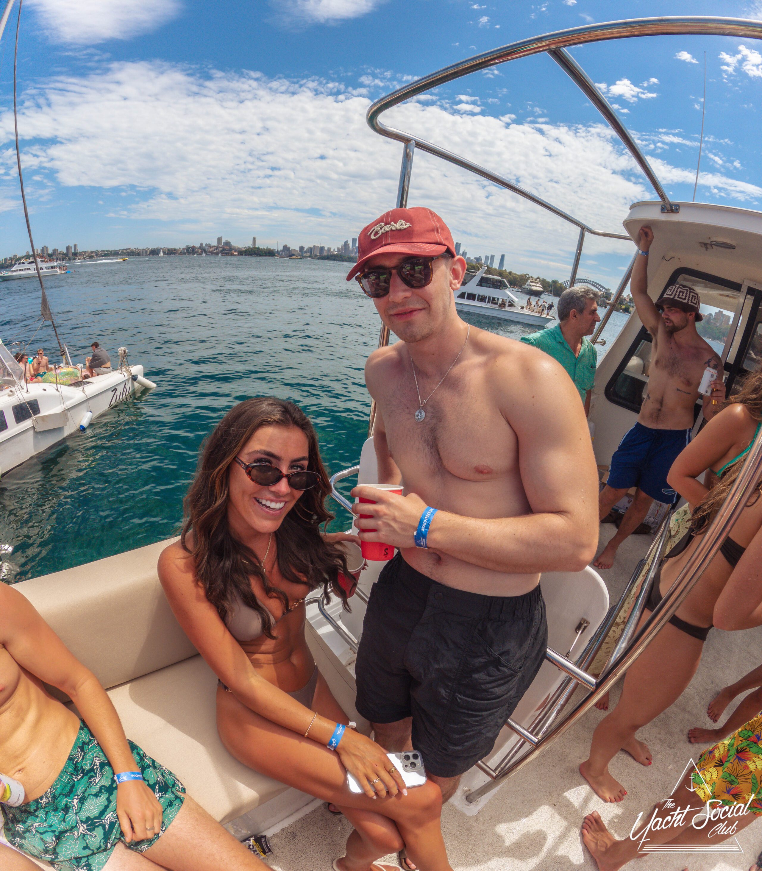 A group of young adults enjoy a sunny day on a boat. A smiling woman in sunglasses sits next to a man in a red cap holding drinks. Other people relax and socialize in swimwear, with water and boats in the background.
