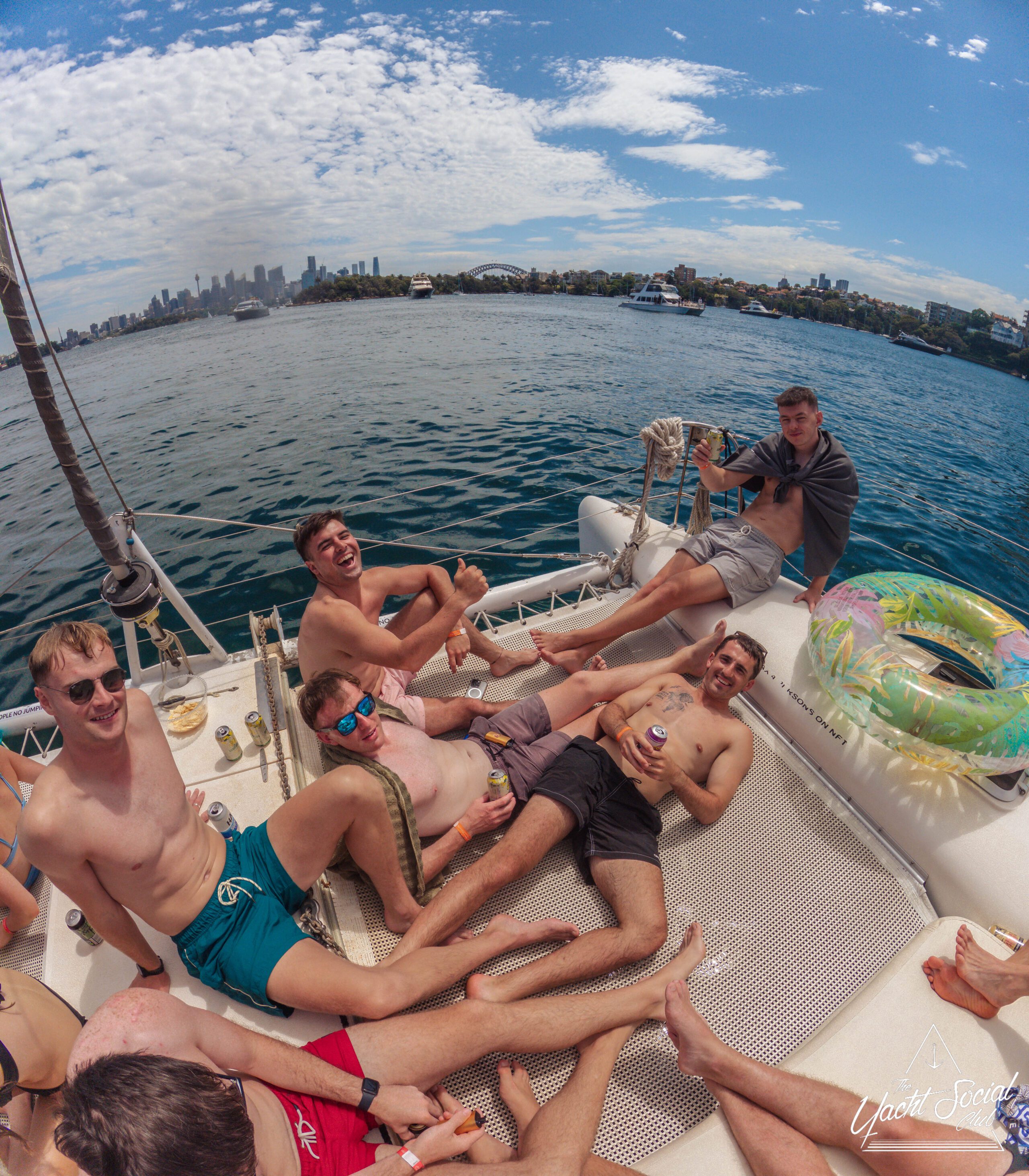 A group of young men relax shirtless on the netting of a catamaran, smiling and holding drinks. The boat floats on a harbor with a city skyline and blue sky with clouds in the background.