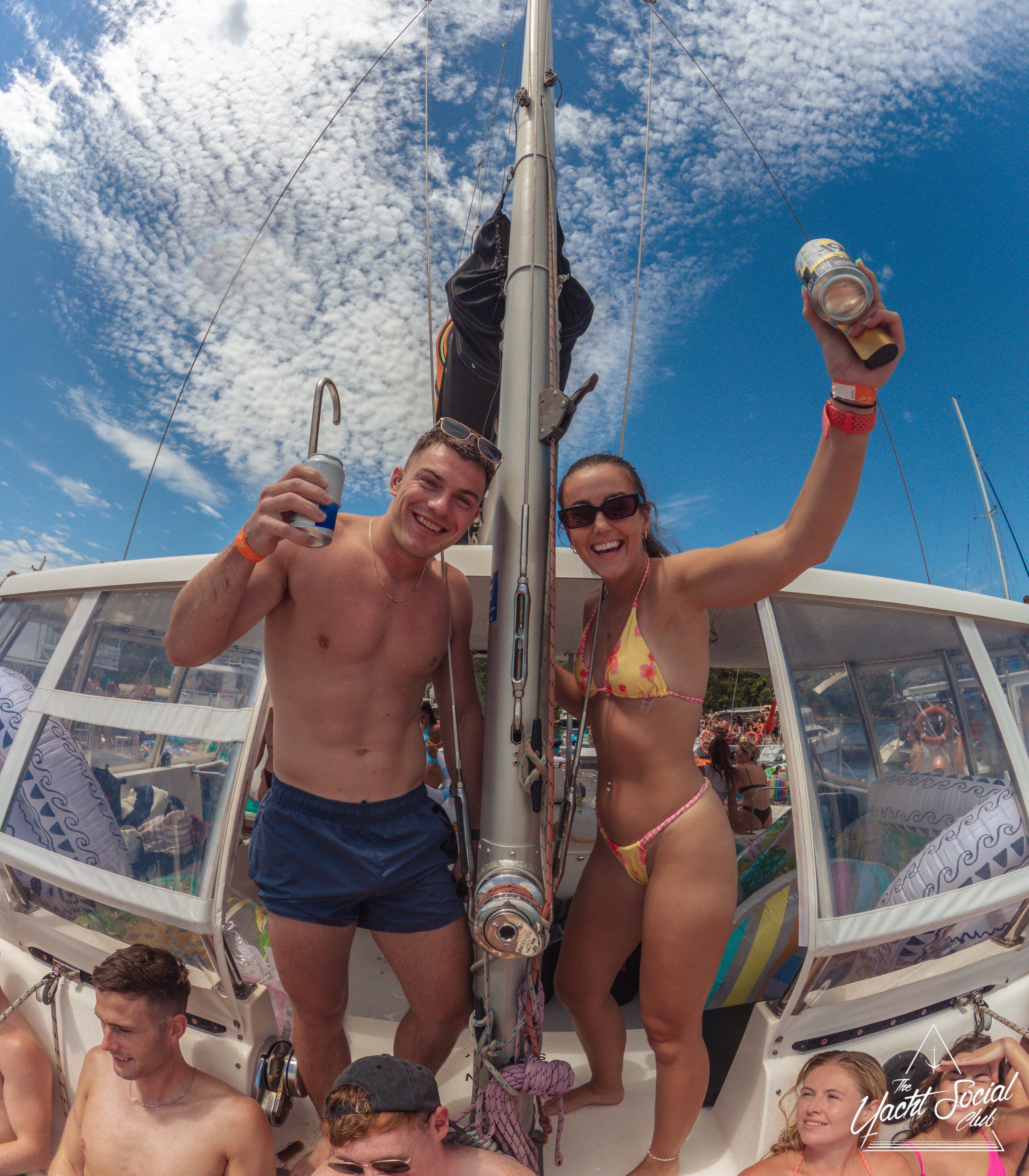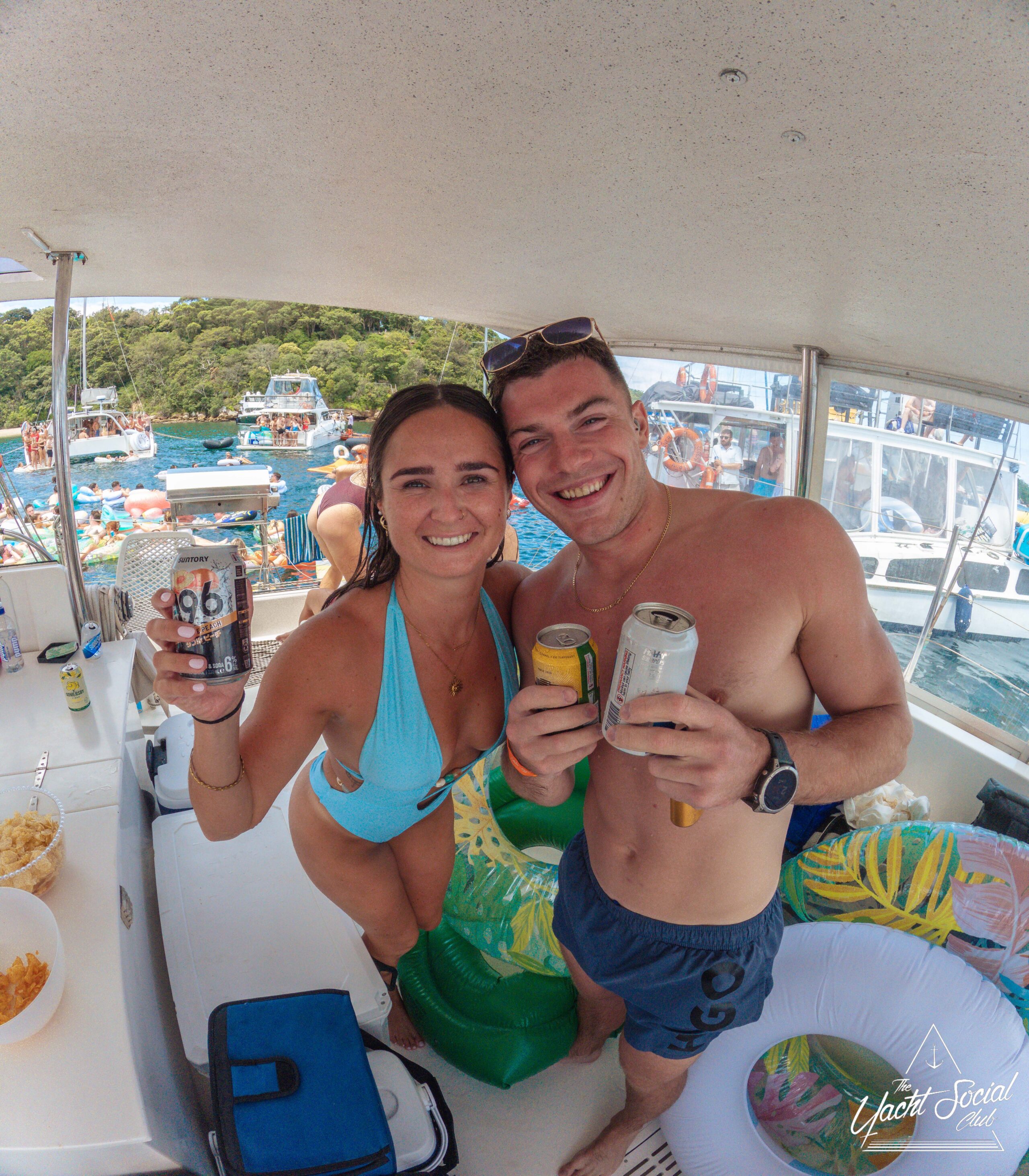 Two people in swimsuits stand and smile on a boat, holding up cans and drinks. Other people sit and relax around them under a partly cloudy sky, enjoying a lively, sunny day on the water.