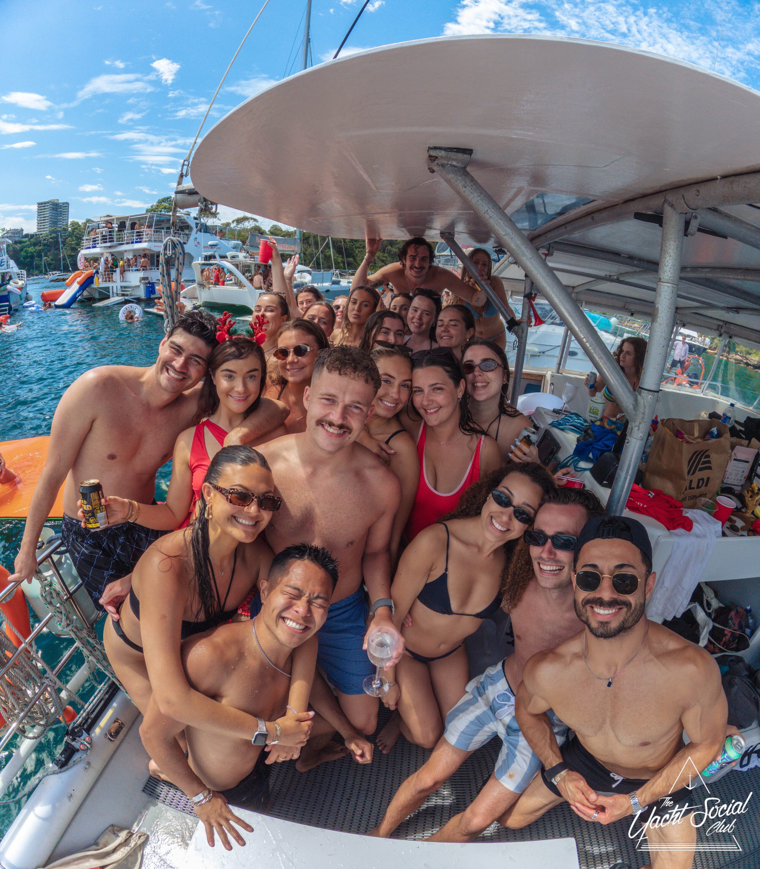 A group of people in swimsuits smile and pose together on a boat, some holding drinks or food. The boat is crowded and other boats with people are visible in the background on the water.