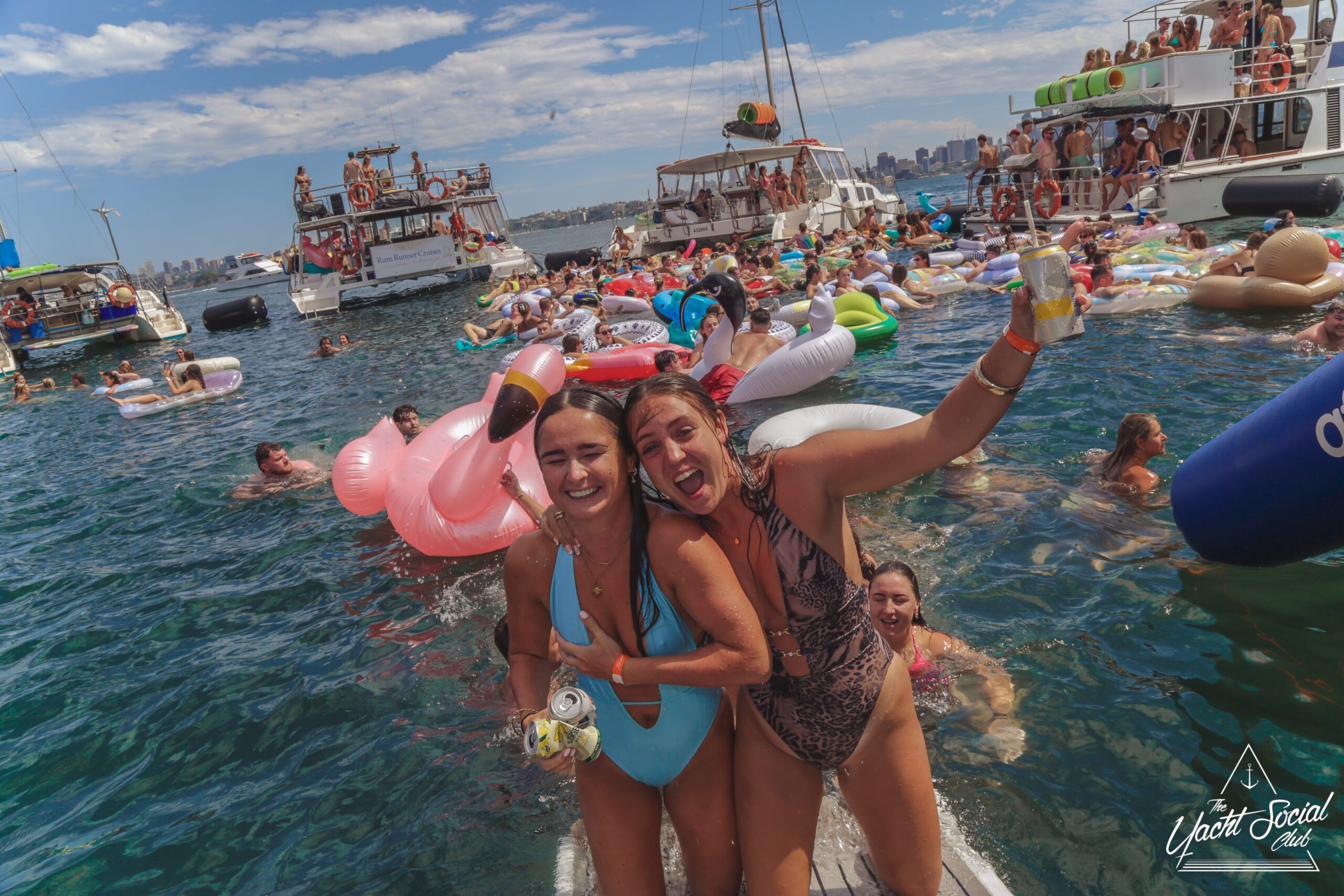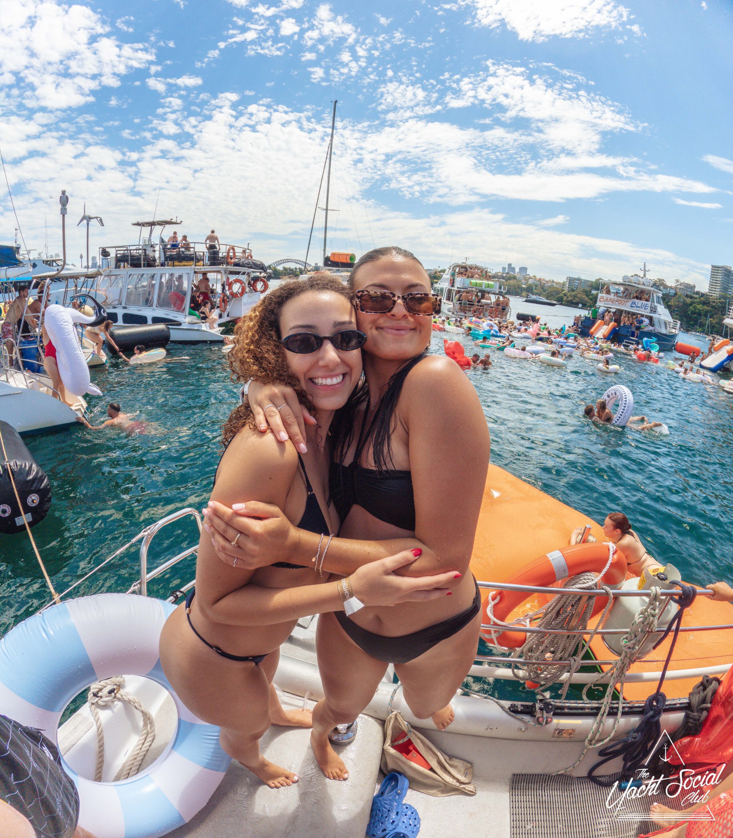 Two women in swimsuits smile and pose together on a yacht surrounded by people on pool floats in the water, with several boats and a lively summer party scene in the background.