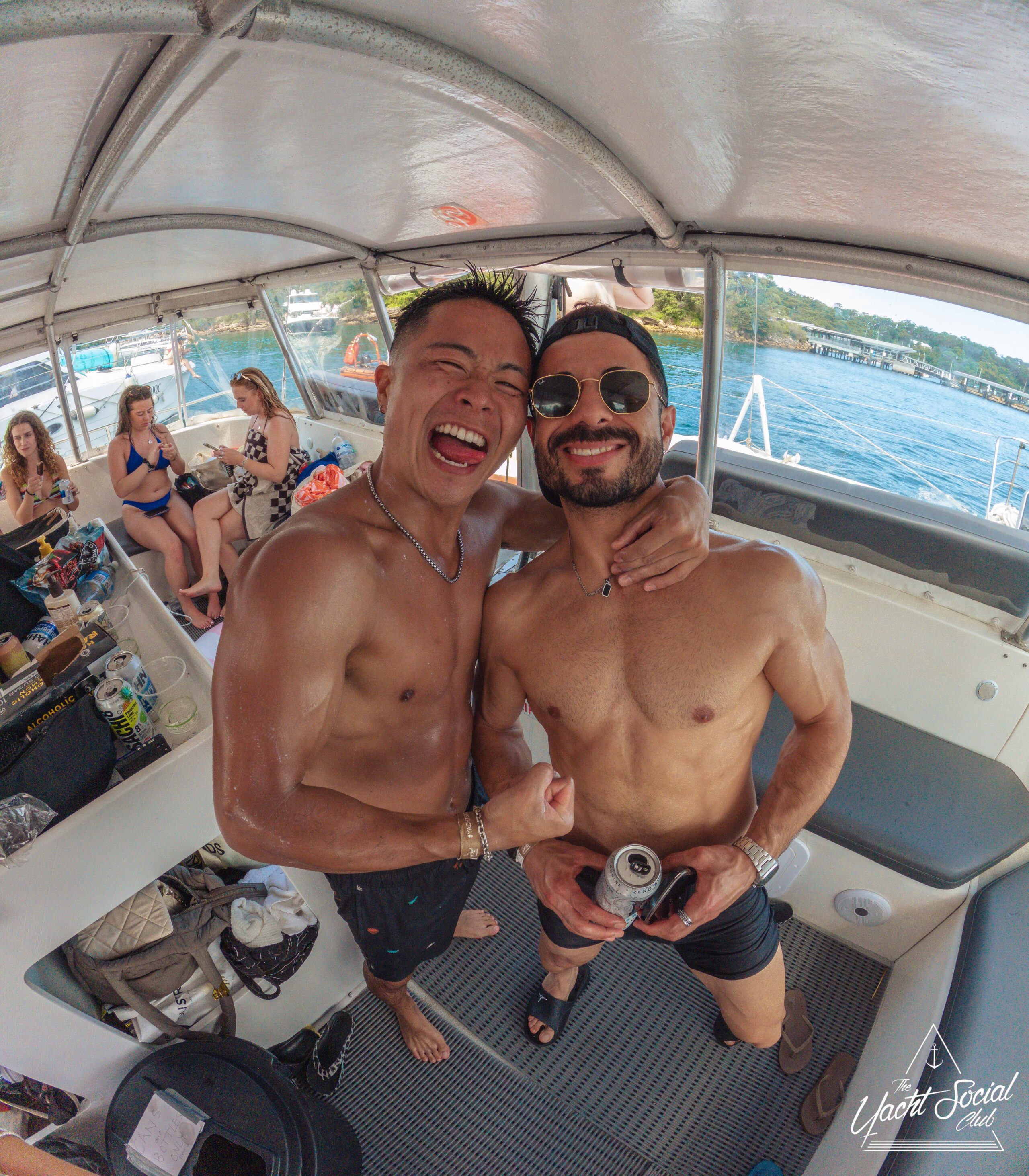 Two shirtless men smile and pose together on a boat; one holds a can and wears sunglasses. Other people in swimsuits relax nearby. The boat is on the water, with the shoreline visible in the background.