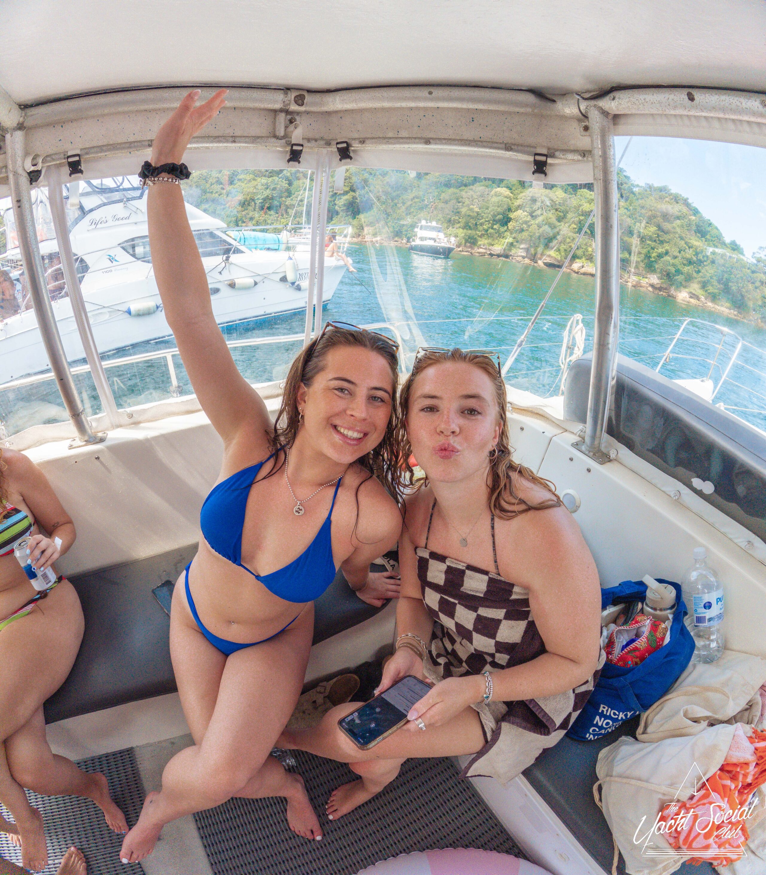 Two women in bikinis sit and smile at the camera on a boat. One holds a drink and a phone. Other boats and people are visible on the water in the background on a sunny day.