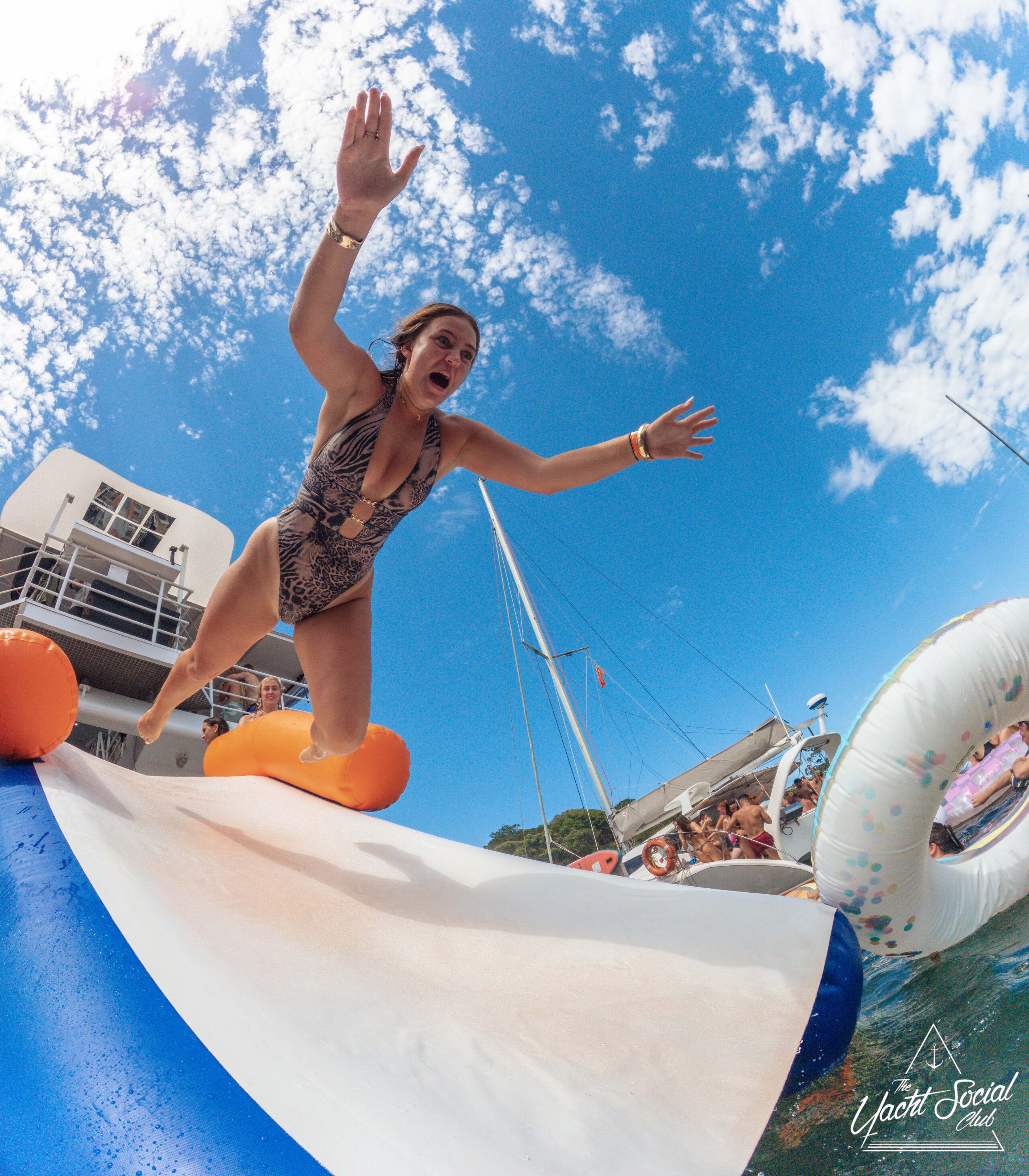 A woman in a swimsuit slides down an inflatable water slide from a yacht into the ocean, with other boats and people in the background under a blue sky with scattered clouds.