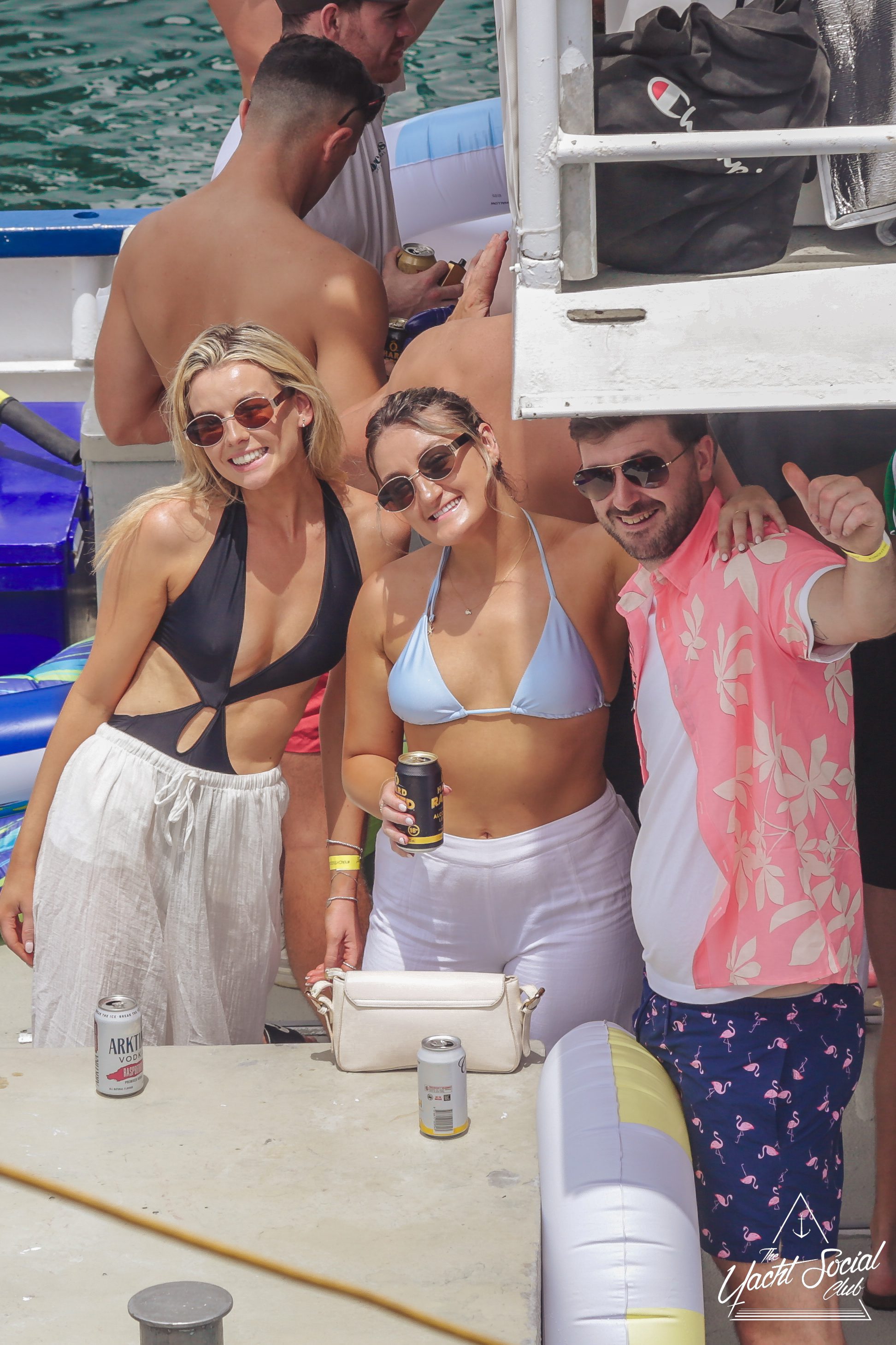 Four women in swimsuits smile and pose with drinks on a boat crowded with people and colorful inflatables, with many other boats and a blue sky in the background. It’s a lively summer party scene on the water.