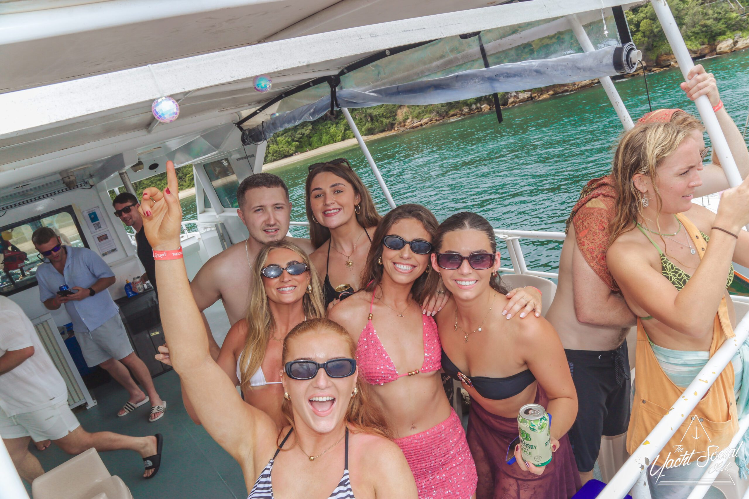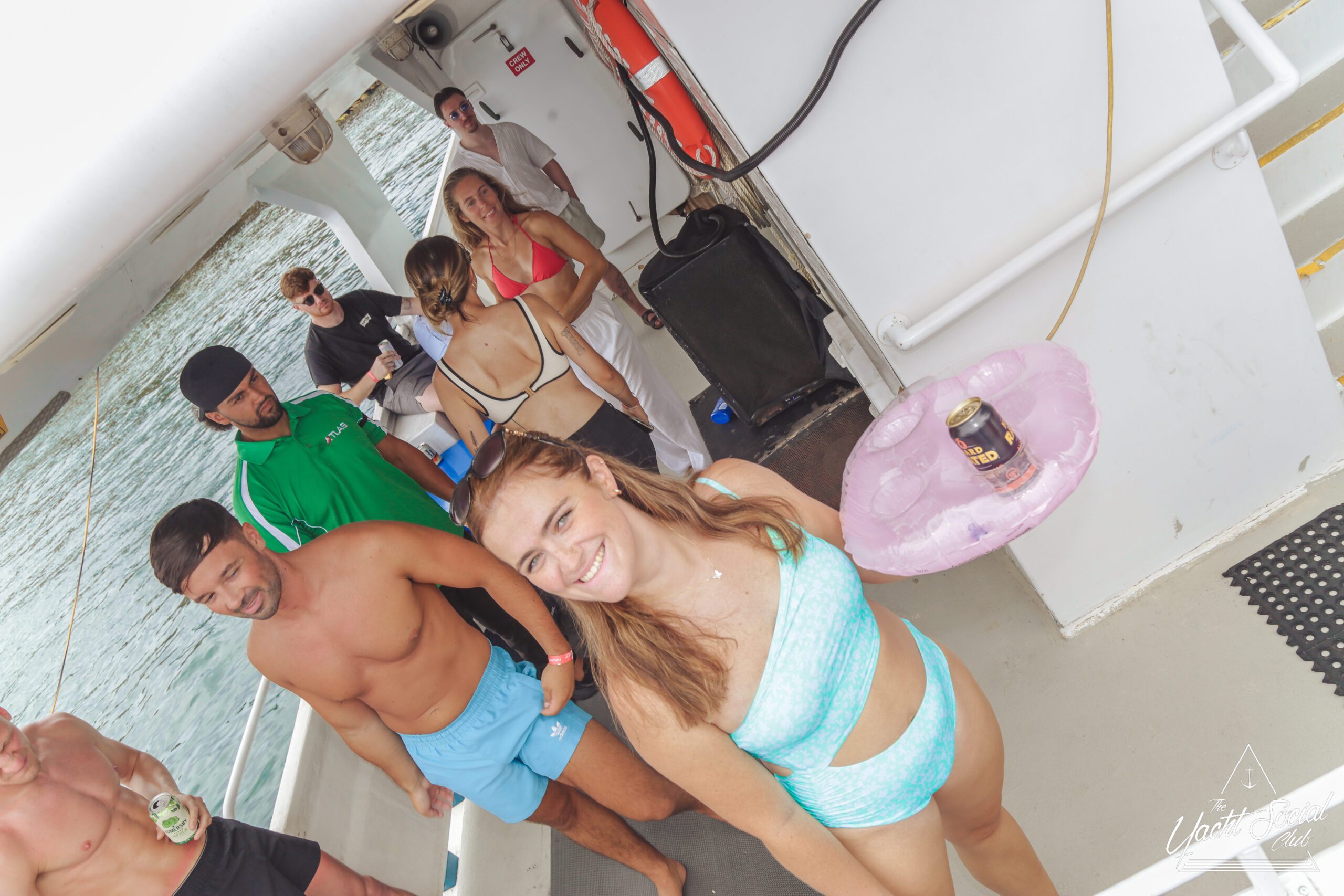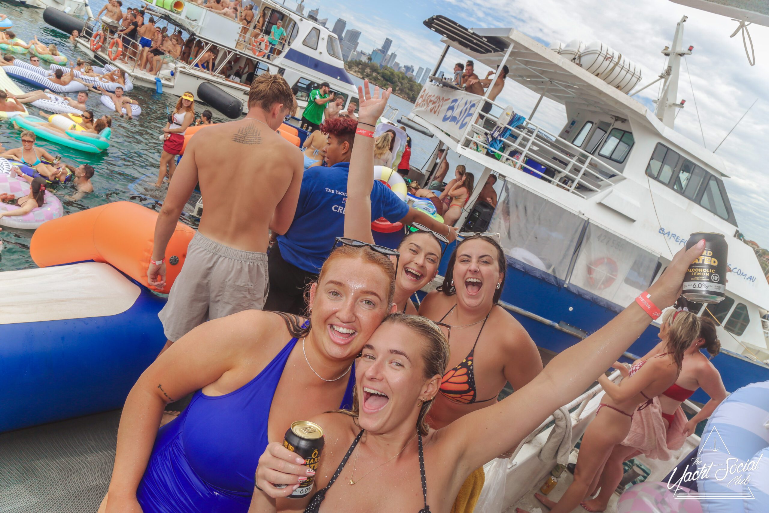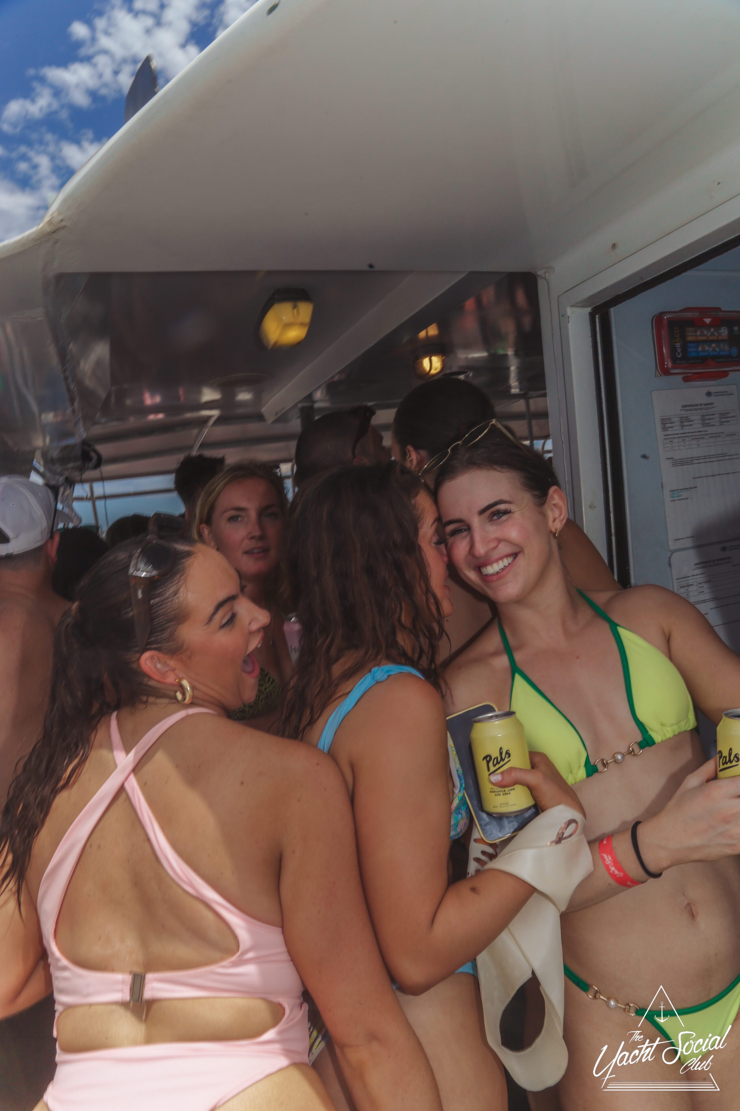 A group of smiling women in swimsuits pose together on a yacht, holding drinks and wearing sunglasses, with a festive, crowded boat party and cityscape in the background.