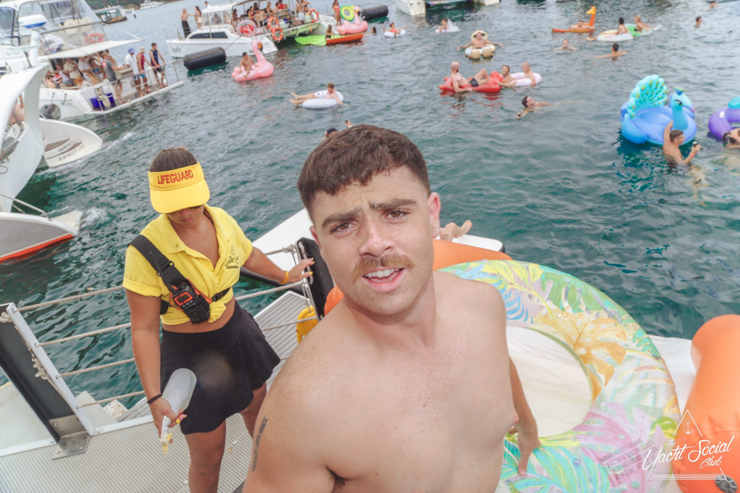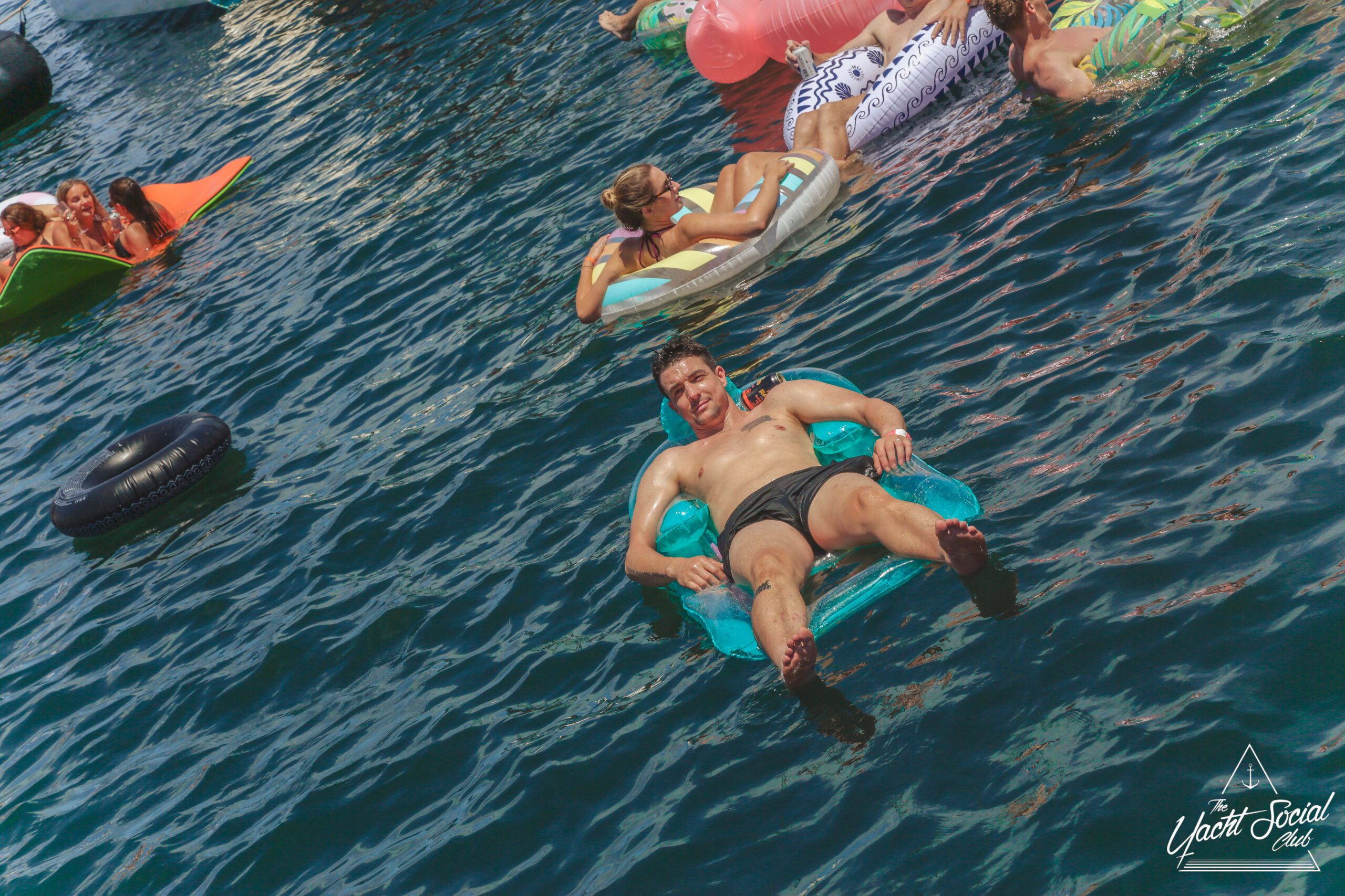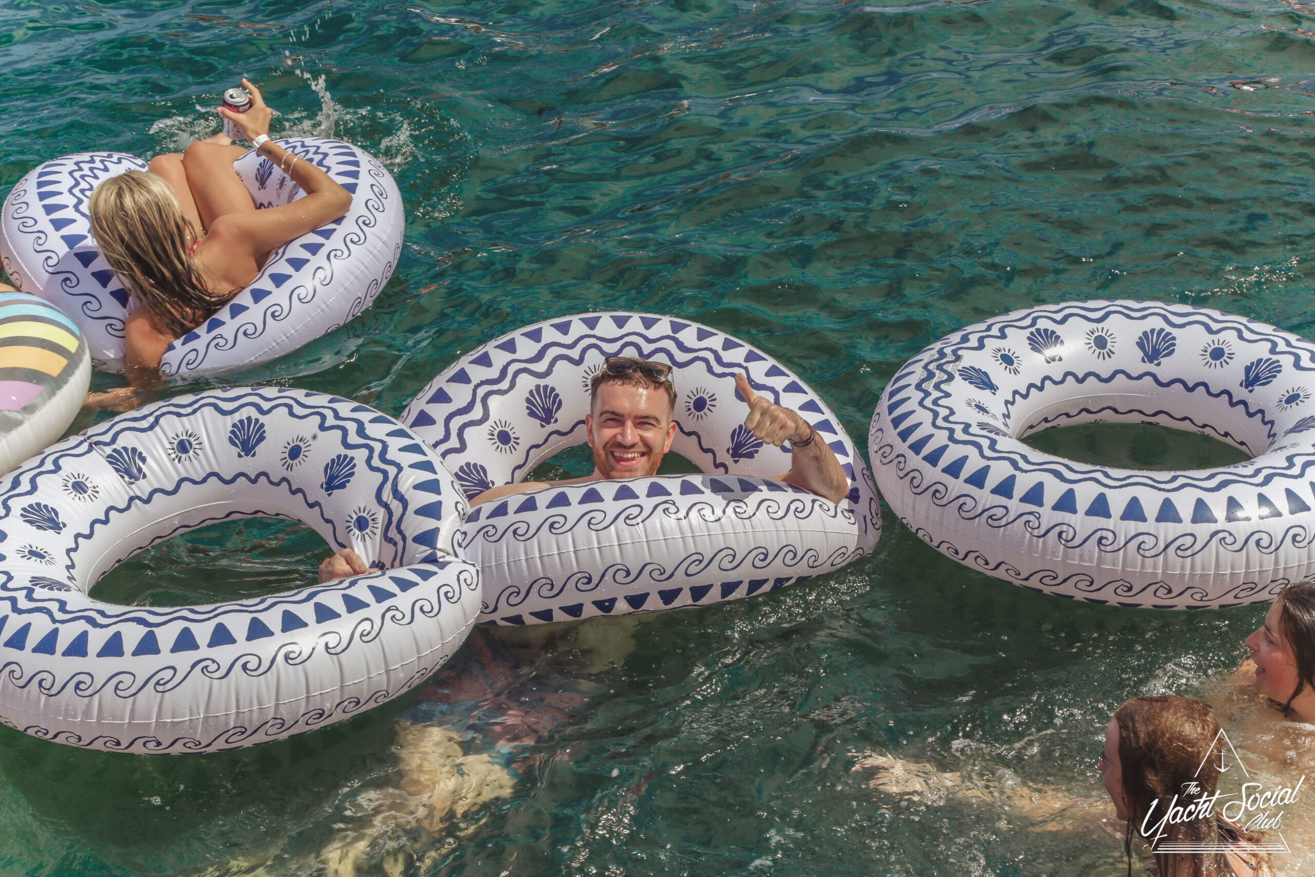 A man smiles and poses with his arms through two inflatable pool rings in clear blue water, surrounded by others on similar floats. The scene is relaxed and cheerful. The "Yacht Social" logo is in the bottom right corner.