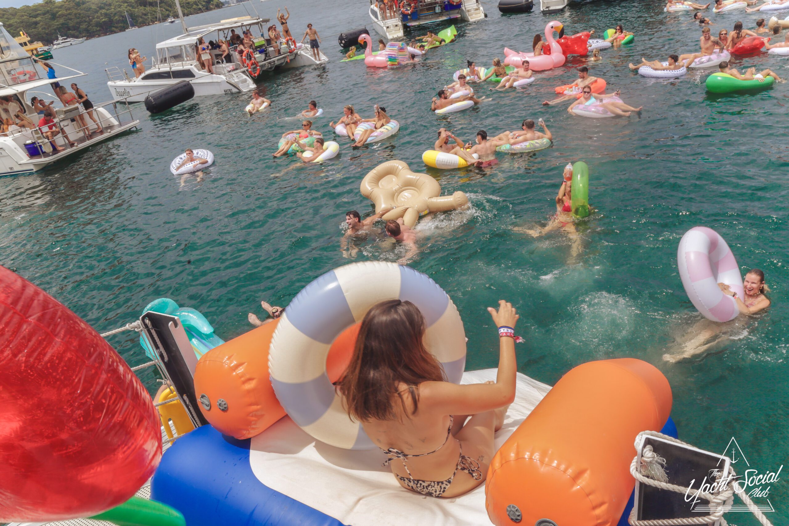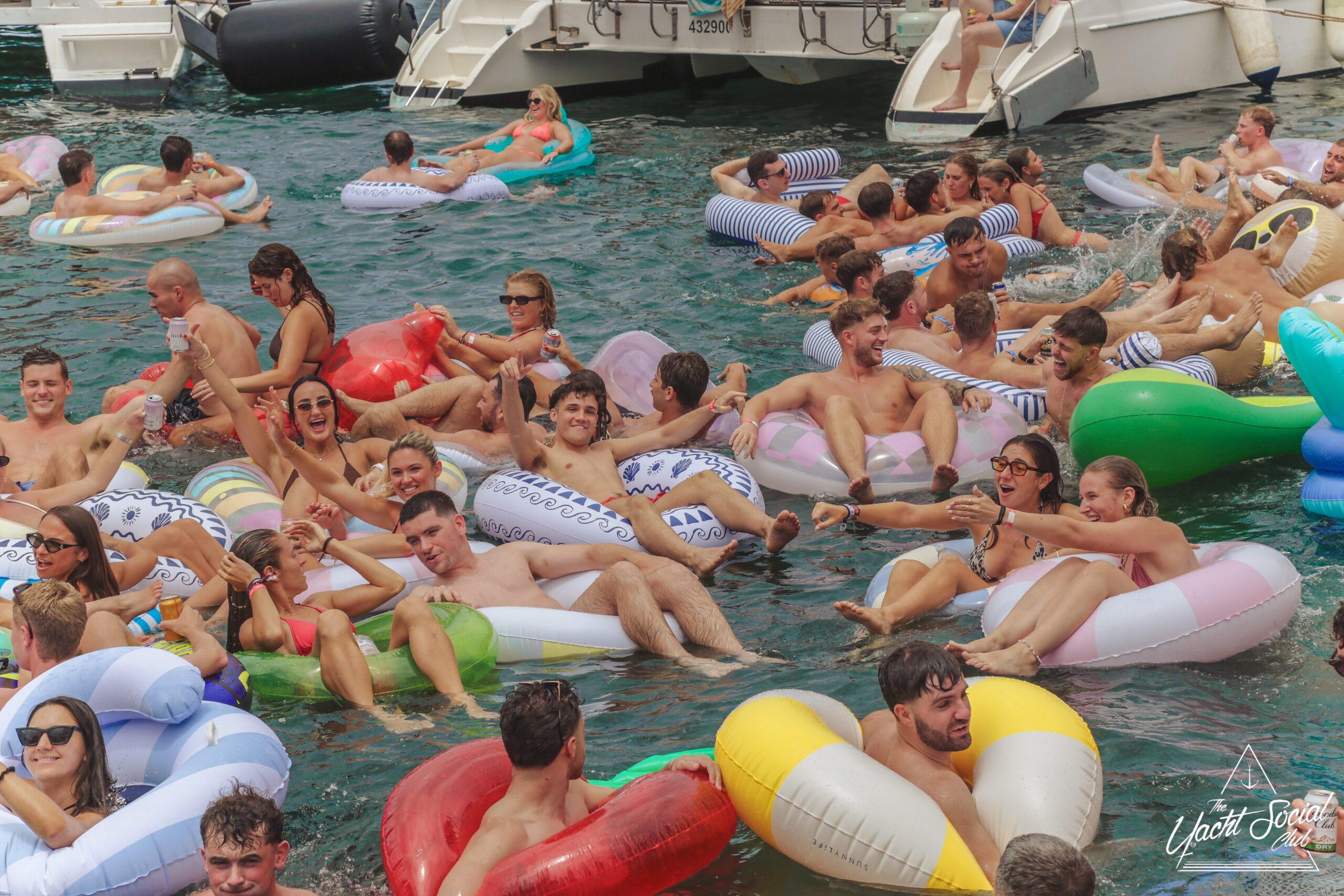 People enjoying a lively pool party in the water between docked yachts, many relaxing on colorful inflatables, with others socializing on the boats under a sunny sky.