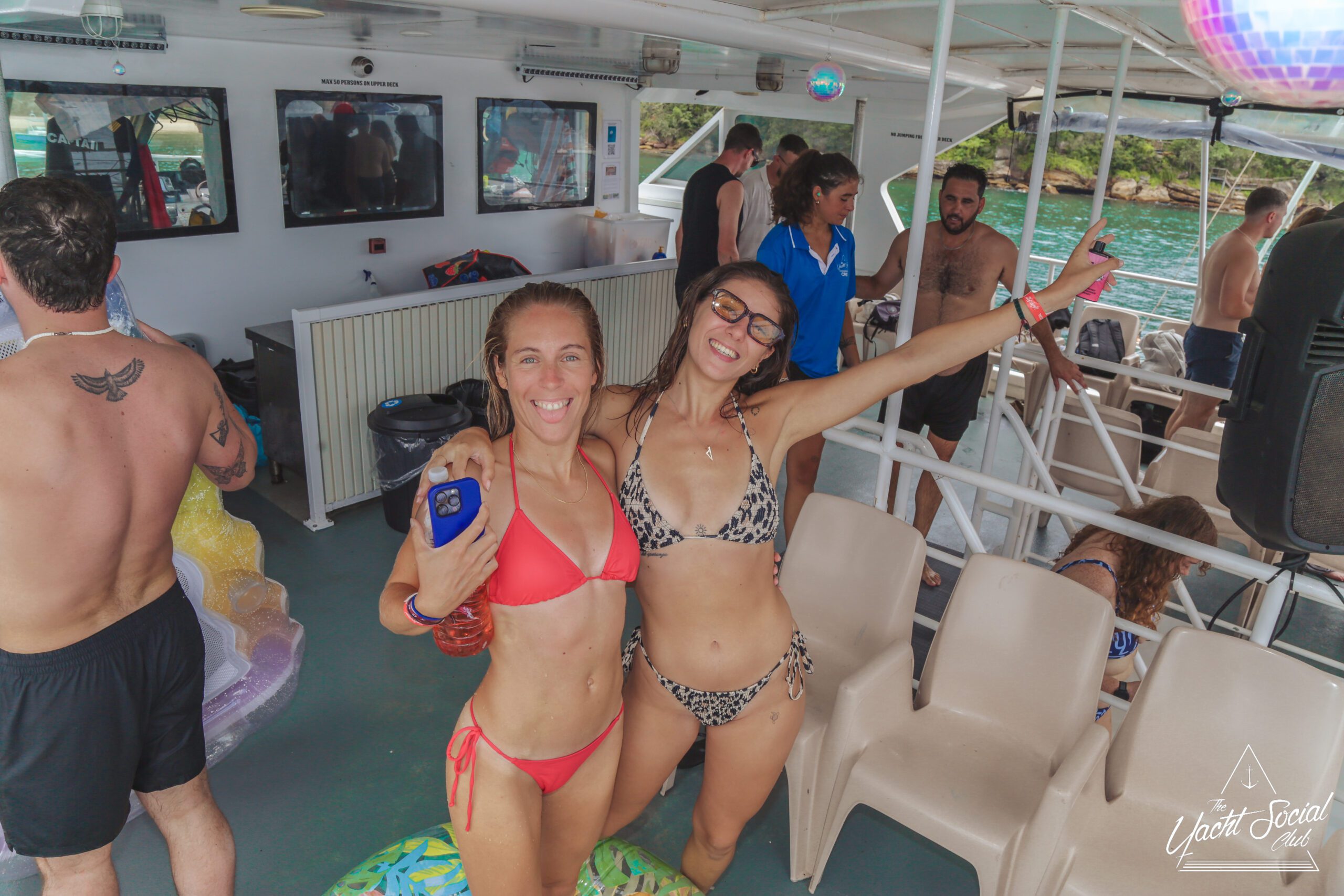 Two women in swimsuits smile and pose with arms raised at a lively outdoor boat party, surrounded by other people and sailboats on a sunny day.