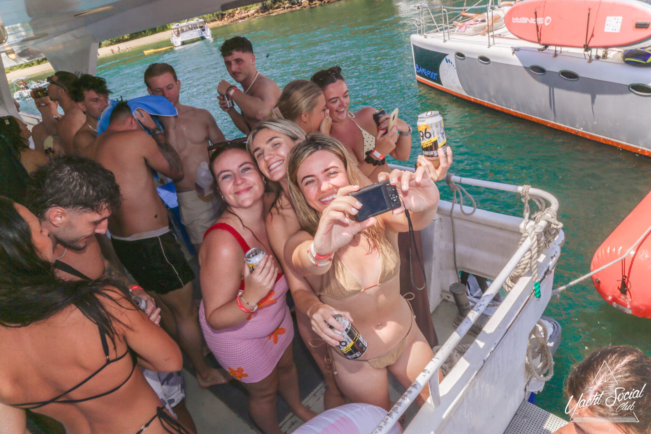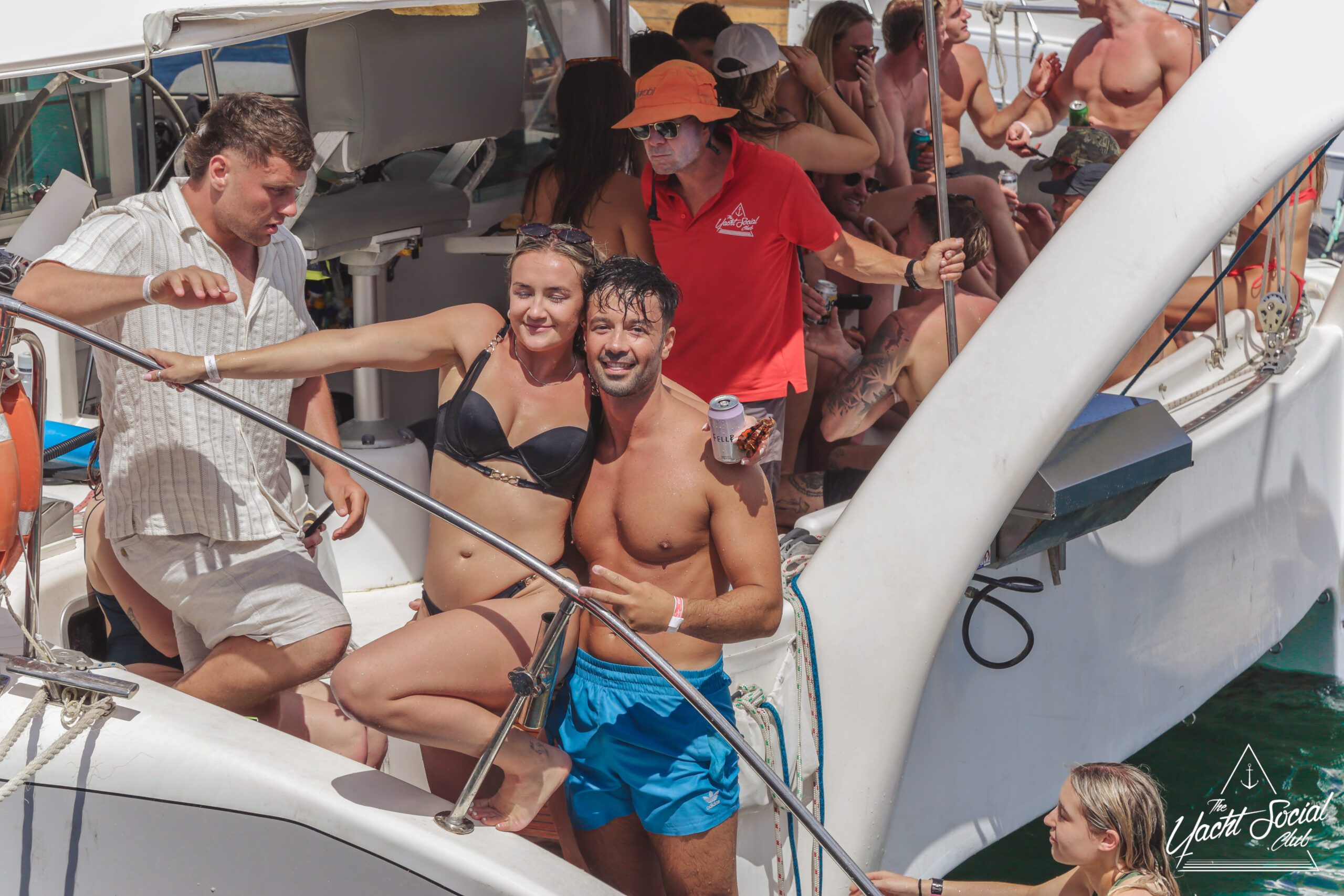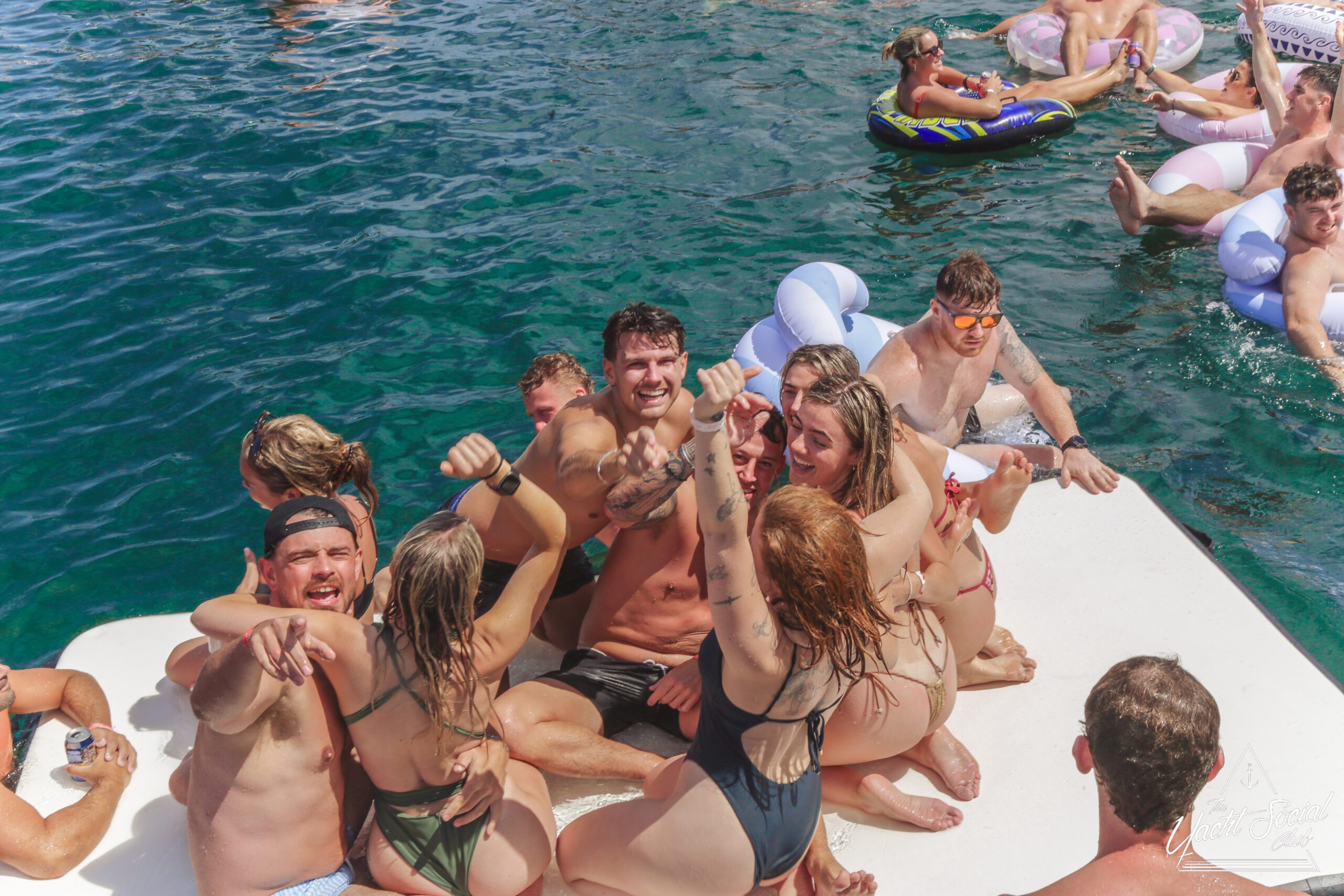 A group of young adults in swimwear smile and pose on a boat, holding drinks and enjoying a sunny day on the water. The sea and other boats are visible in the background.