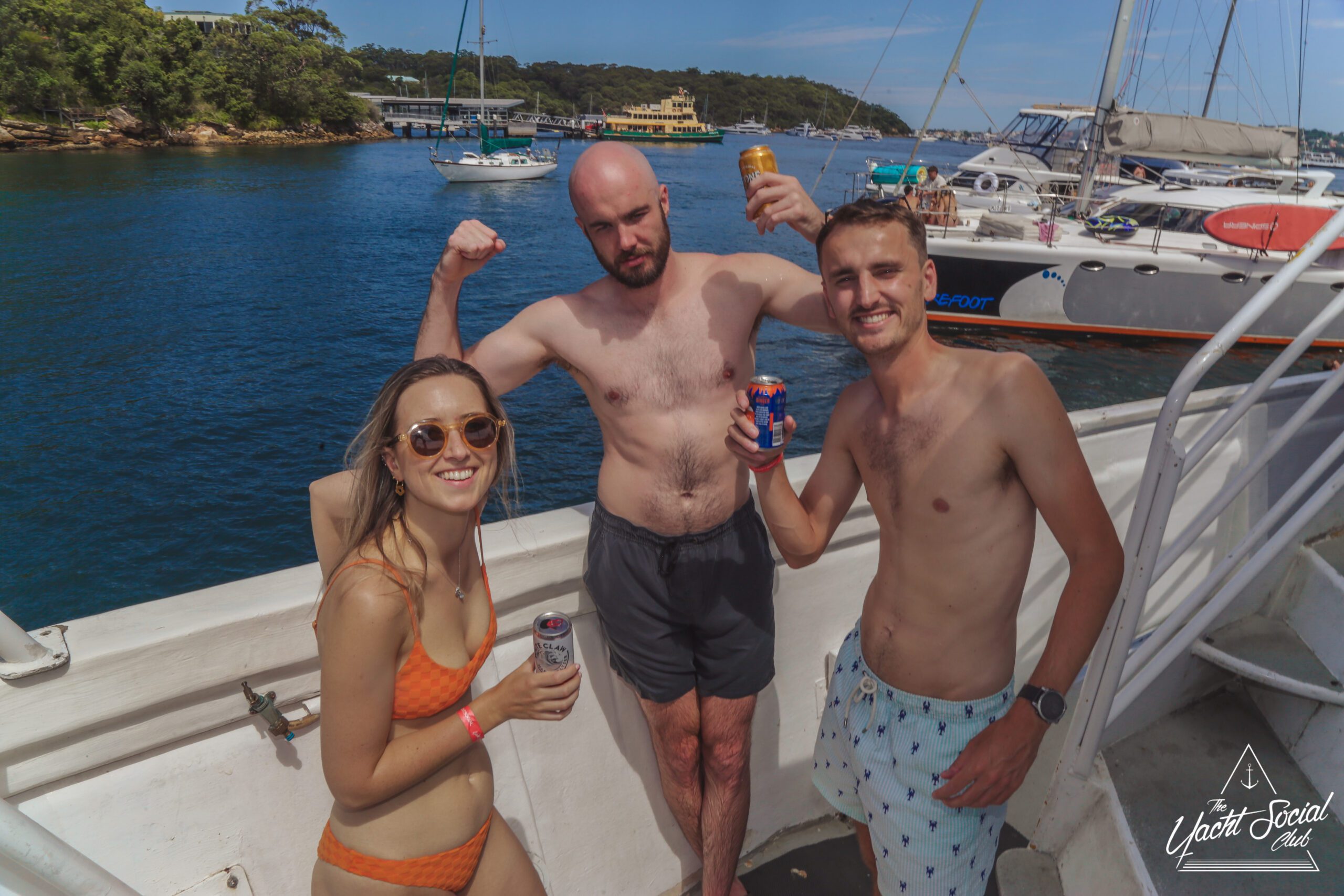 Three young adults in swimwear stand on a boat deck, smiling at the camera. It's sunny, with blue sky, water, and other boats visible in the background. Two hold drinks, and everyone looks happy and relaxed.