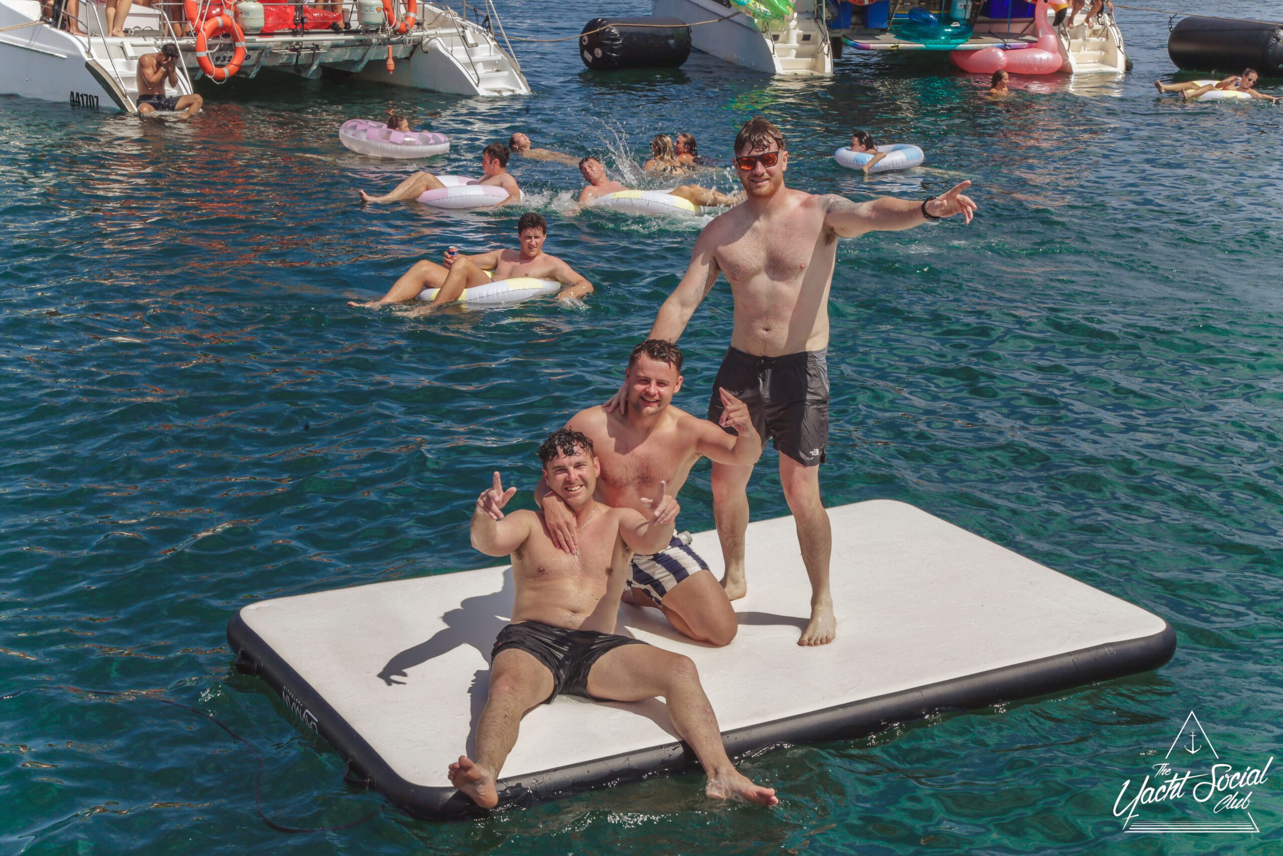 A group of people in swimsuits relax and smile on a floating mat in the water near yachts. Others swim and socialize nearby under a partly cloudy sky, enjoying a lively day on the water.