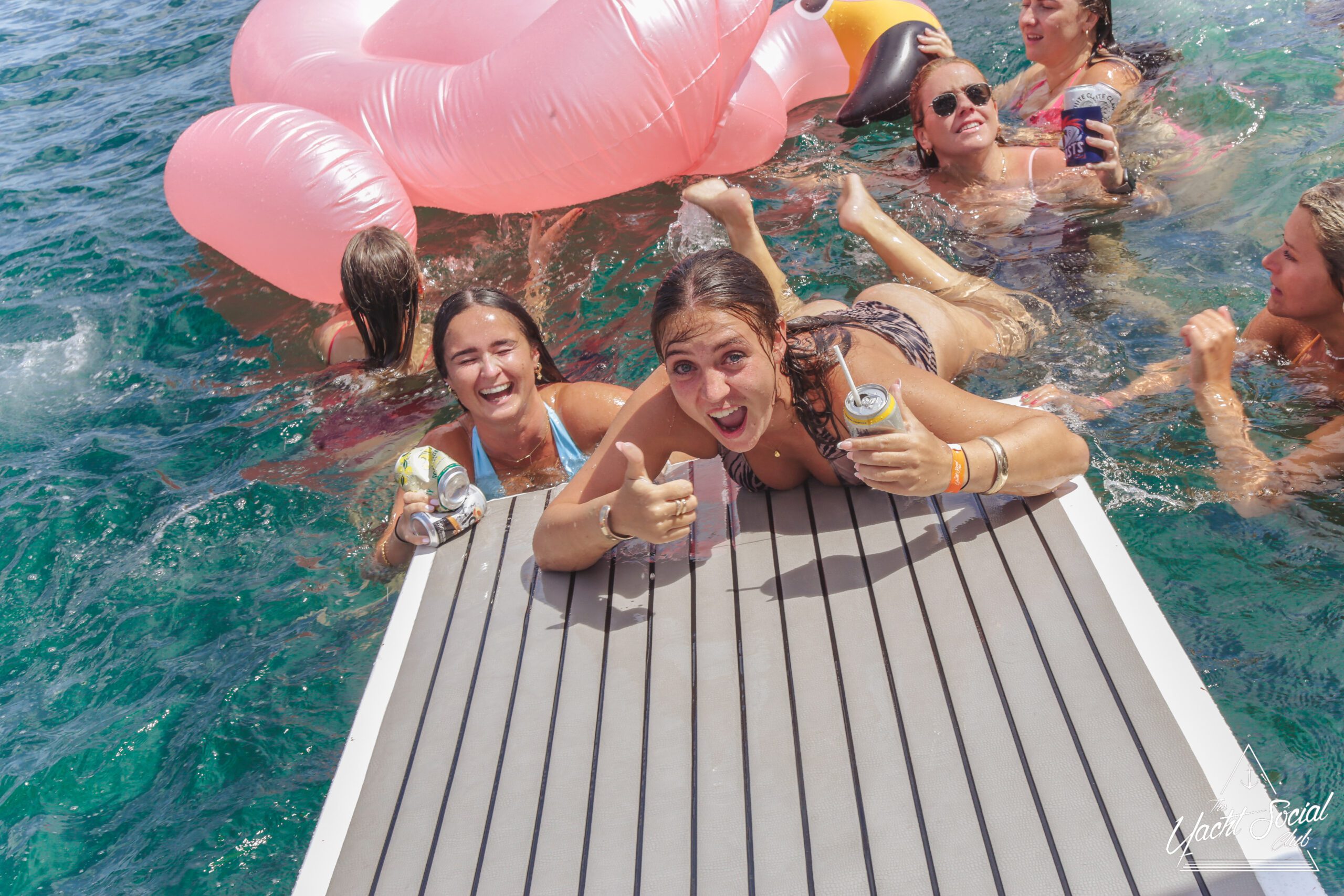 Several women in swimsuits enjoy a party on and around a yacht, some climbing out of the water and others standing on the boat’s deck, with another boat and floating toys visible in the background.
