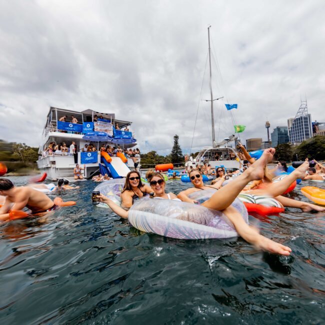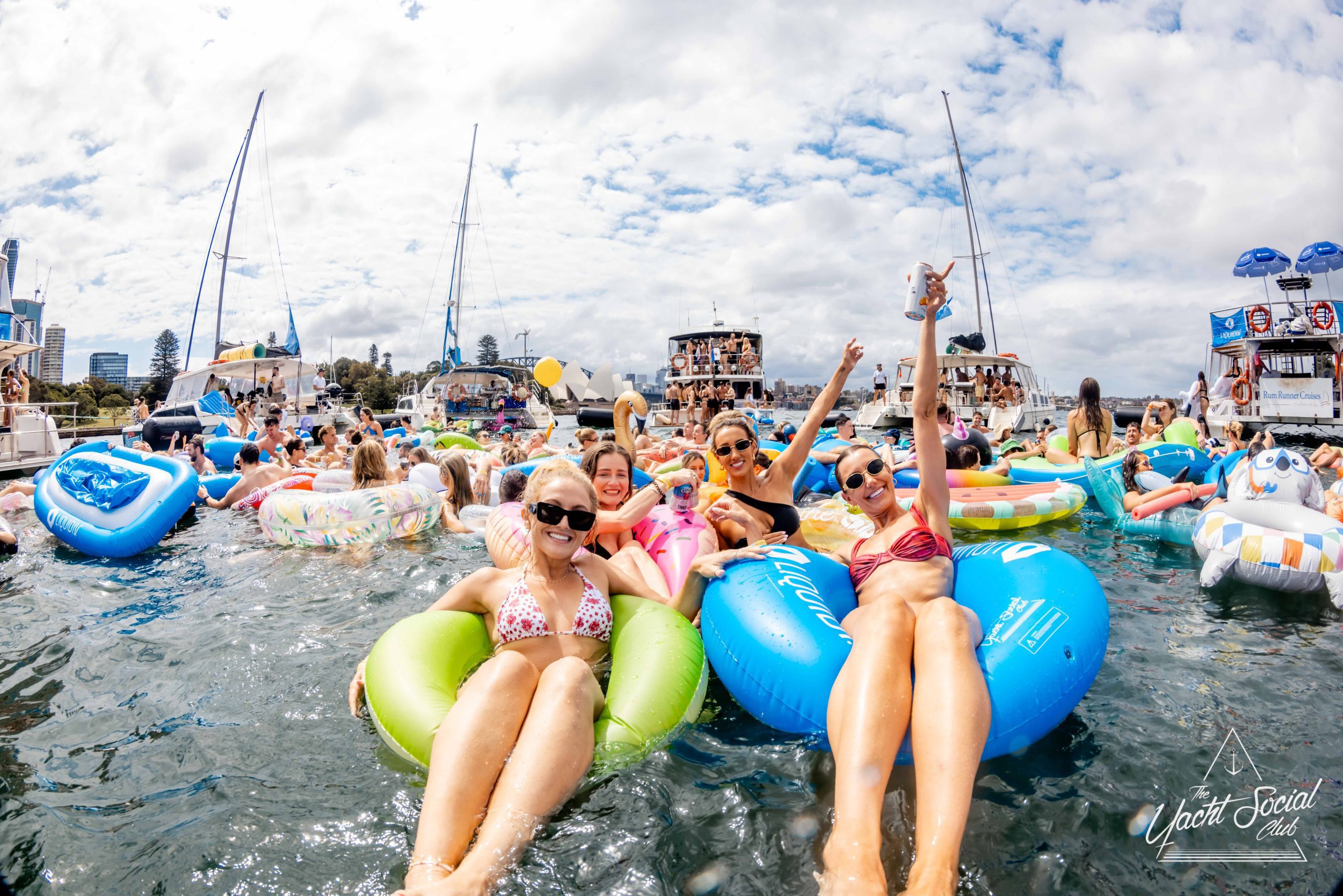 A lively scene with many people floating on inflatable tubes in a body of water. A cruise boat is in the background, with Sydney Opera House and Harbour Bridge visible. The sky is cloudy, and participants are enjoying the party atmosphere.