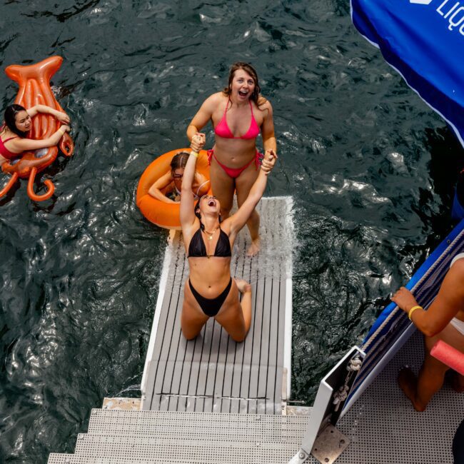 People are enjoying a day at the lake. A woman in a black bikini steps onto a floating dock, while others swim nearby. An orange float and a blue umbrella with "Liquid IV" text are visible.