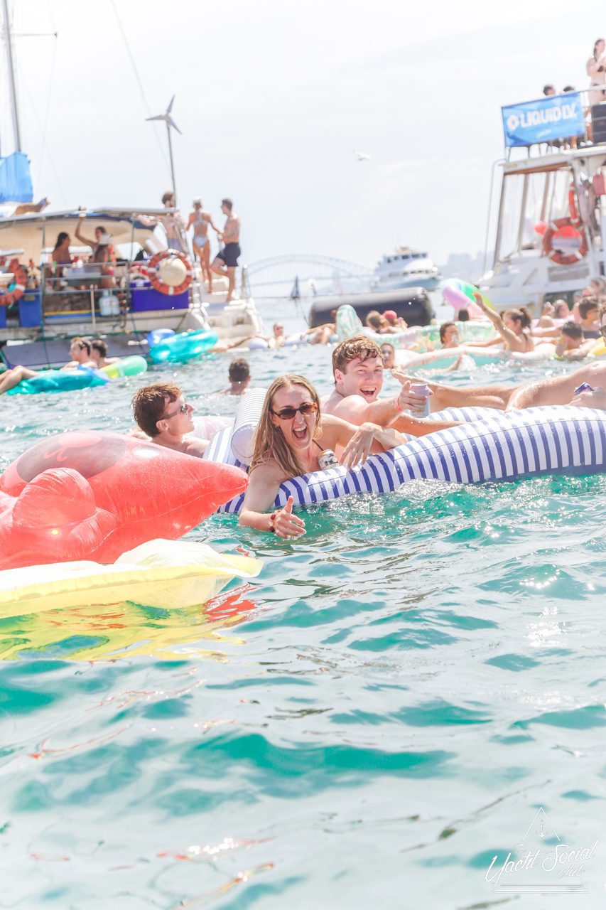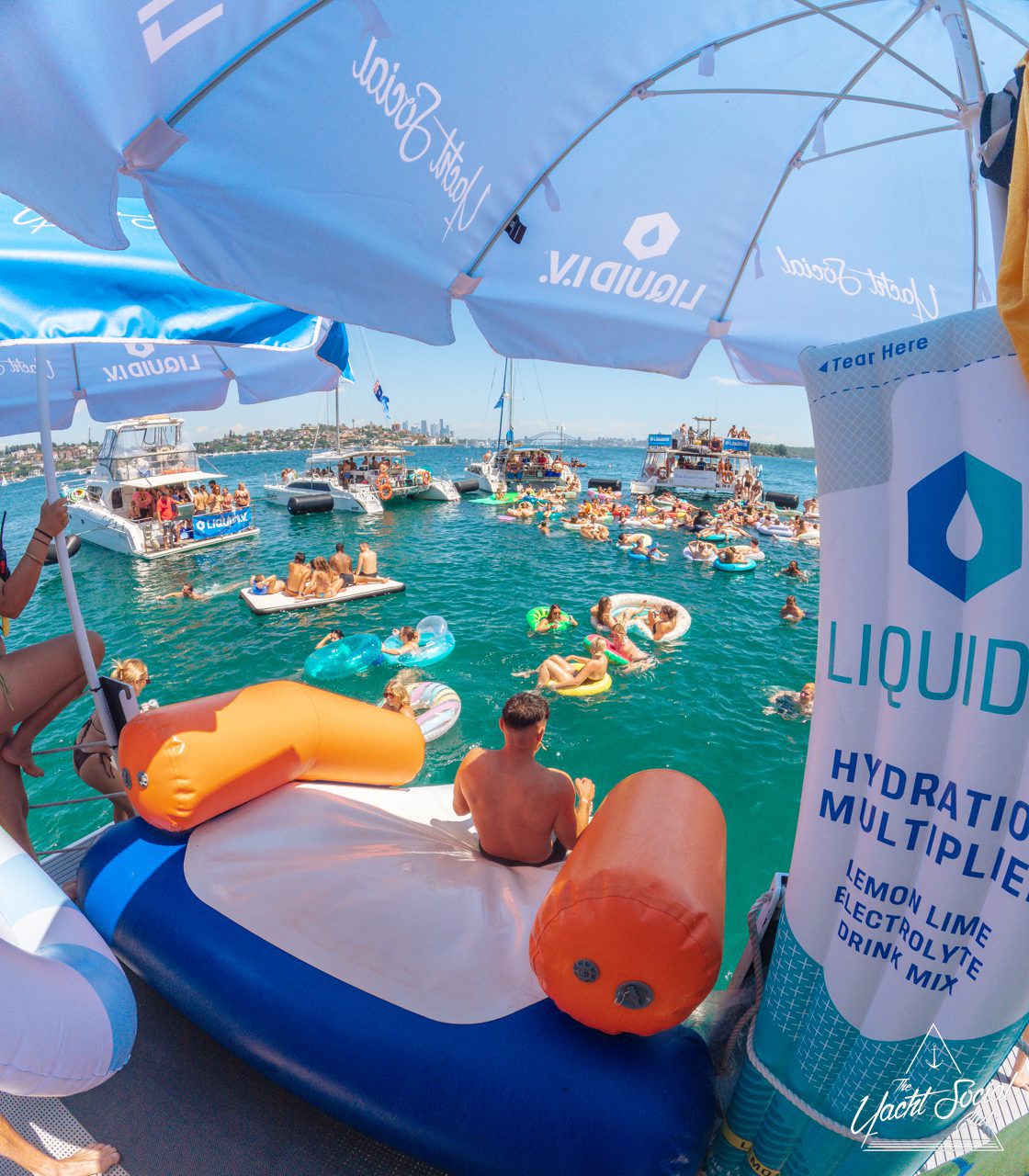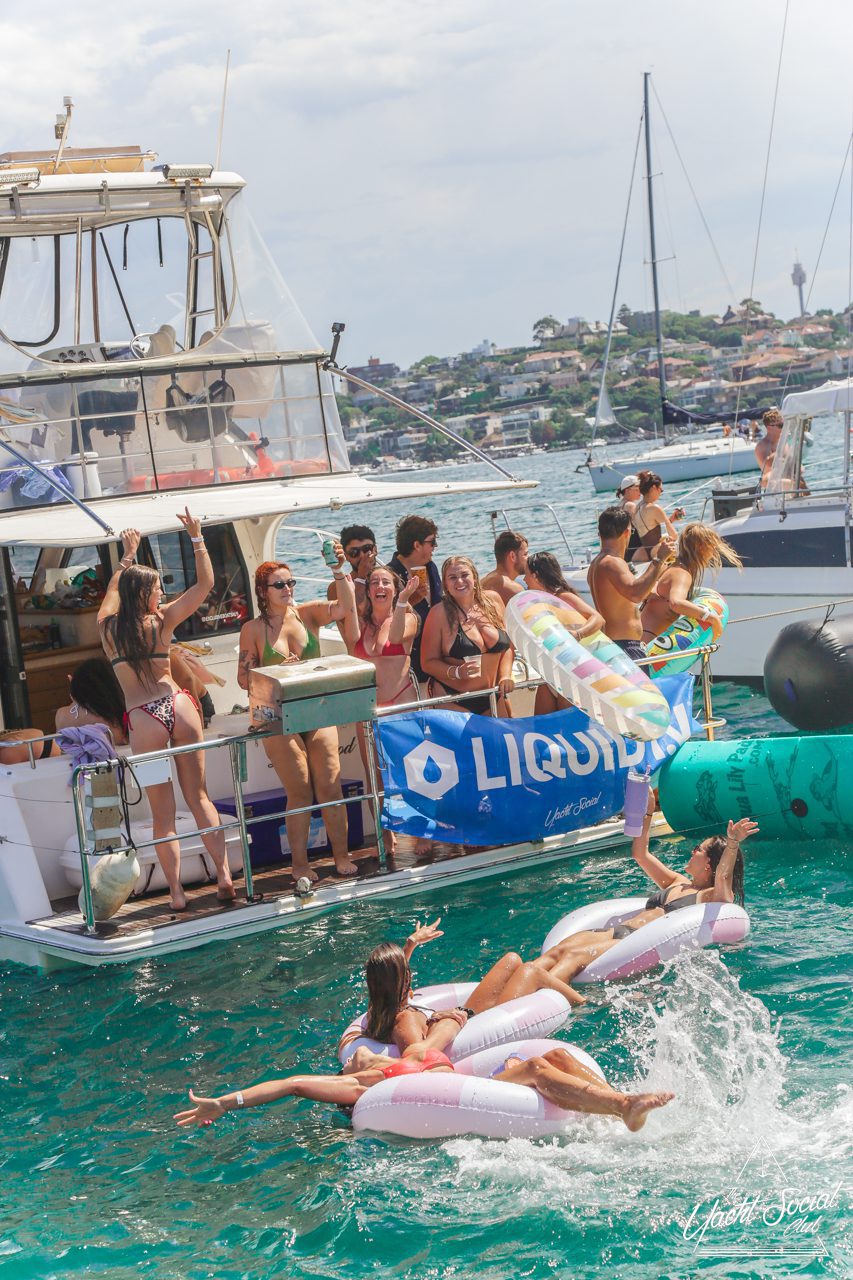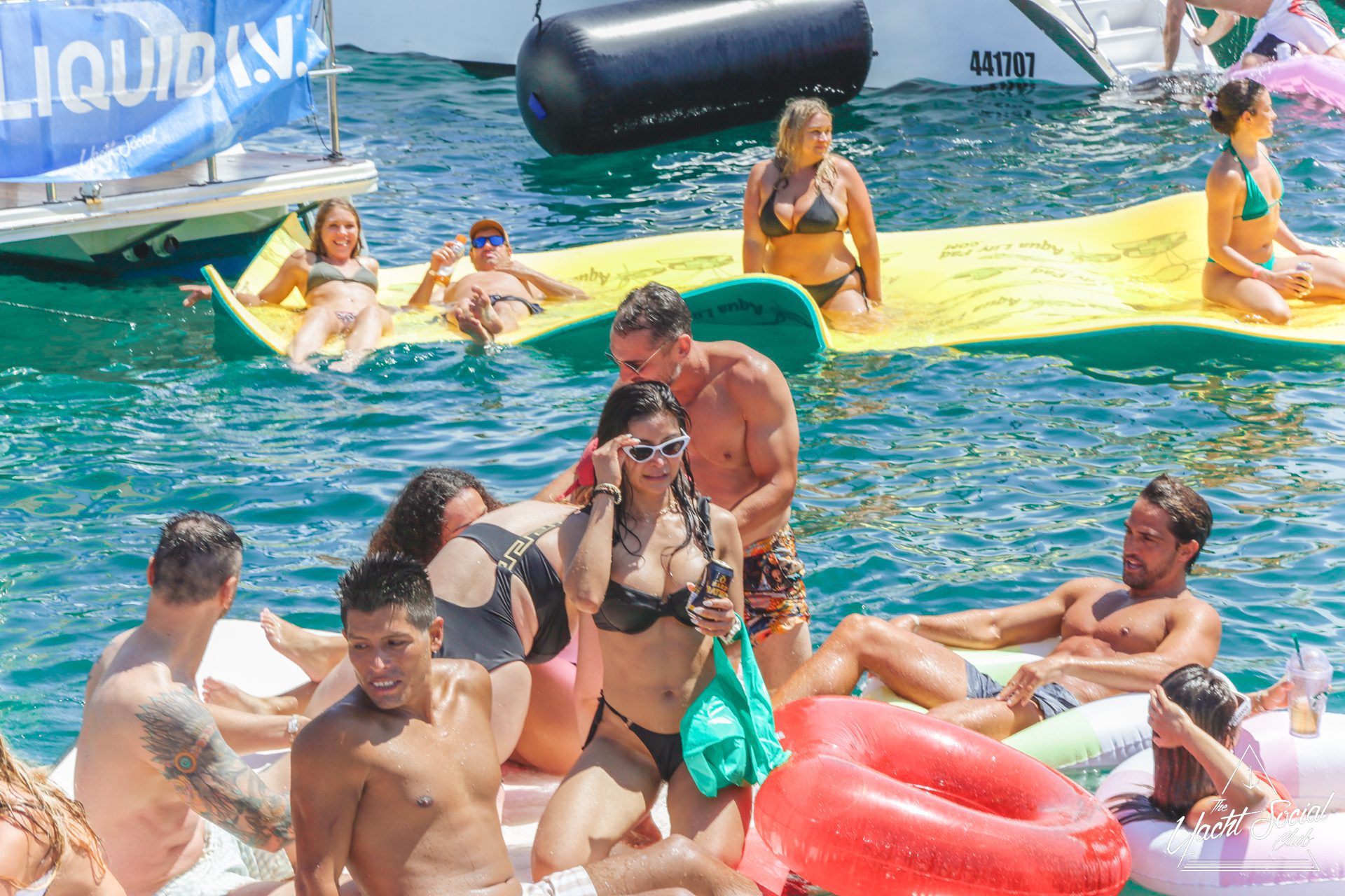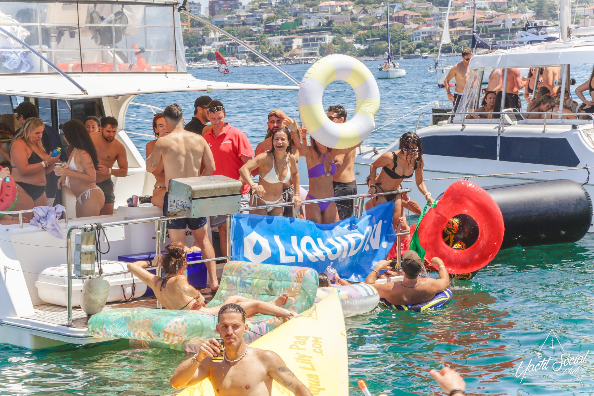 A group of people in swimwear enjoy a lively boat party on a sunny day, holding inflatable rings and floating on rafts in the water near two yachts, with a blue "LIQUID" banner displayed.