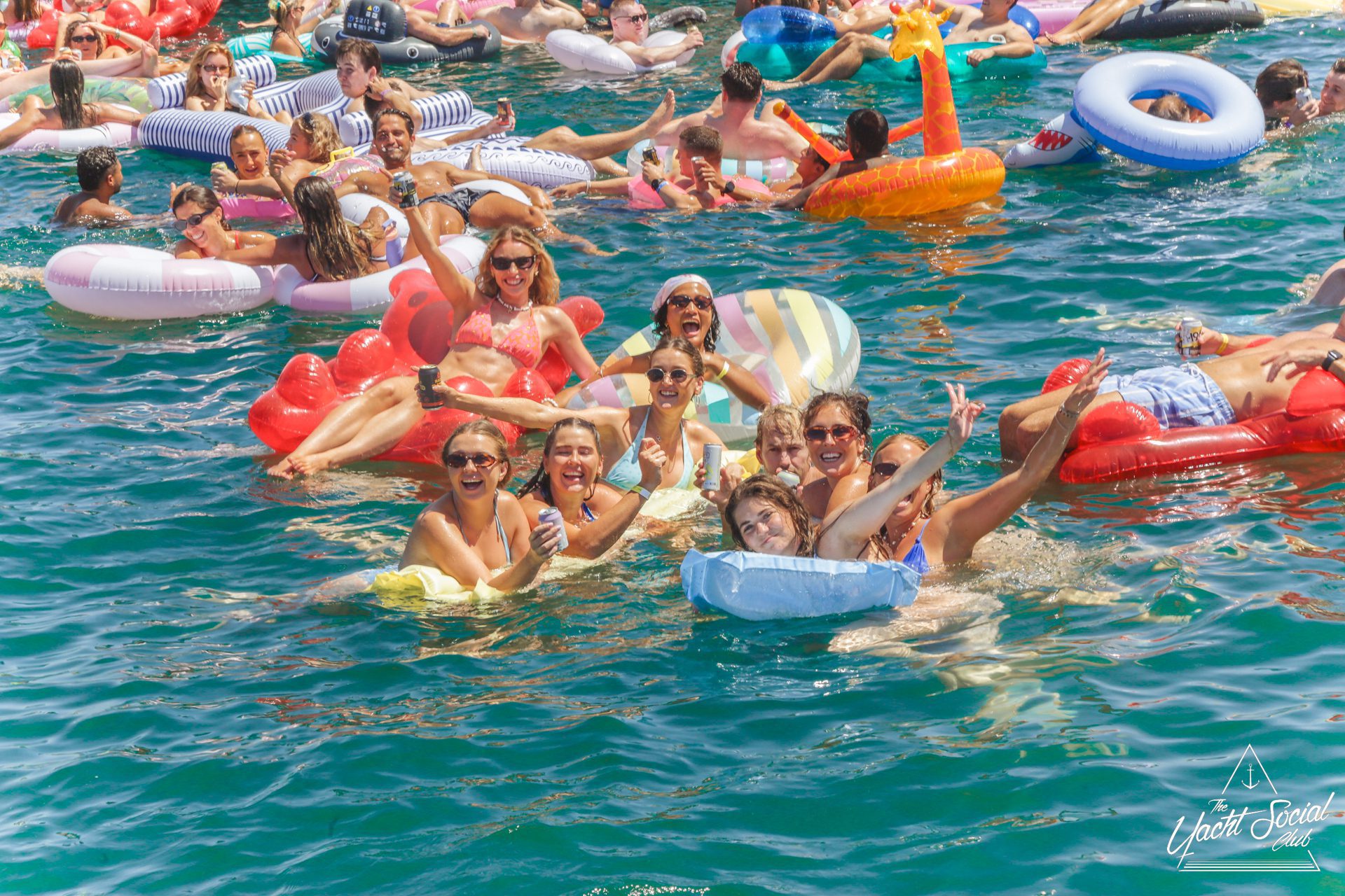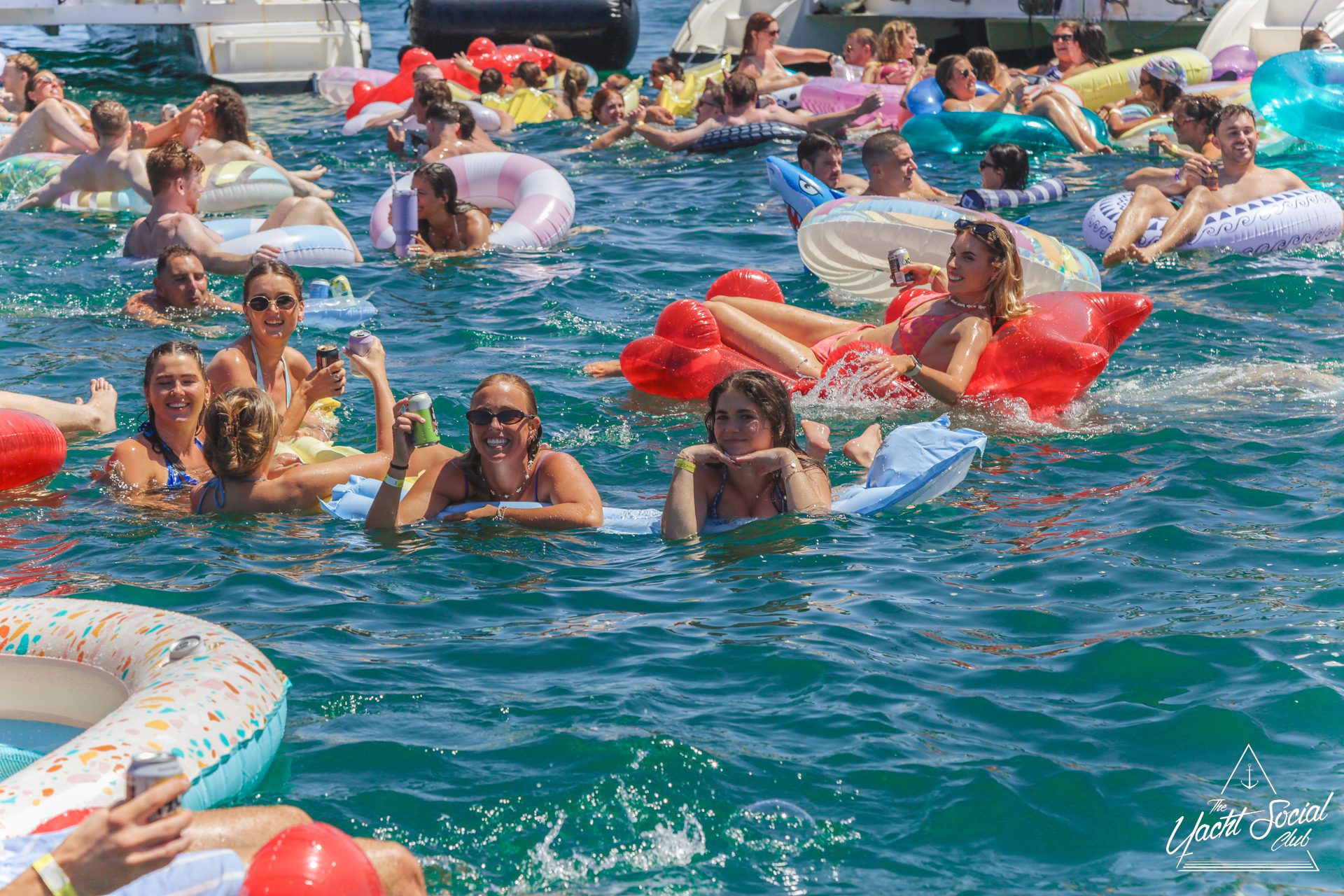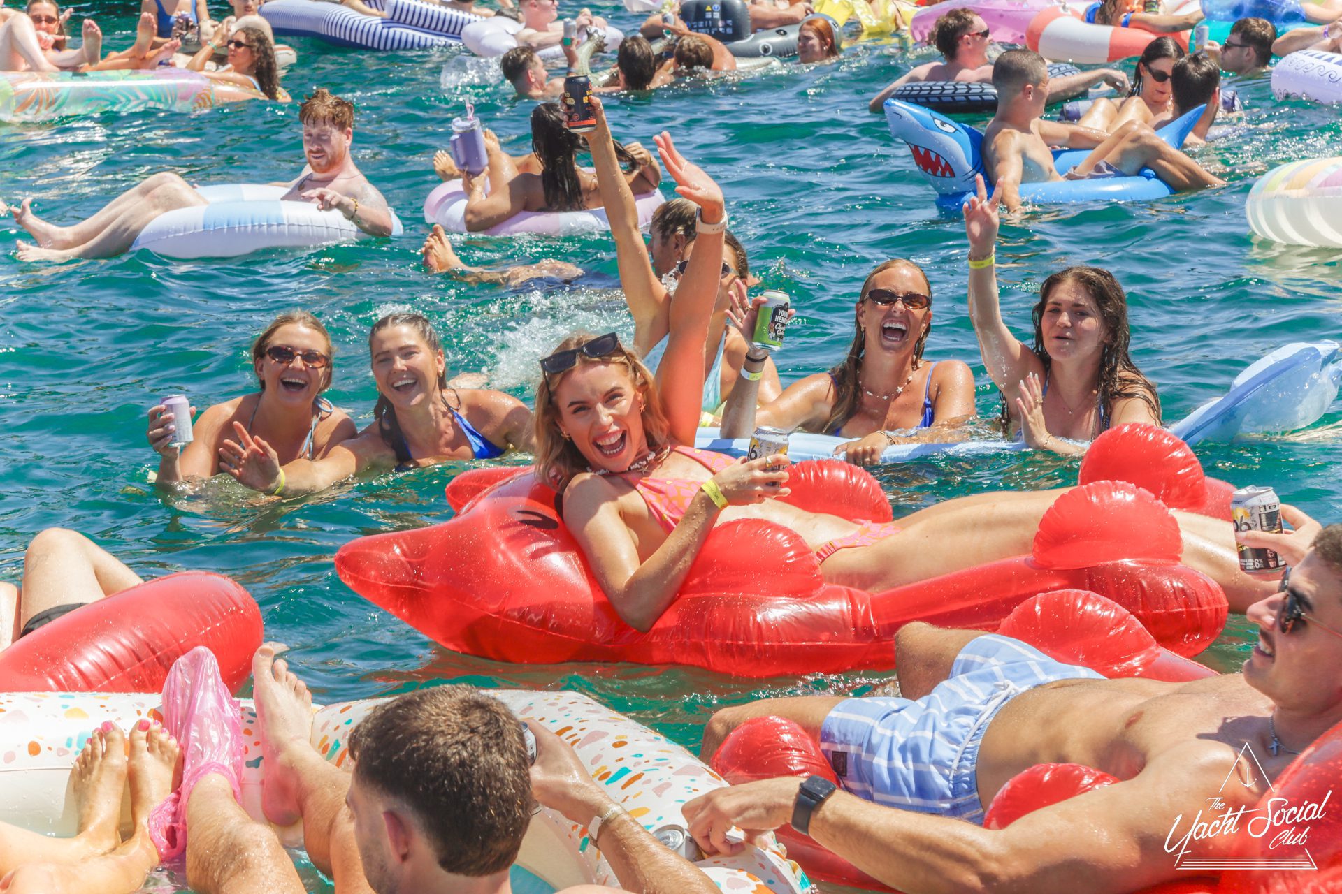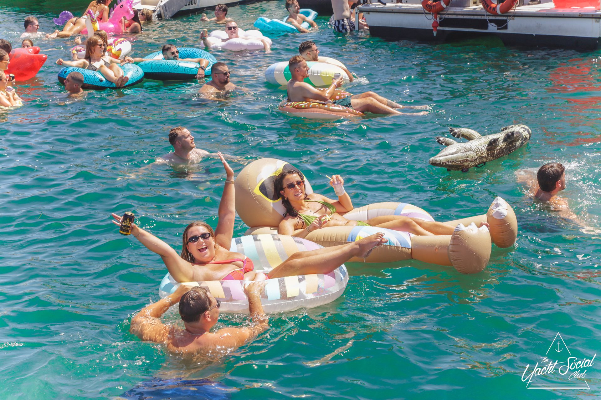 A man in swim trunks smiles and flashes a peace sign while lounging on a colorful inflatable ring in the water; boats and other people on floaties are visible under a clear blue sky. The Yacht Social Club logo appears in the corner.