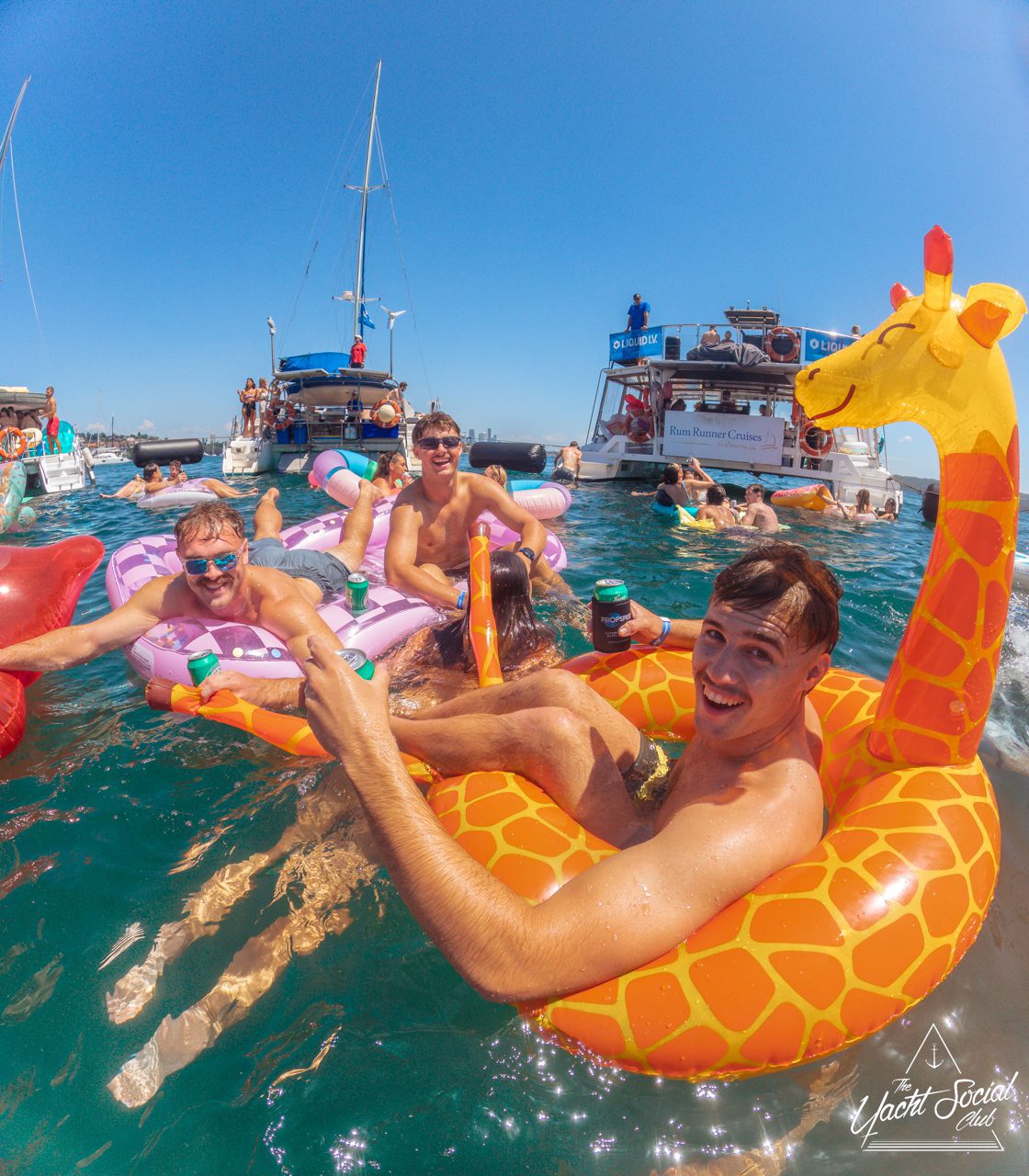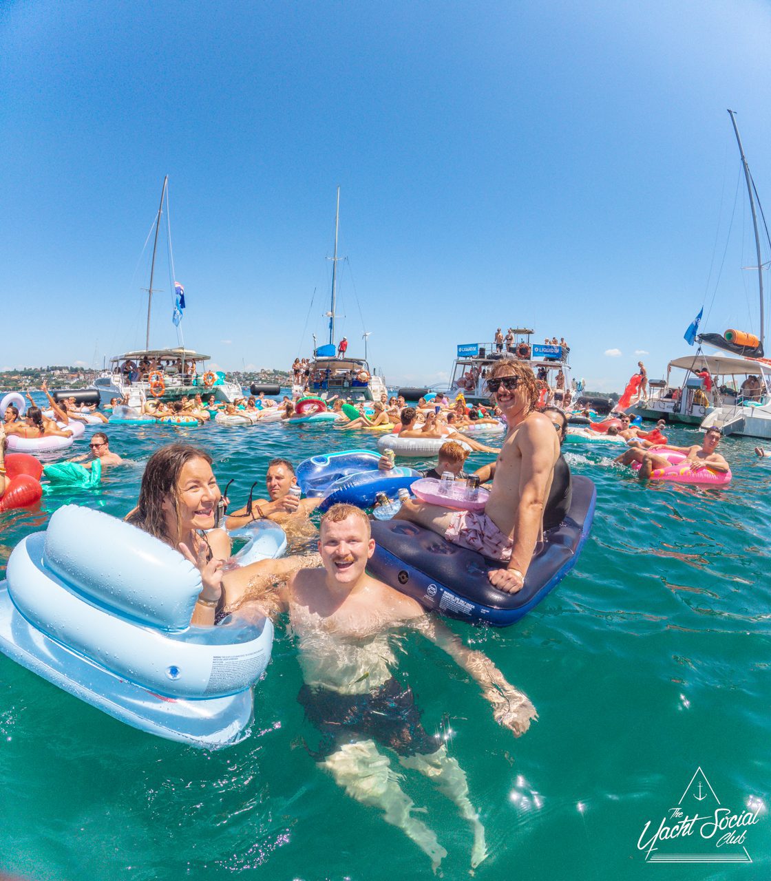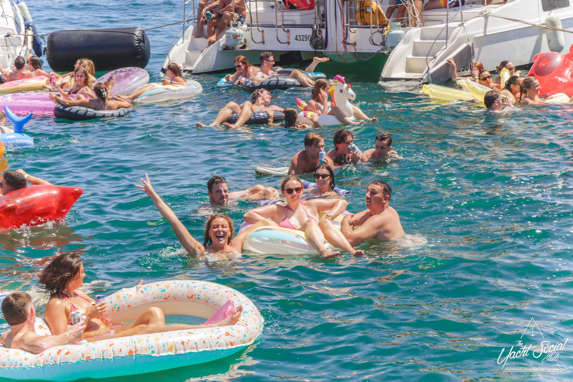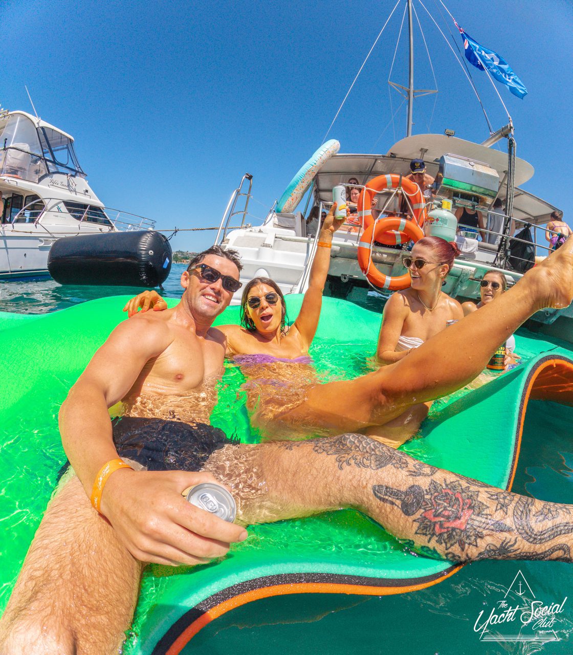 A man in swim trunks smiles and flashes a peace sign while lounging on a colorful inflatable ring in the water; boats and other people on floaties are visible under a clear blue sky. The Yacht Social Club logo appears in the corner.