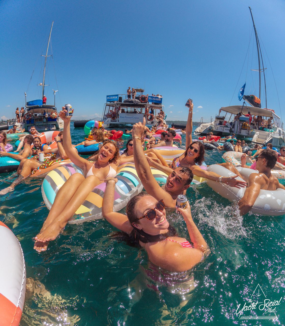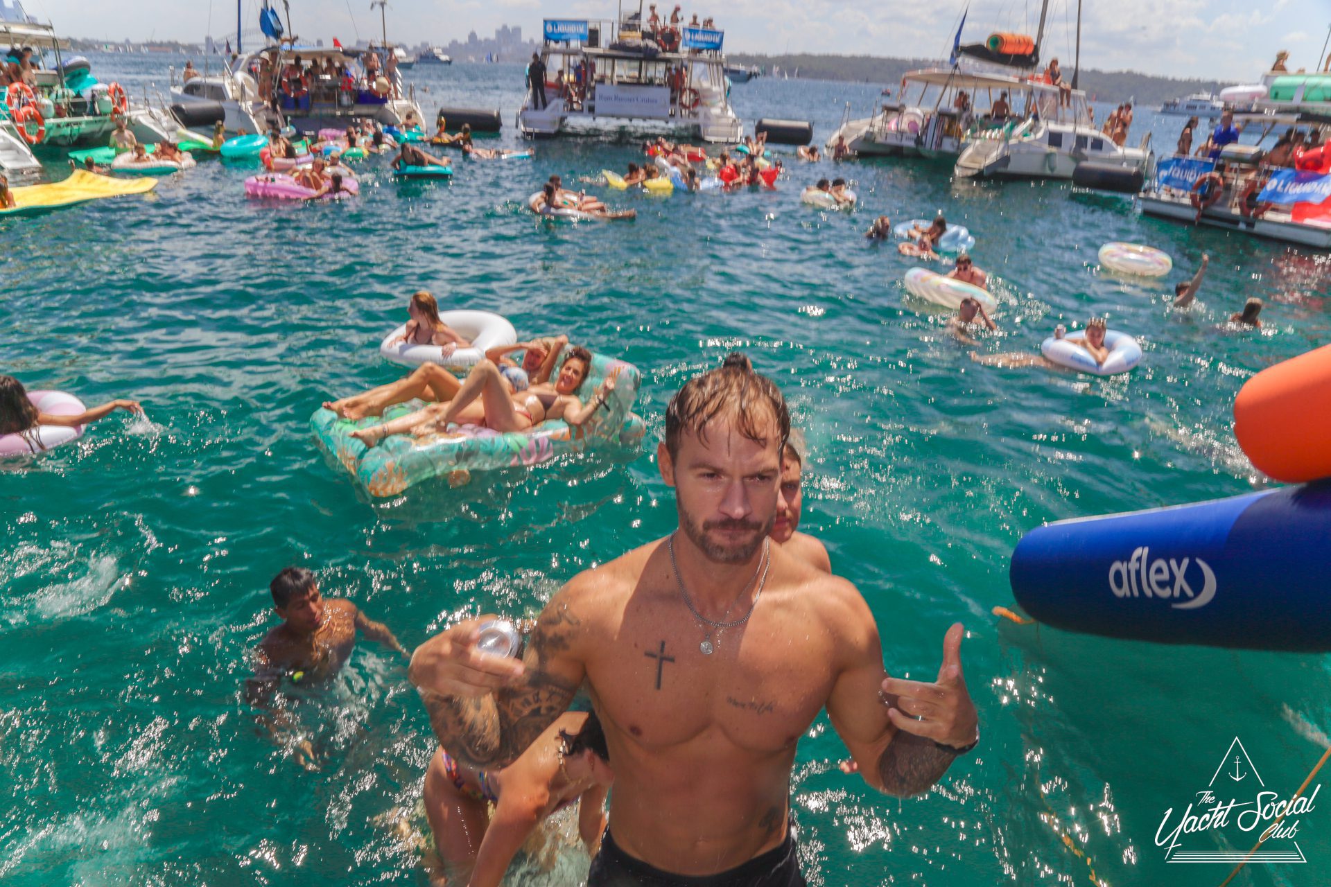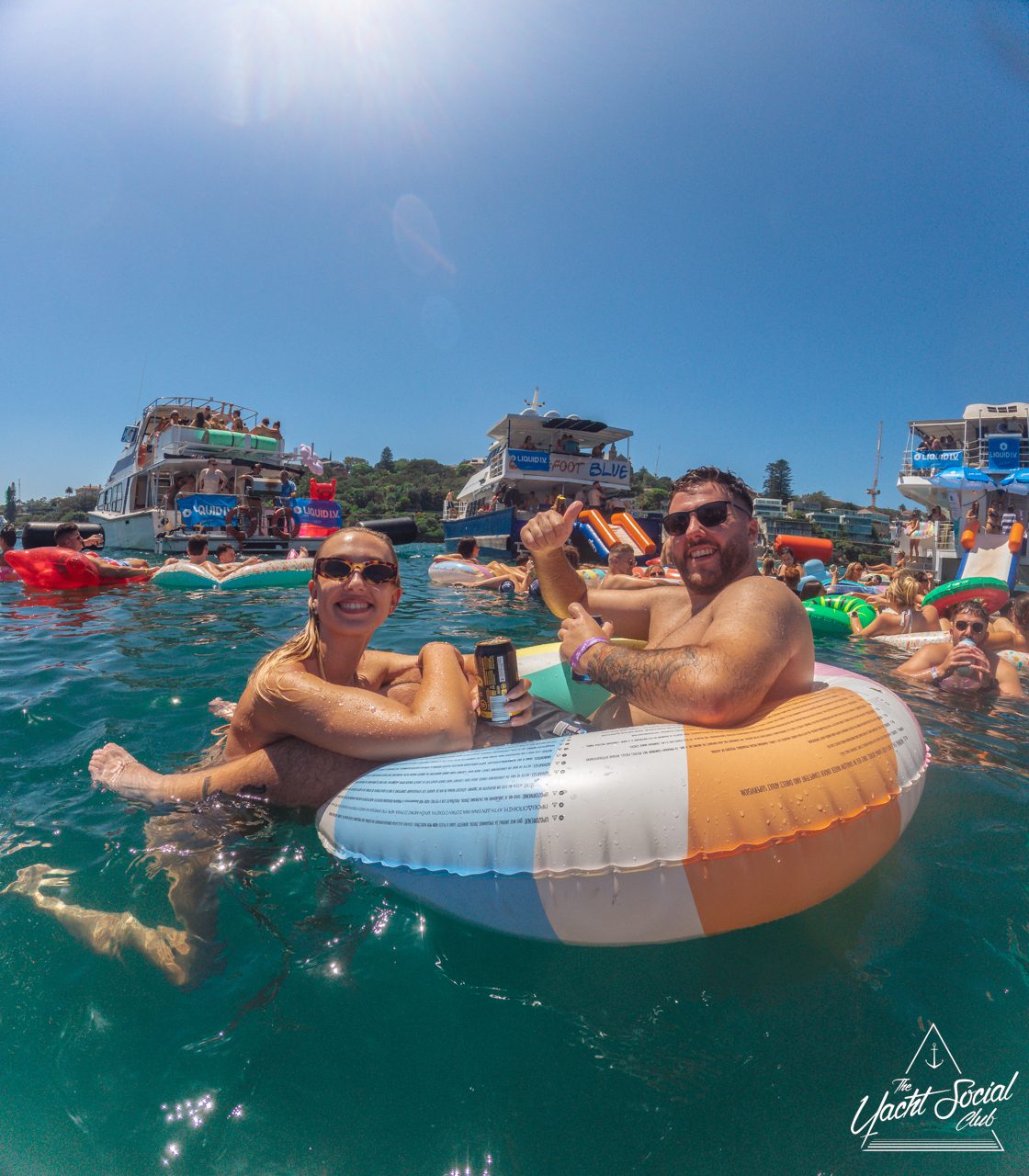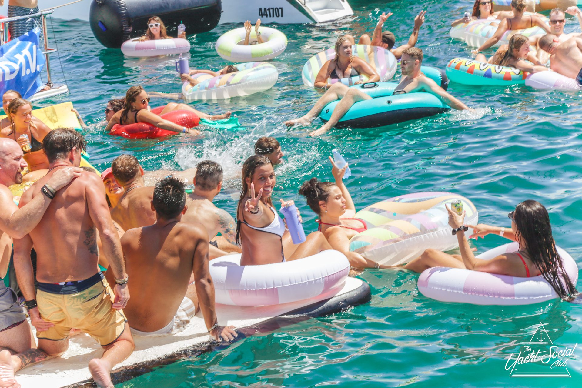 A man in swim trunks smiles and flashes a peace sign while lounging on a colorful inflatable ring in the water; boats and other people on floaties are visible under a clear blue sky. The Yacht Social Club logo appears in the corner.
