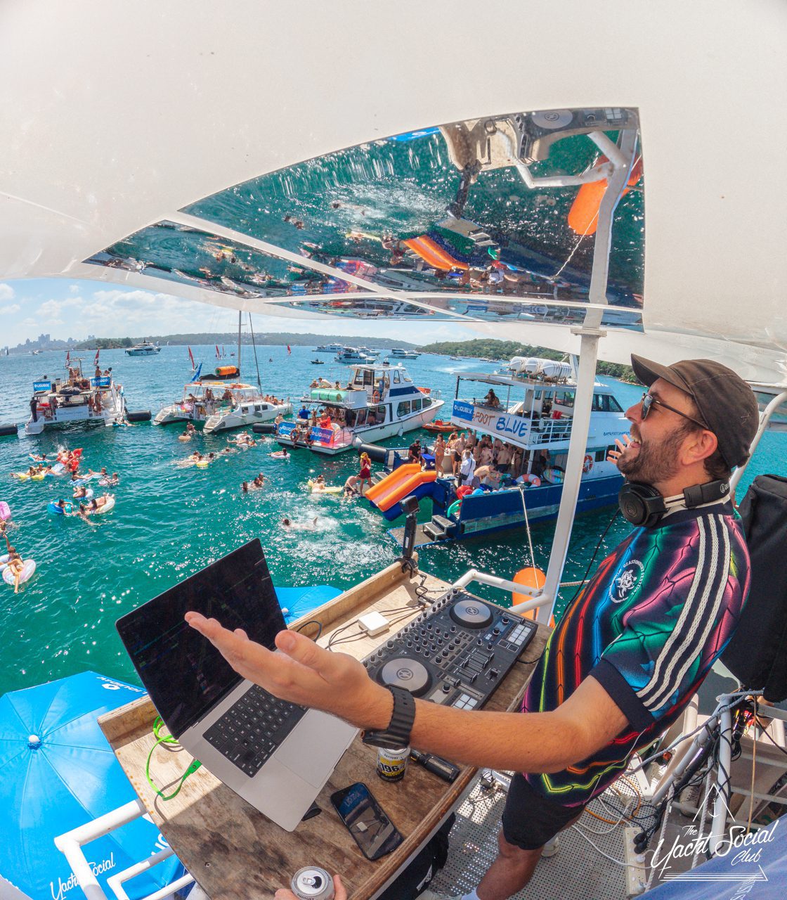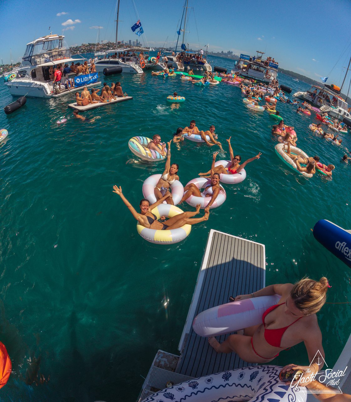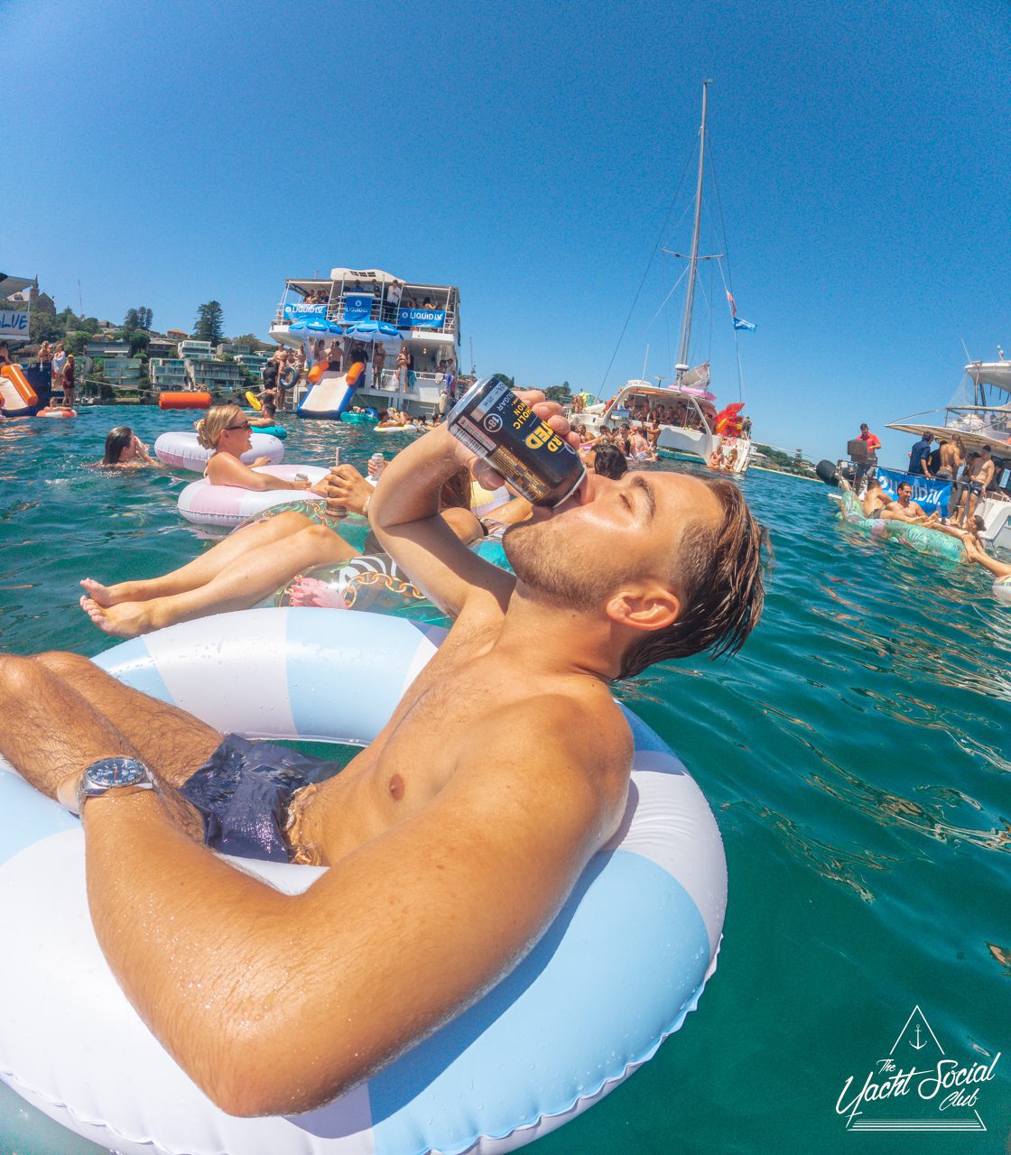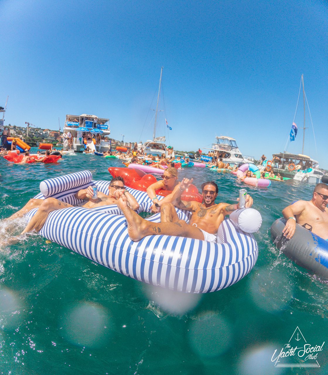 A man in swim trunks smiles and flashes a peace sign while lounging on a colorful inflatable ring in the water; boats and other people on floaties are visible under a clear blue sky. The Yacht Social Club logo appears in the corner.