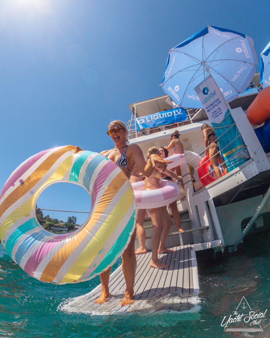 A woman in a bikini sits on a floating dock, smiling and raising a peace sign. Behind her, several people swim and relax on boats in the bright blue water on a sunny day. The logo "Yacht Social Club" is visible in the corner.