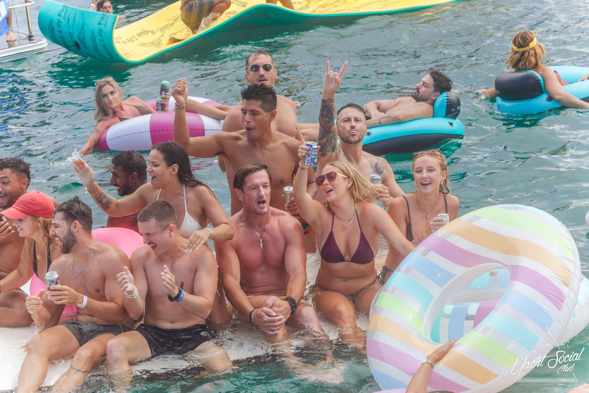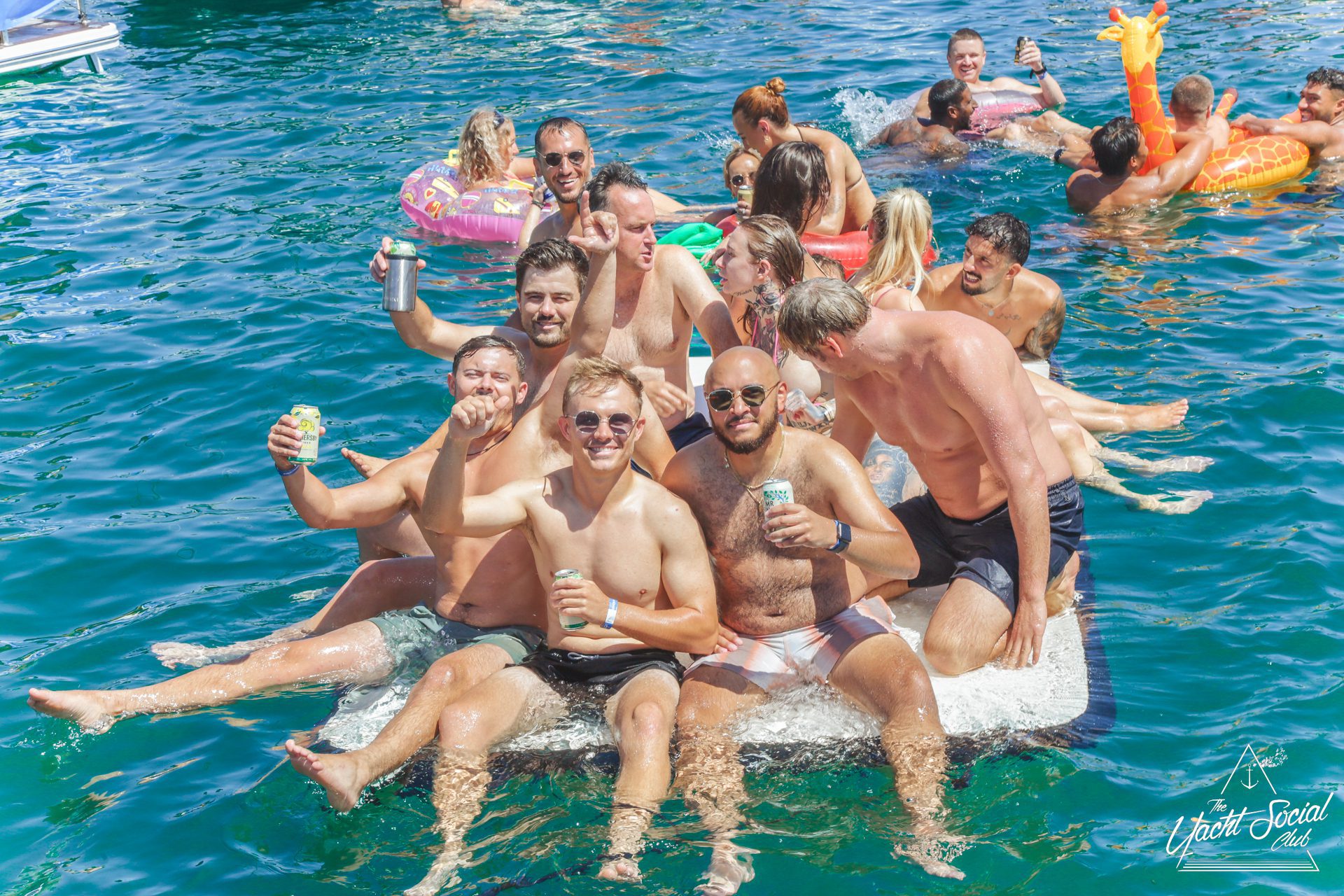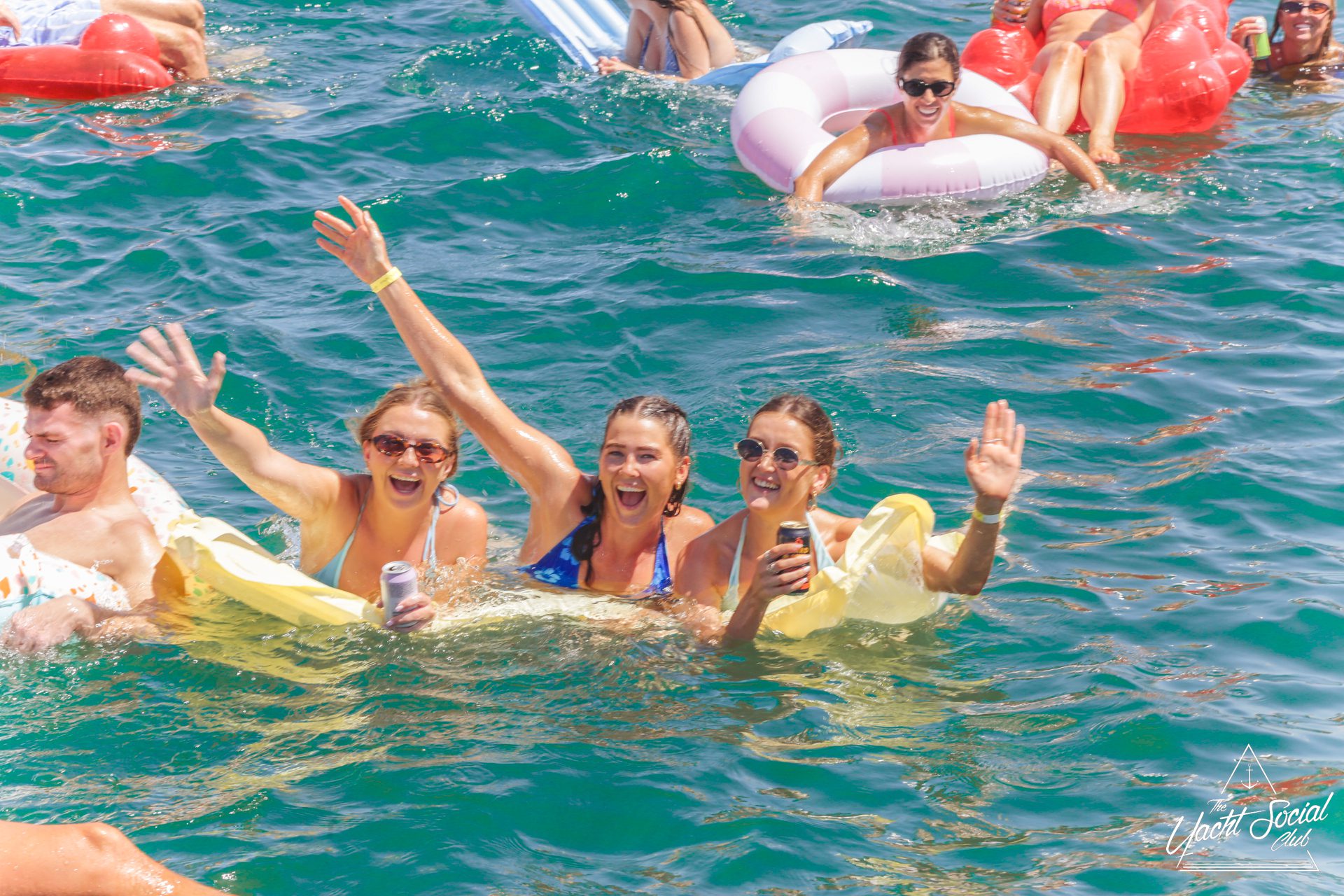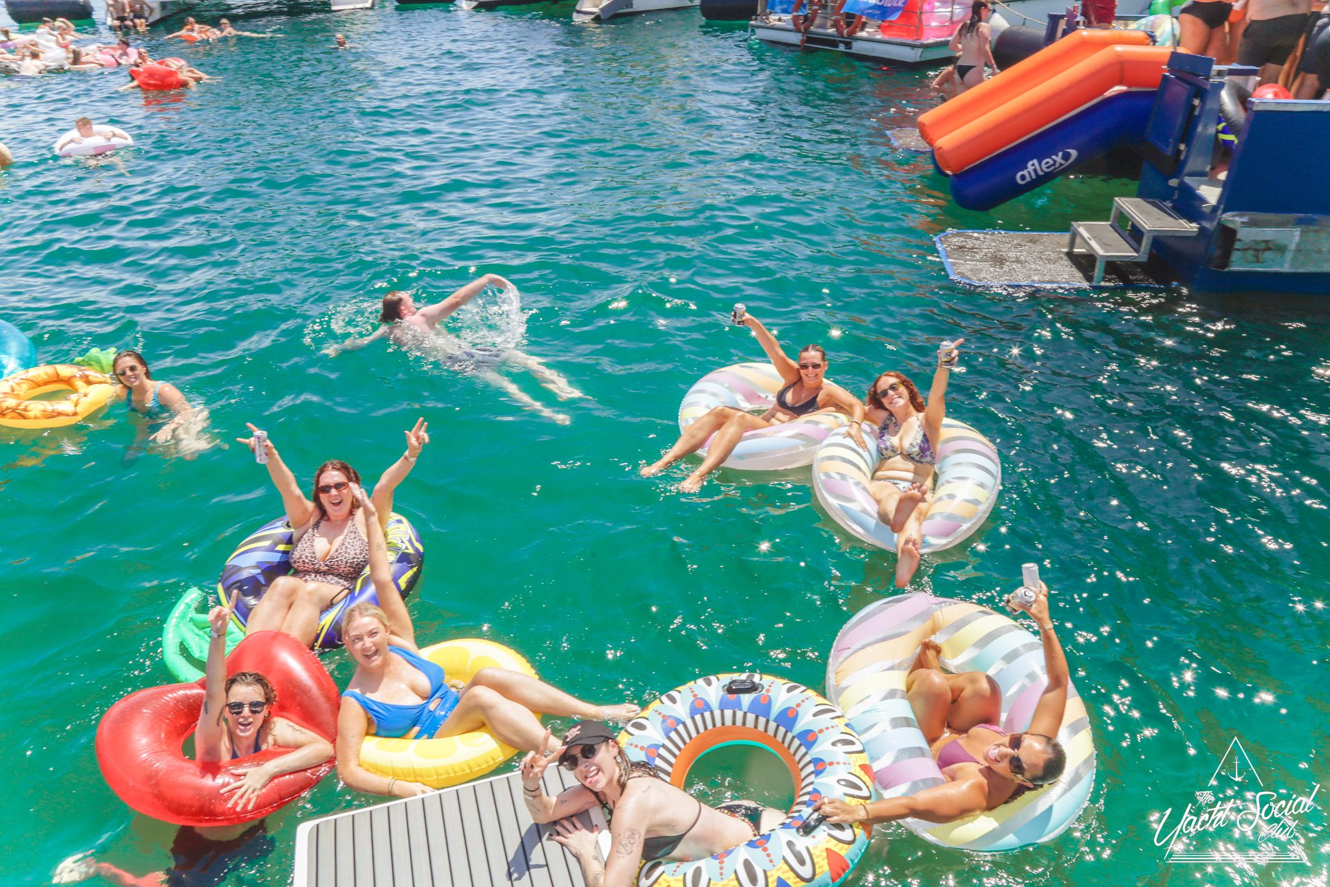 A group of smiling people relax on inflatables in clear blue water near a party boat, enjoying drinks and making peace signs on a sunny day. Other boats and a slide are visible in the background.