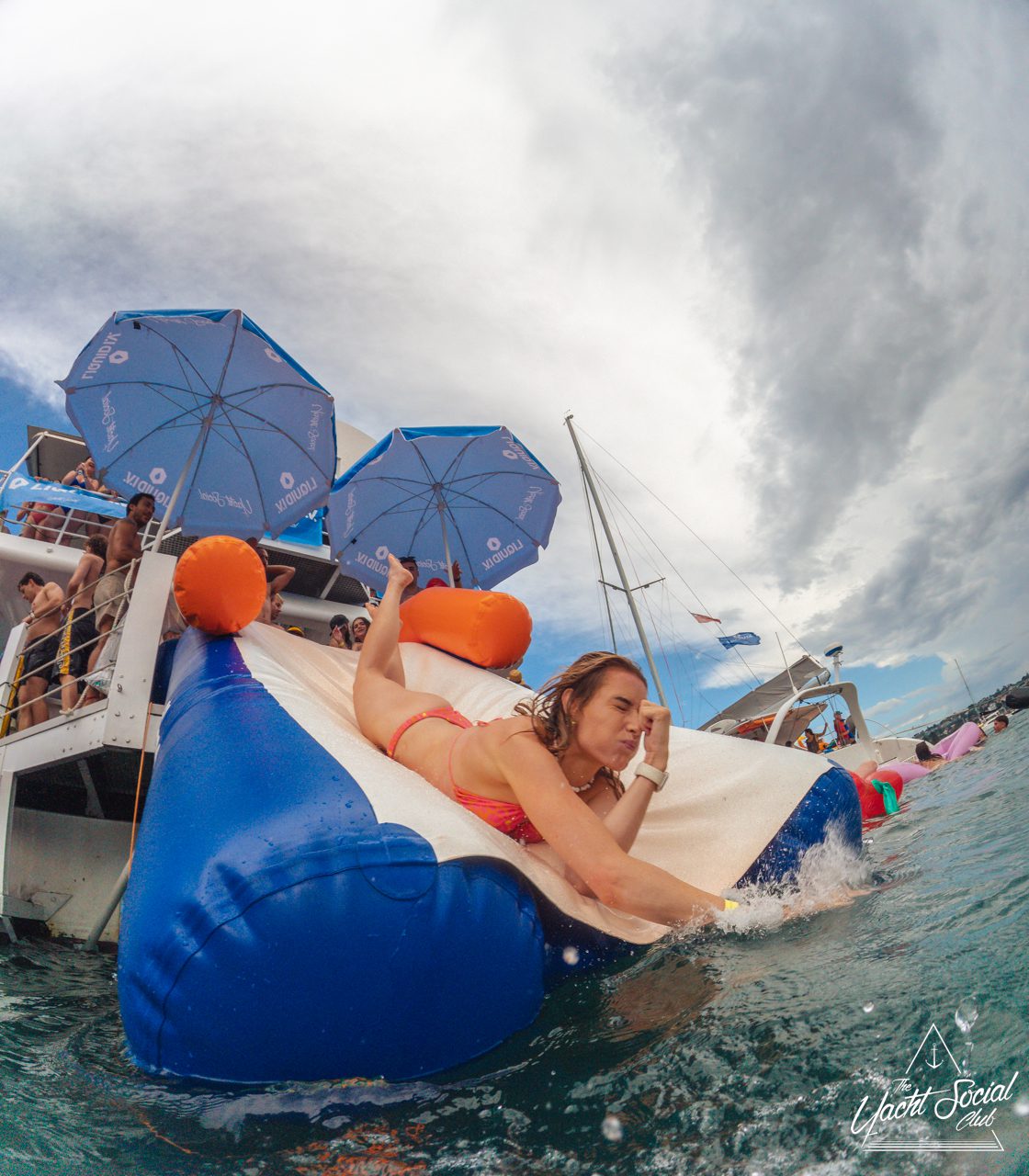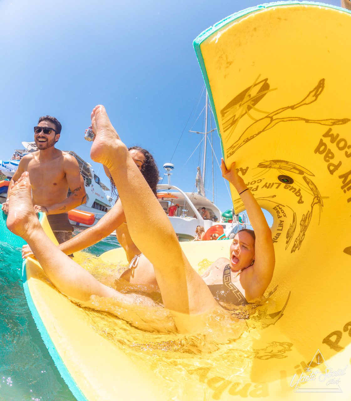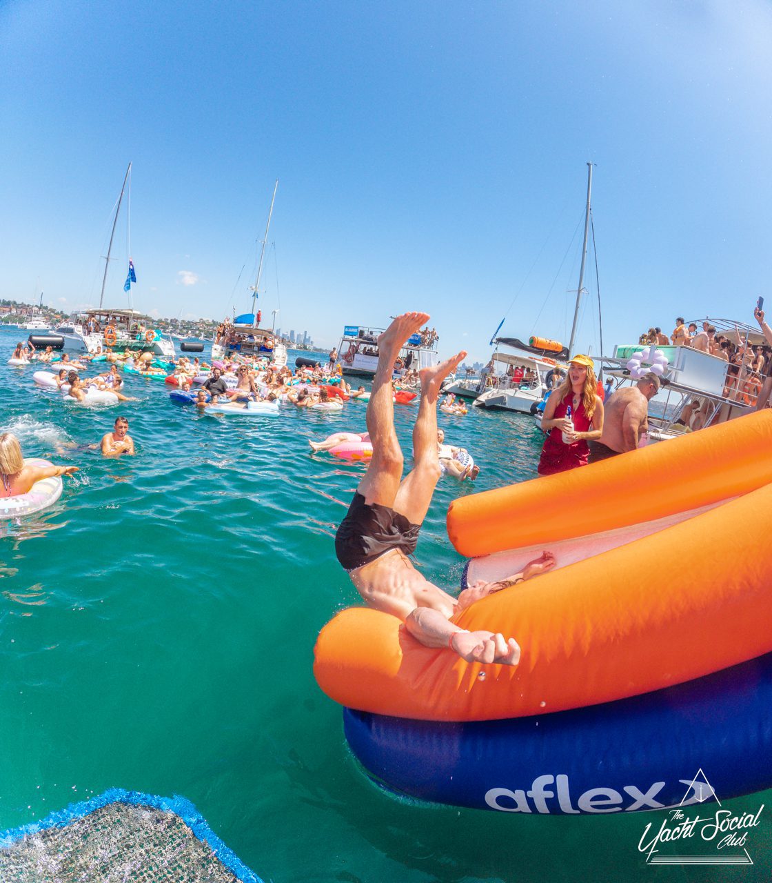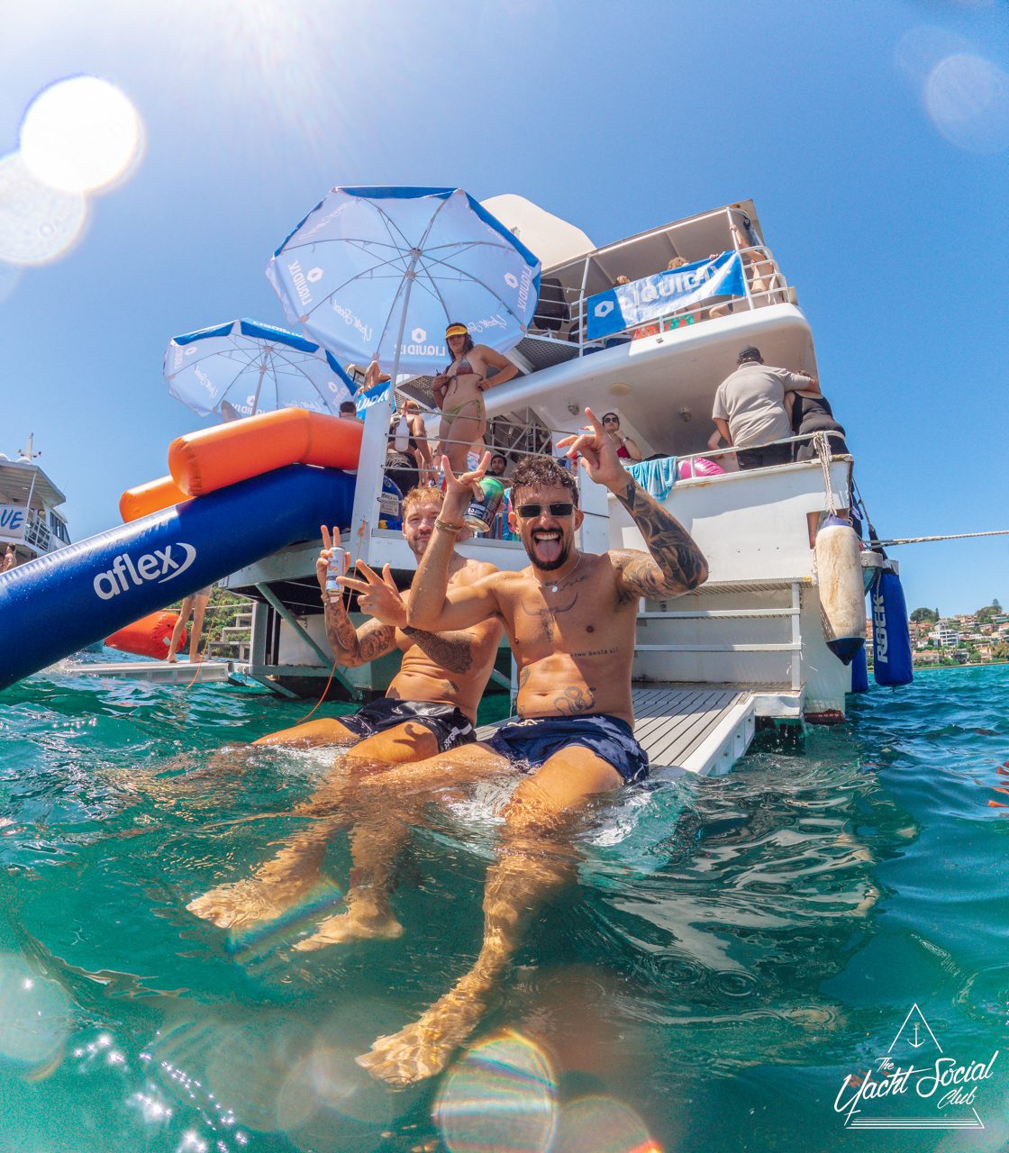 A group of smiling people relax on inflatables in clear blue water near a party boat, enjoying drinks and making peace signs on a sunny day. Other boats and a slide are visible in the background.