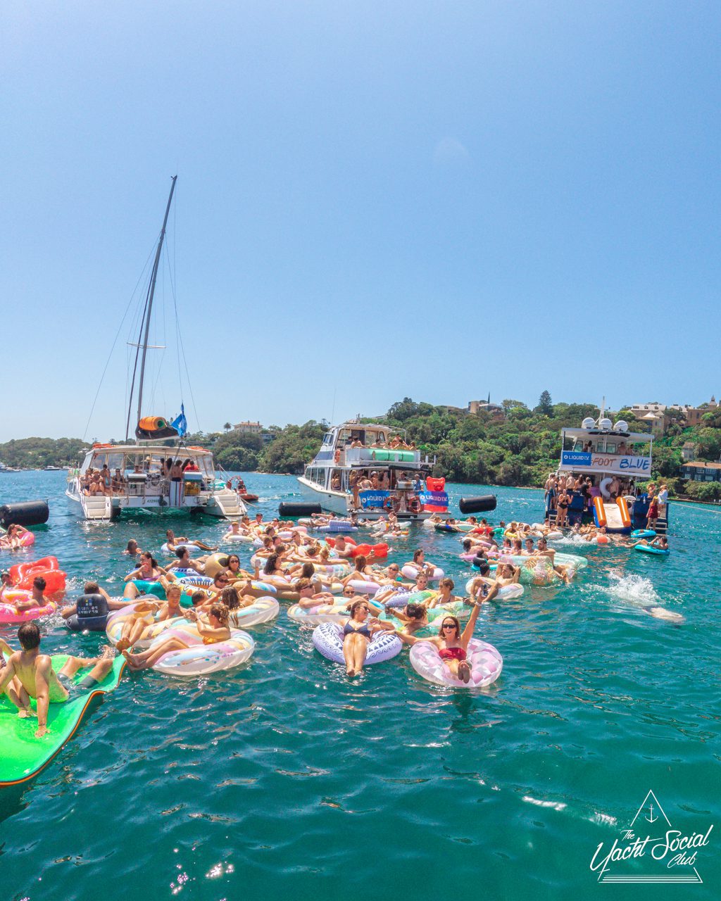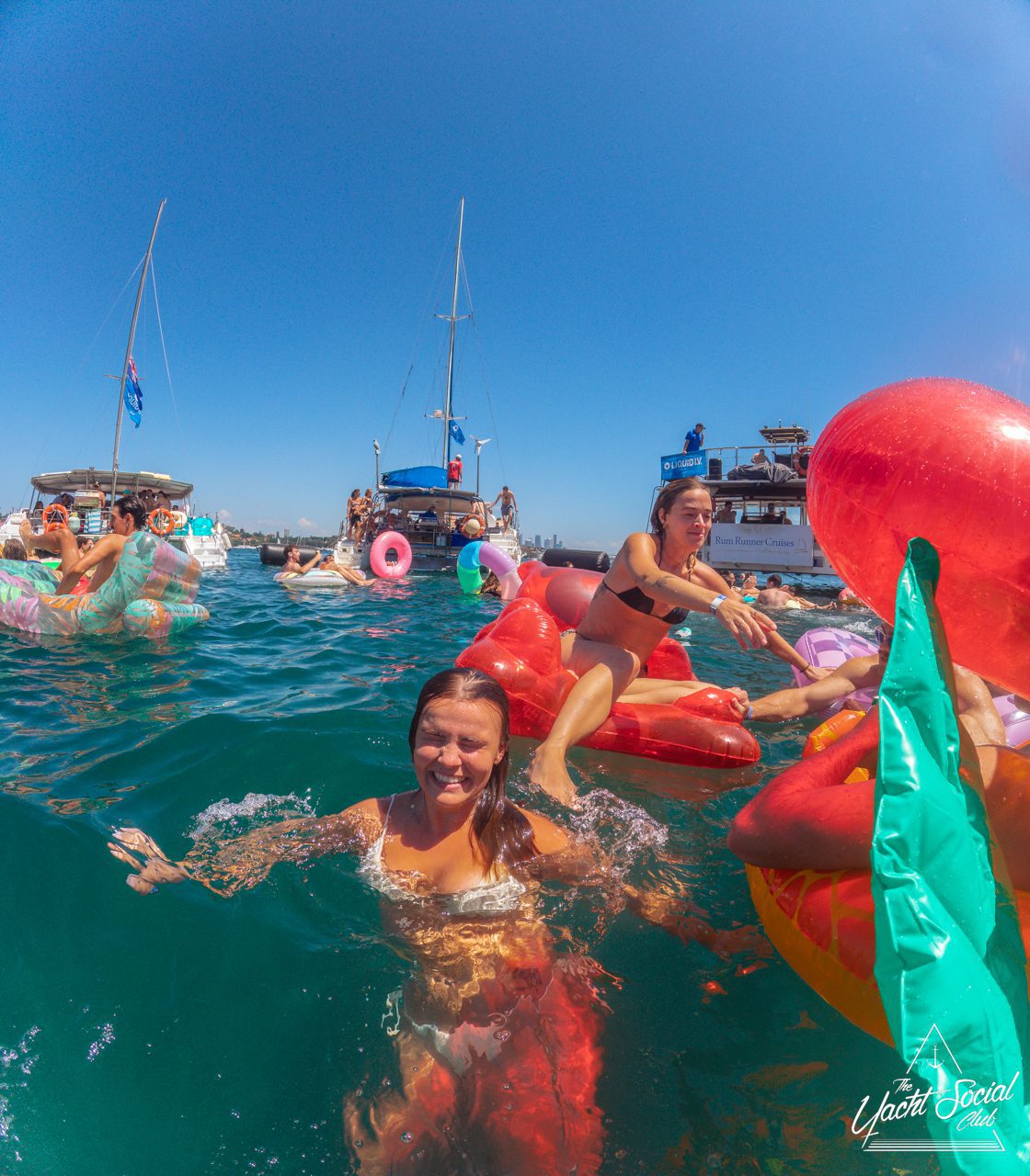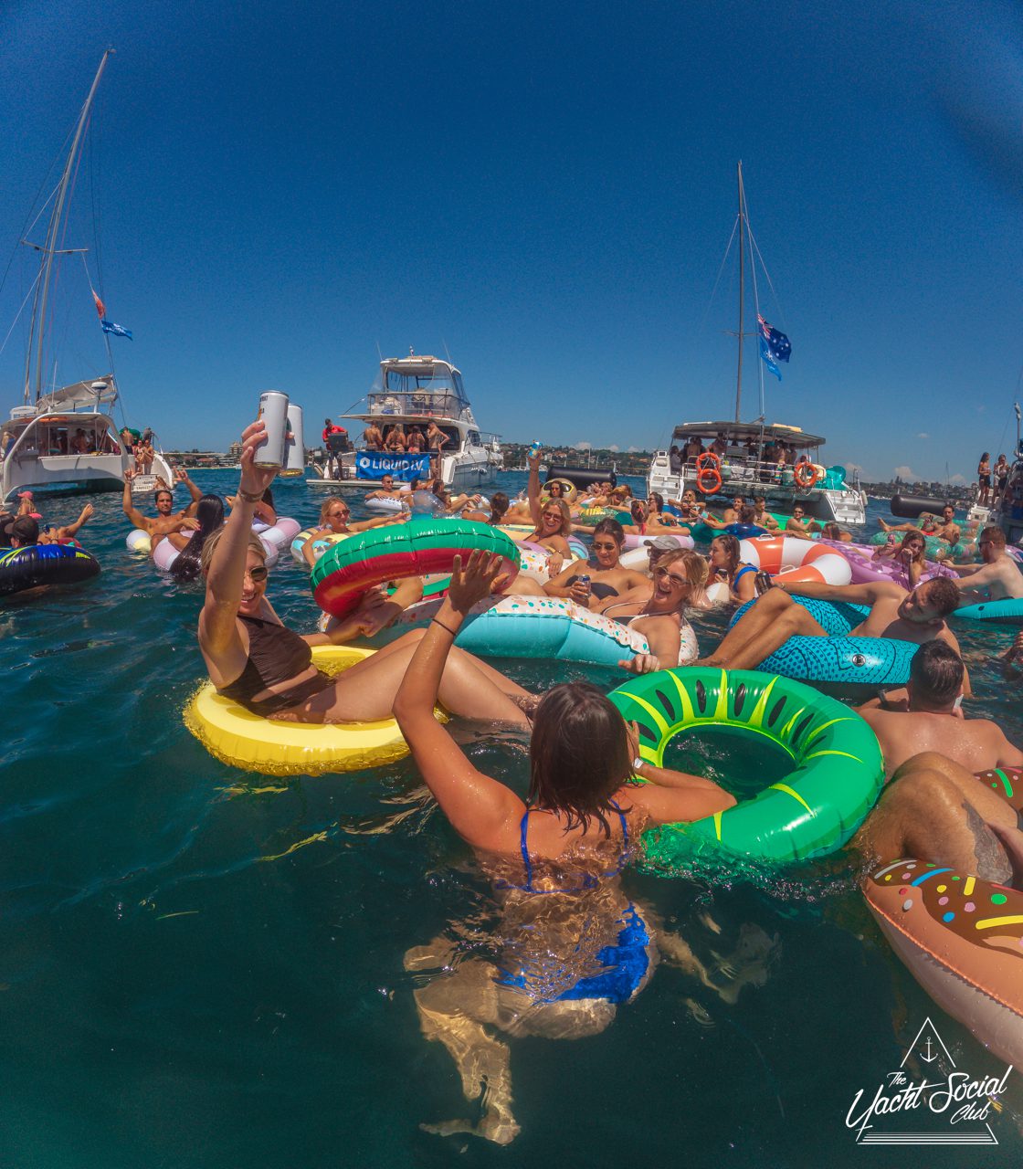 A group of people relaxing on colorful pool floats in the ocean near yachts, enjoying drinks and sunny weather at a social boat party. Blue sky and boats are visible in the background.