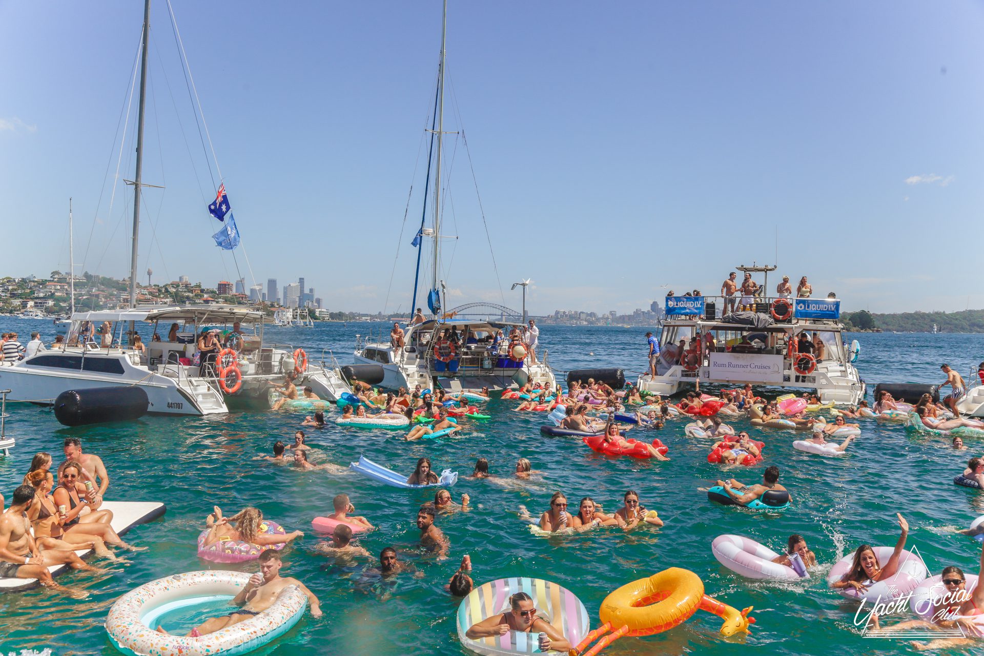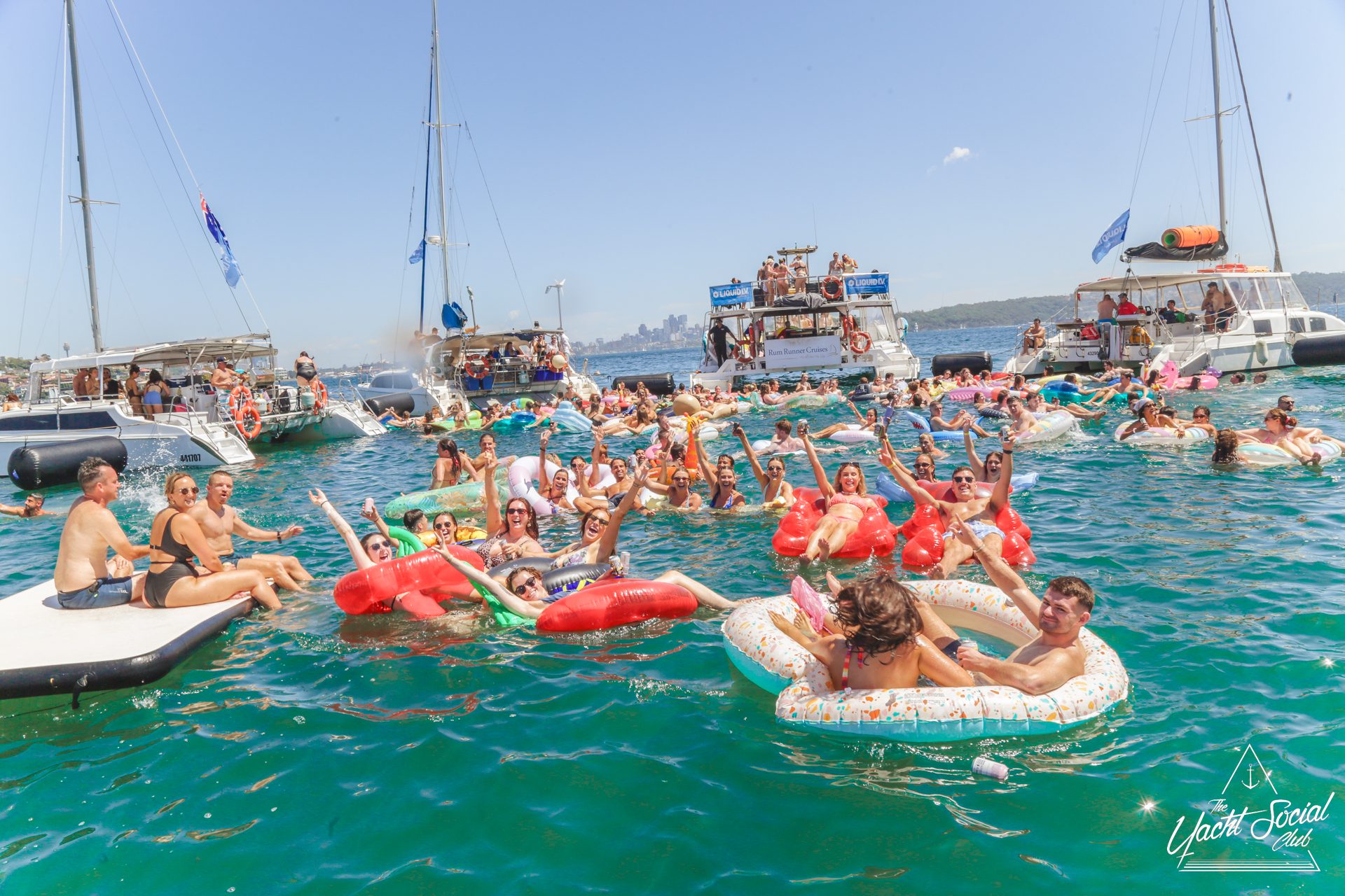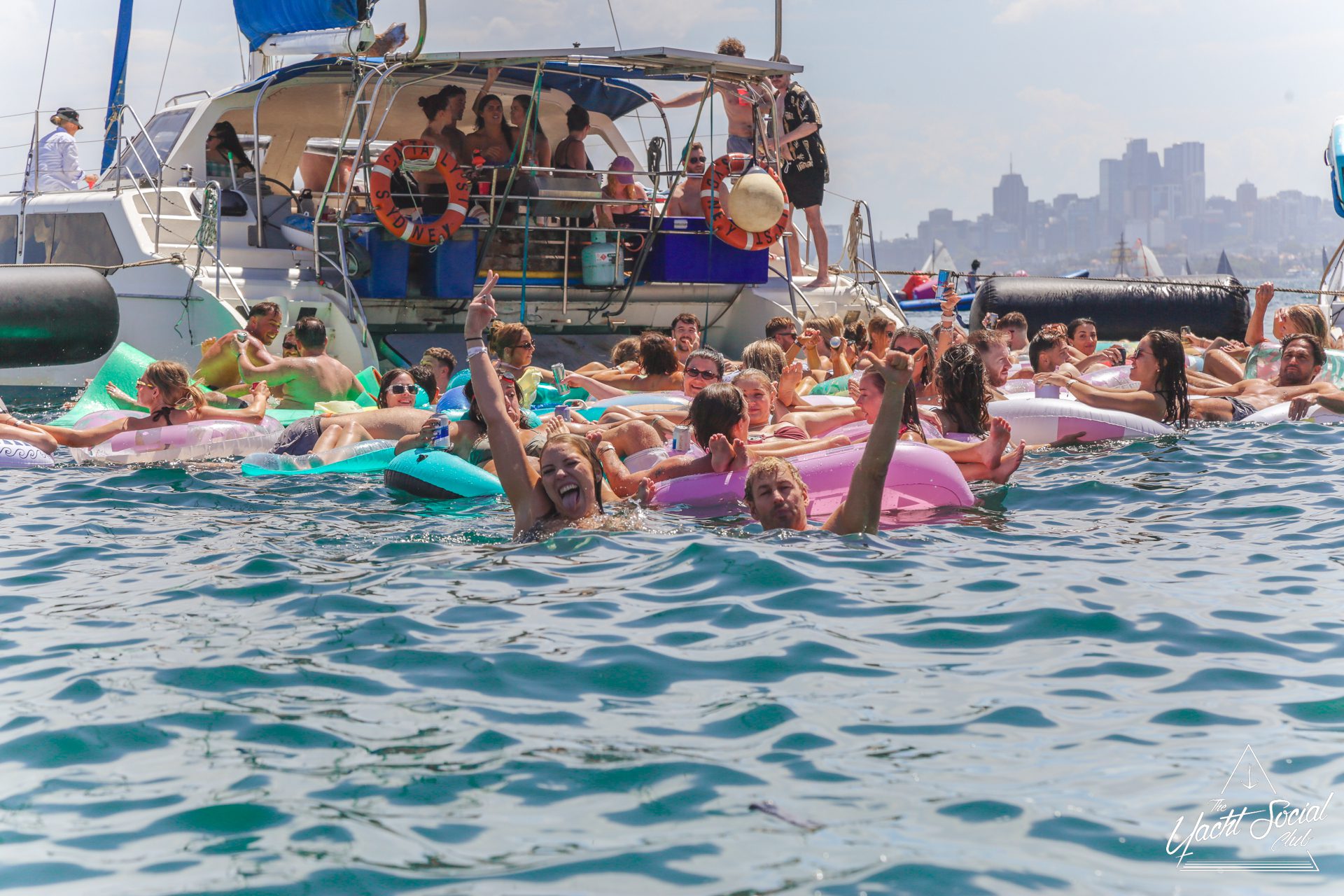 A group of people relaxing on colorful pool floats in the ocean near yachts, enjoying drinks and sunny weather at a social boat party. Blue sky and boats are visible in the background.