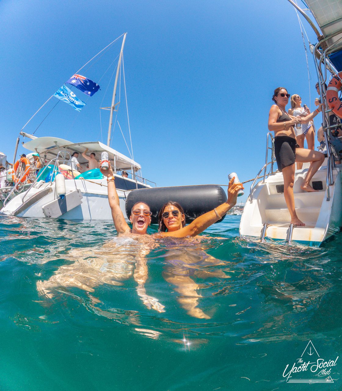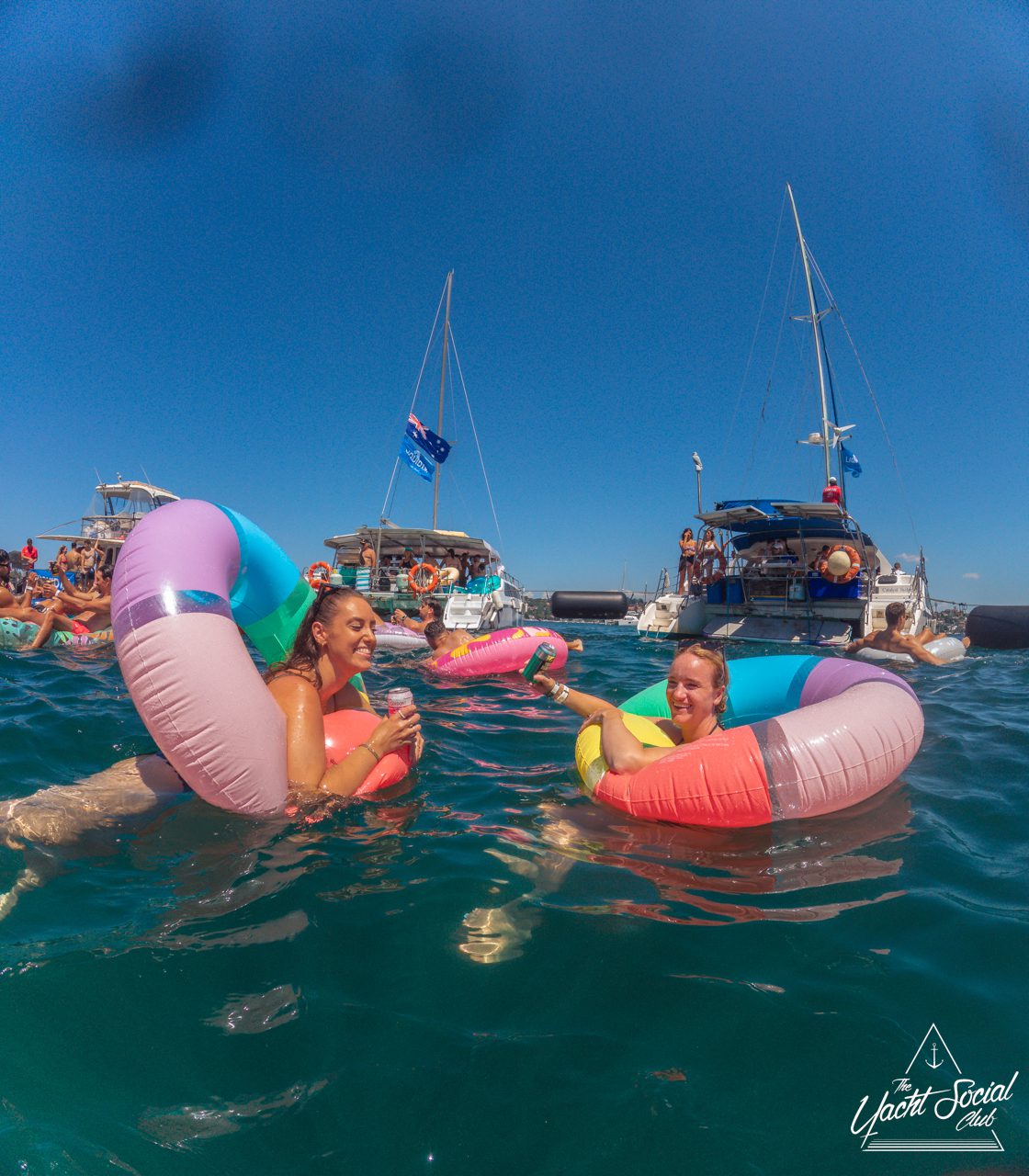 Two women in swimsuits relax on colorful inflatable rings in clear blue water, raising drinks and smiling. Boats and people are in the background, and an Australian flag waves in the sunlit sky.
