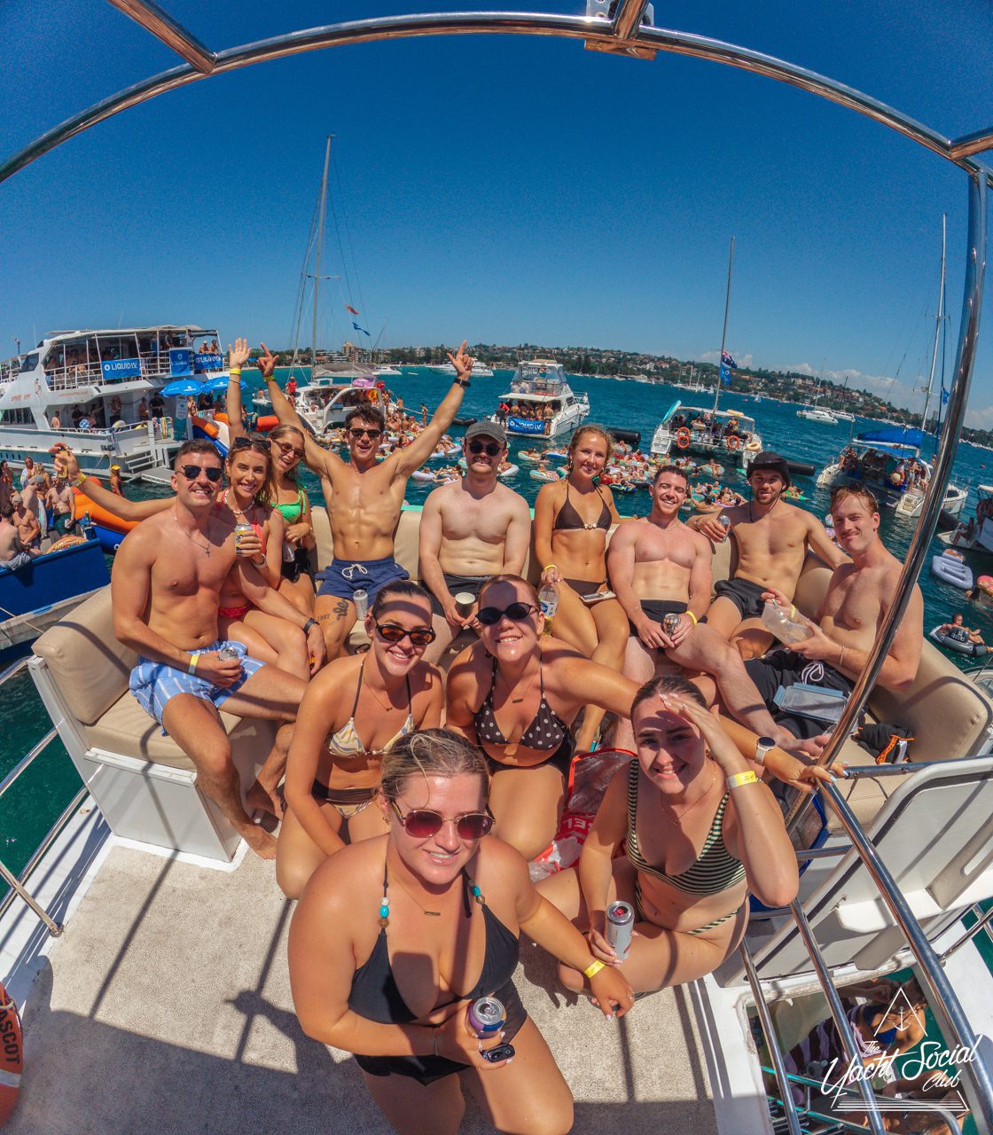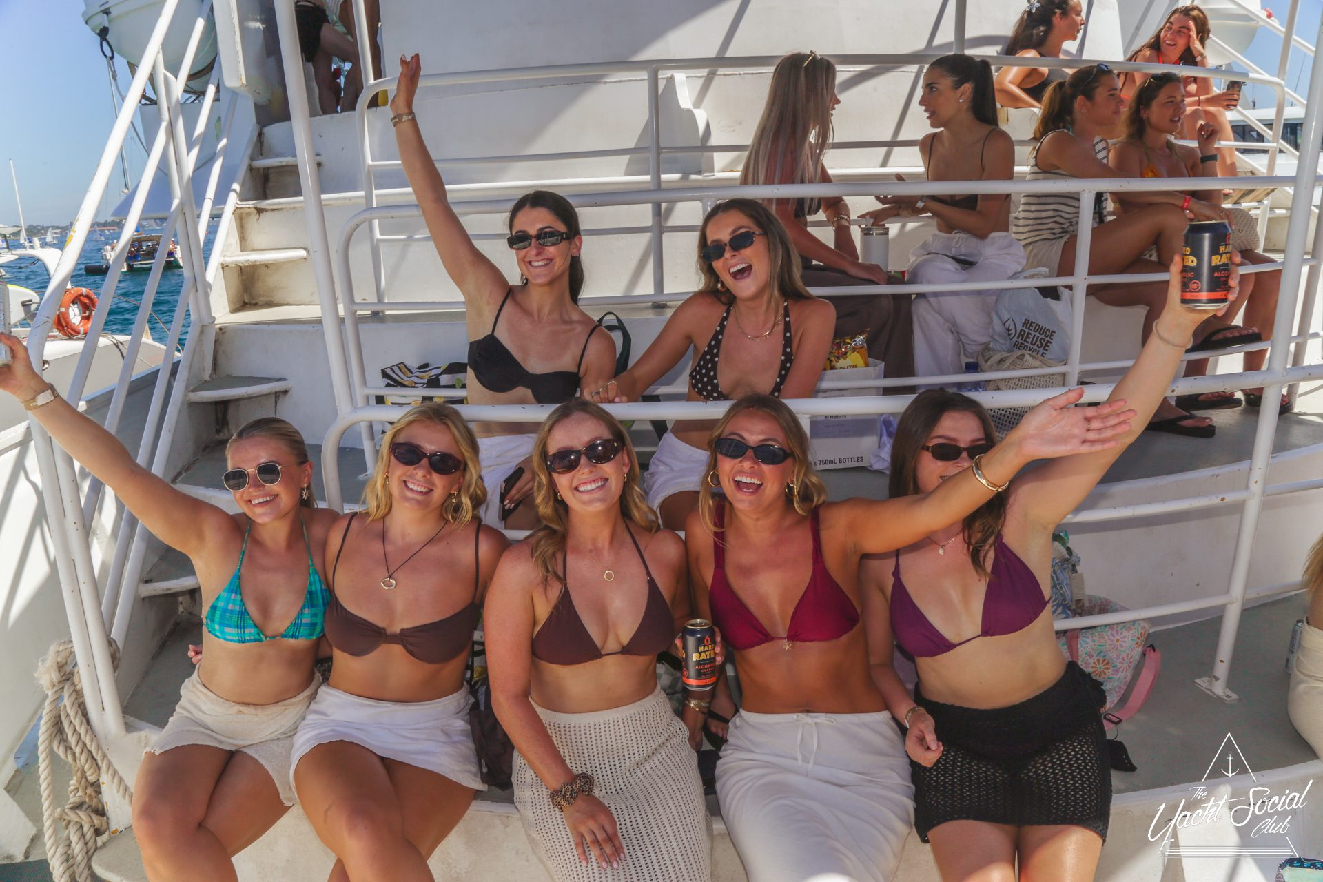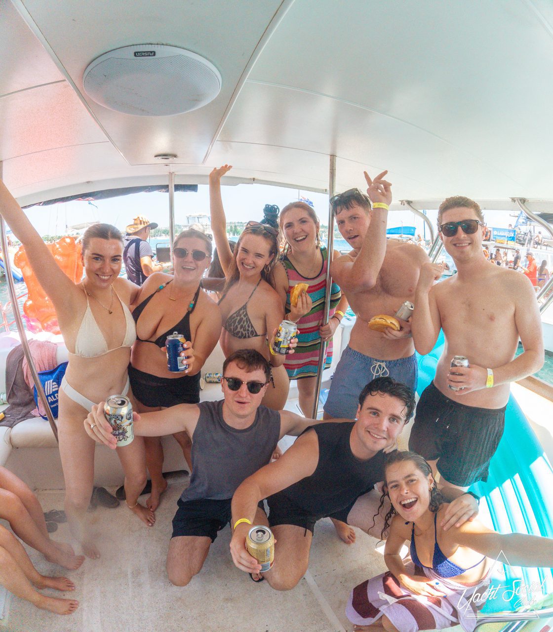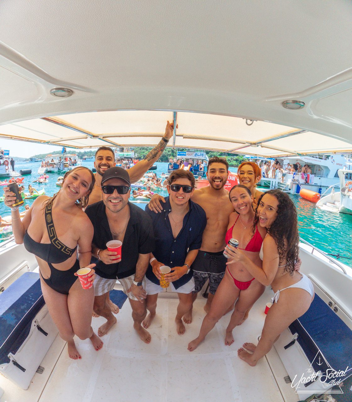A group of young adults smile and pose with drinks on a boat, wearing swimsuits. Other people relax in the background, with more boats and water visible behind them on a sunny day.