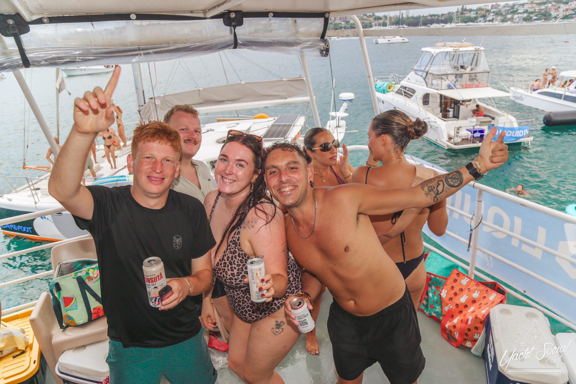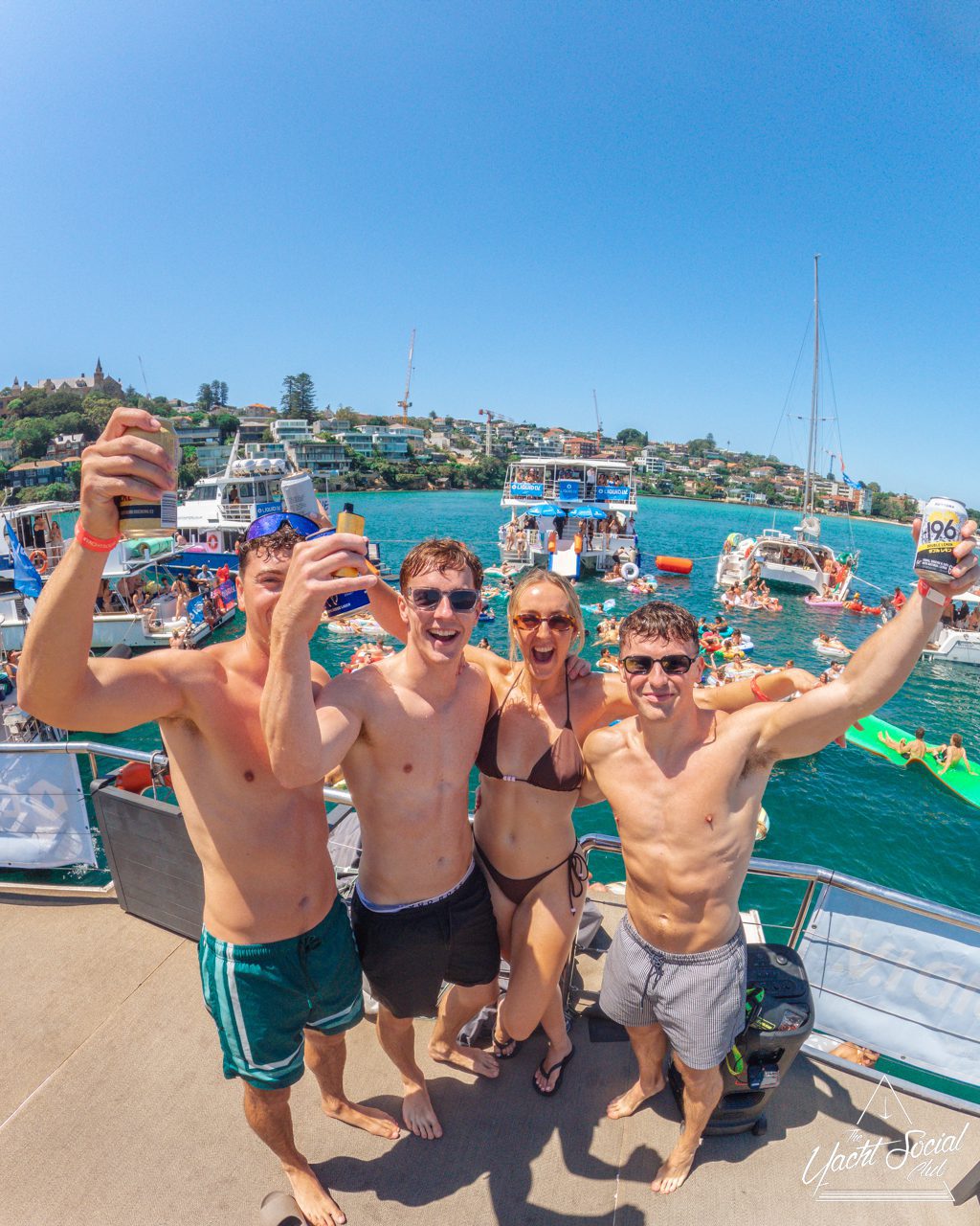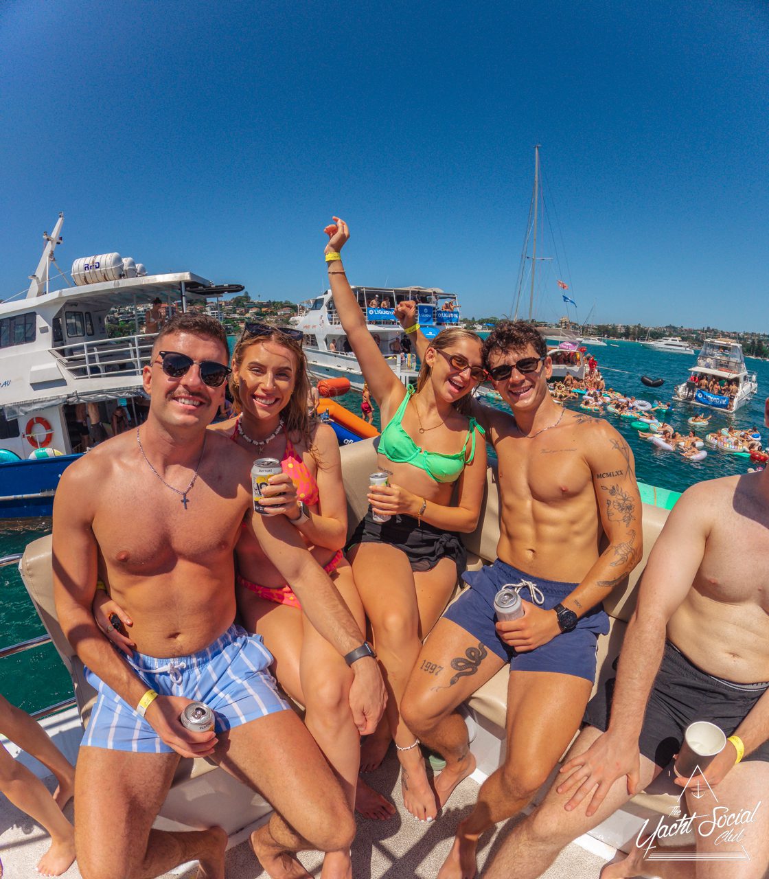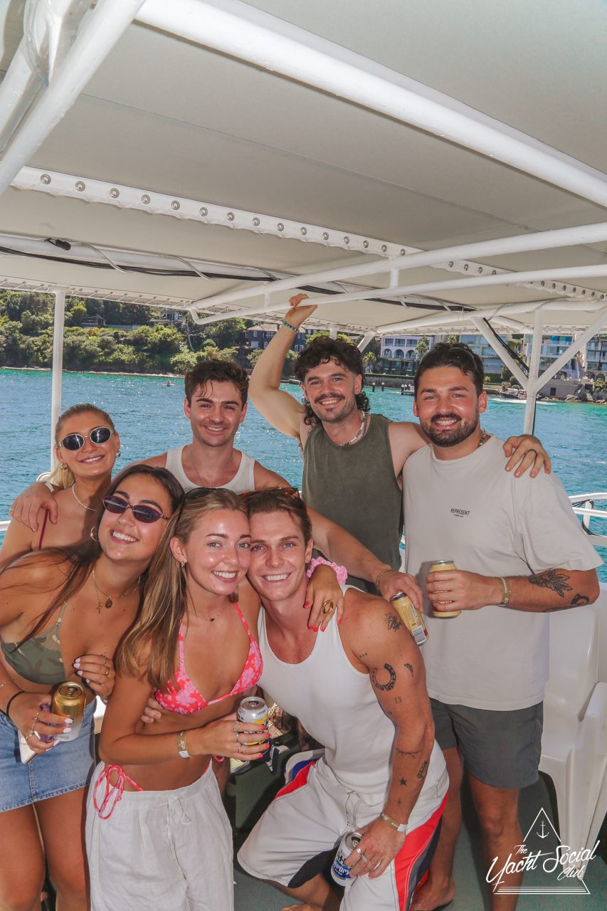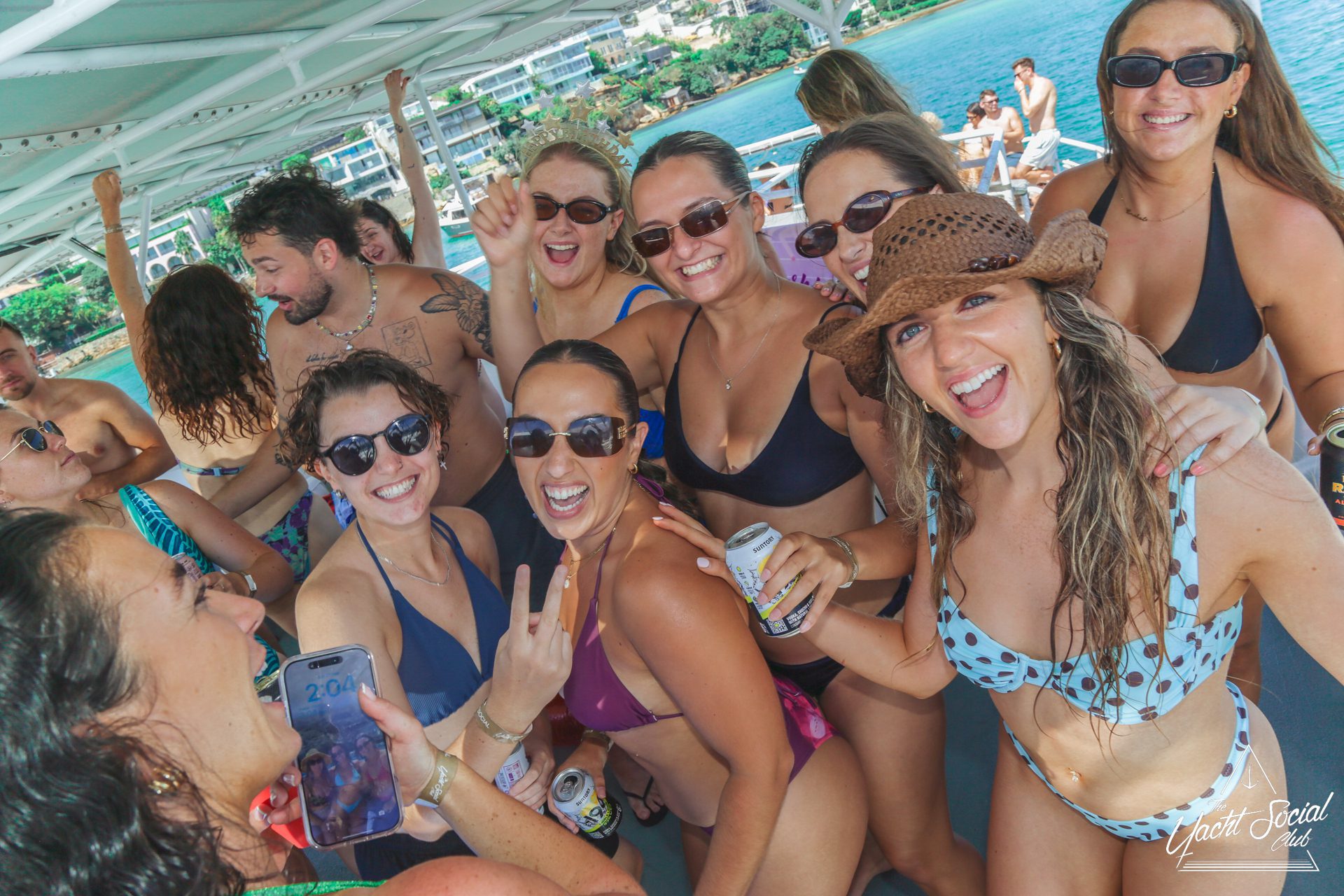 A group of young adults smile and pose with drinks on a boat, wearing swimsuits. Other people relax in the background, with more boats and water visible behind them on a sunny day.