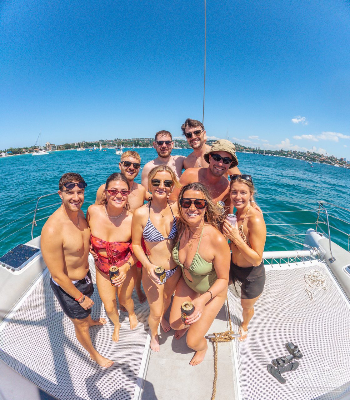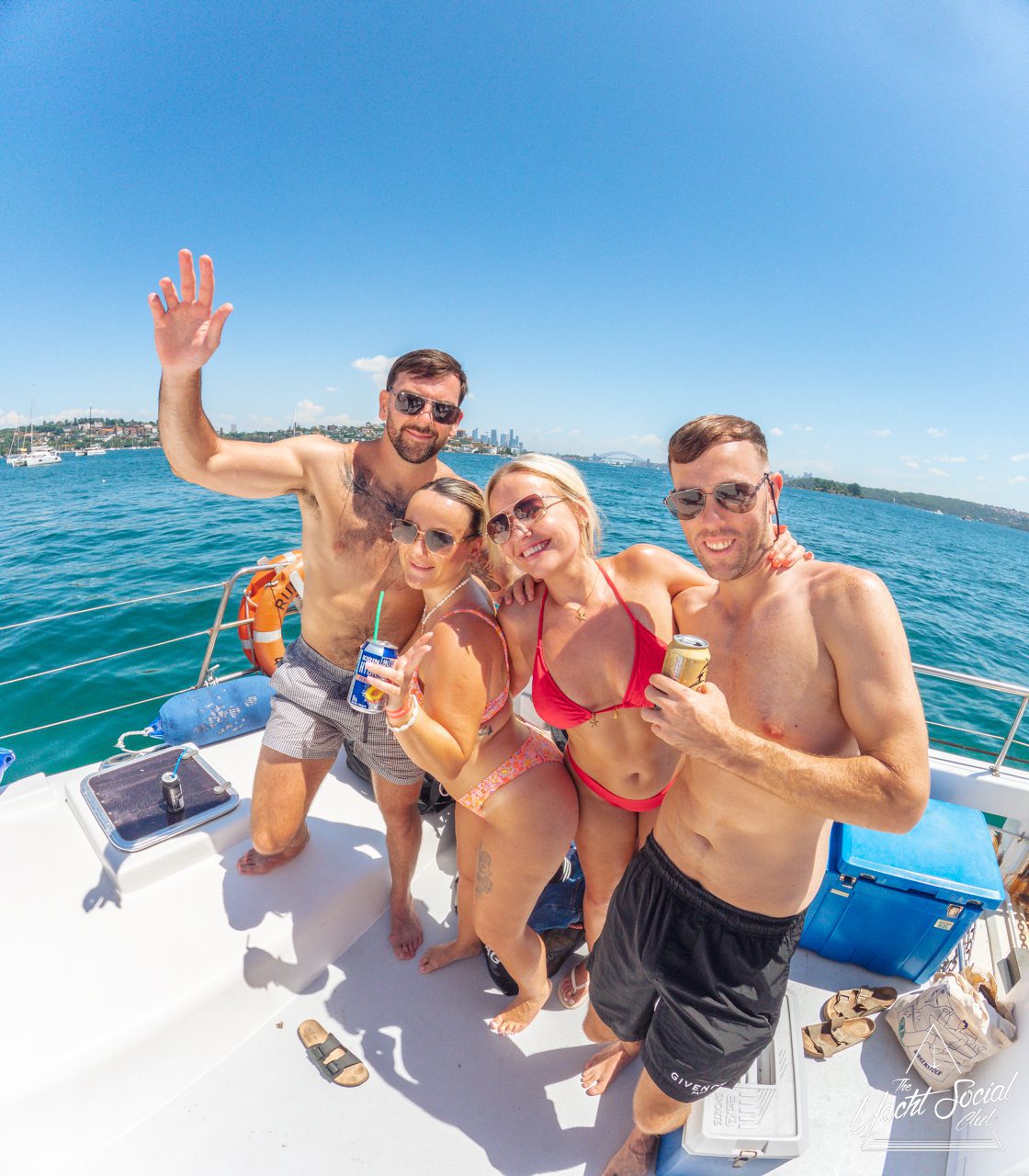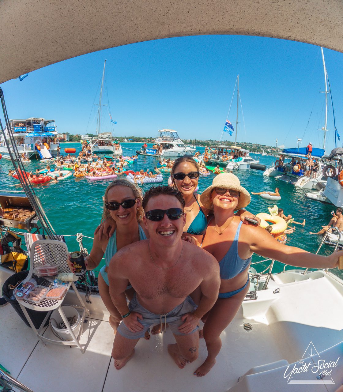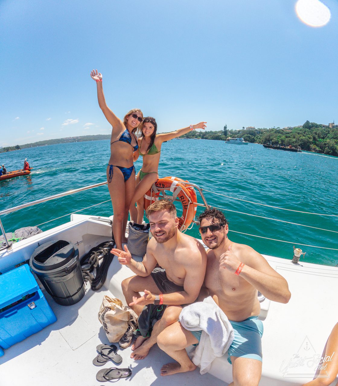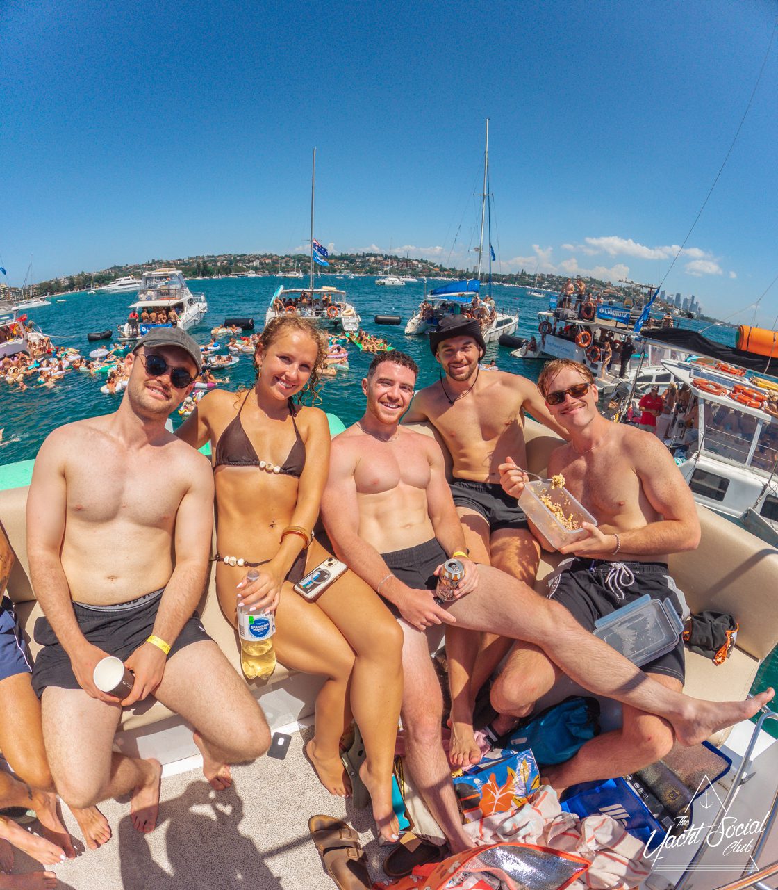 A group of young adults smile and pose with drinks on a boat, wearing swimsuits. Other people relax in the background, with more boats and water visible behind them on a sunny day.