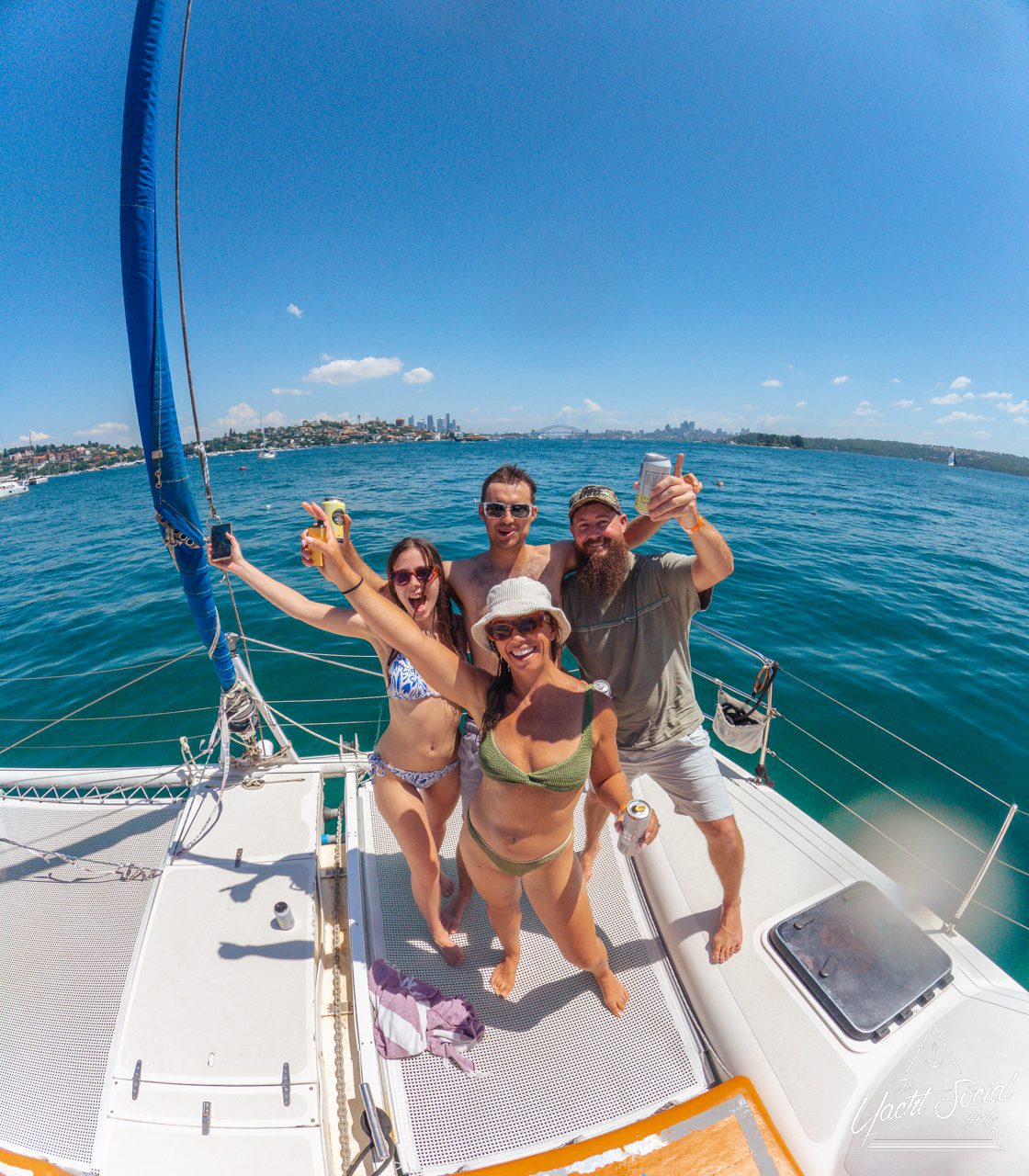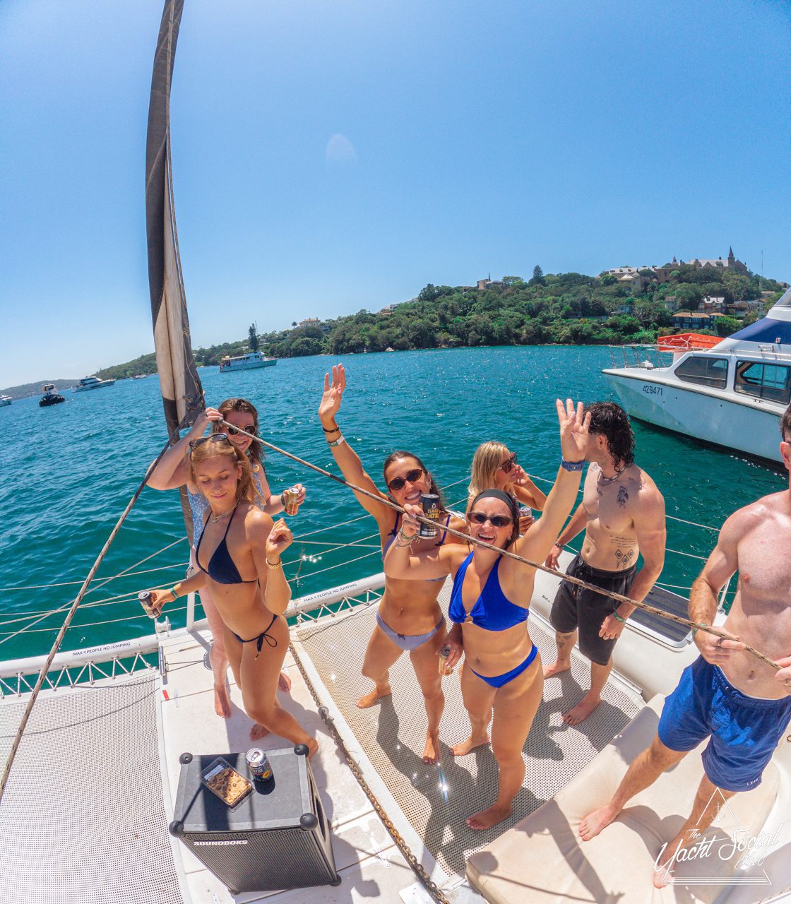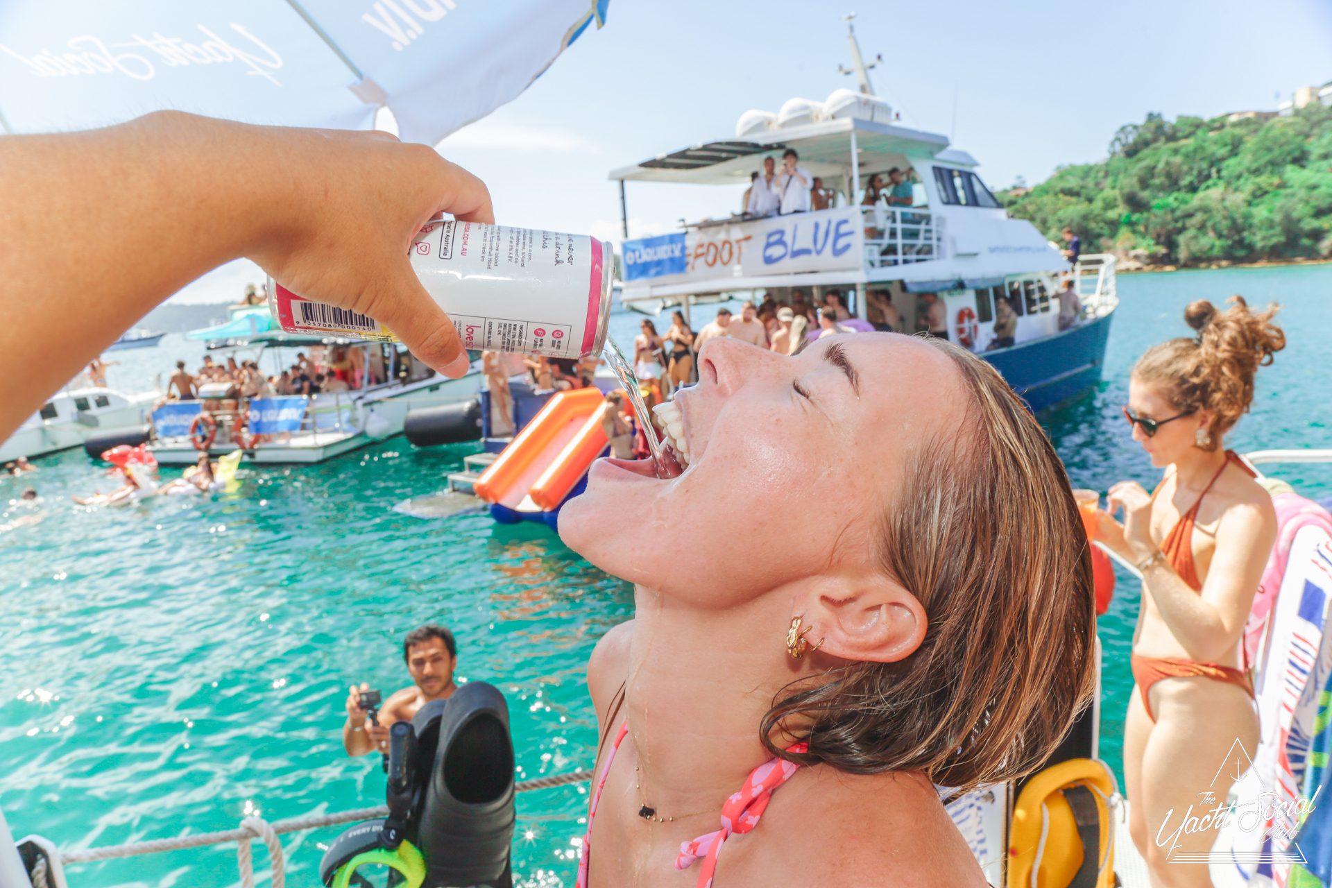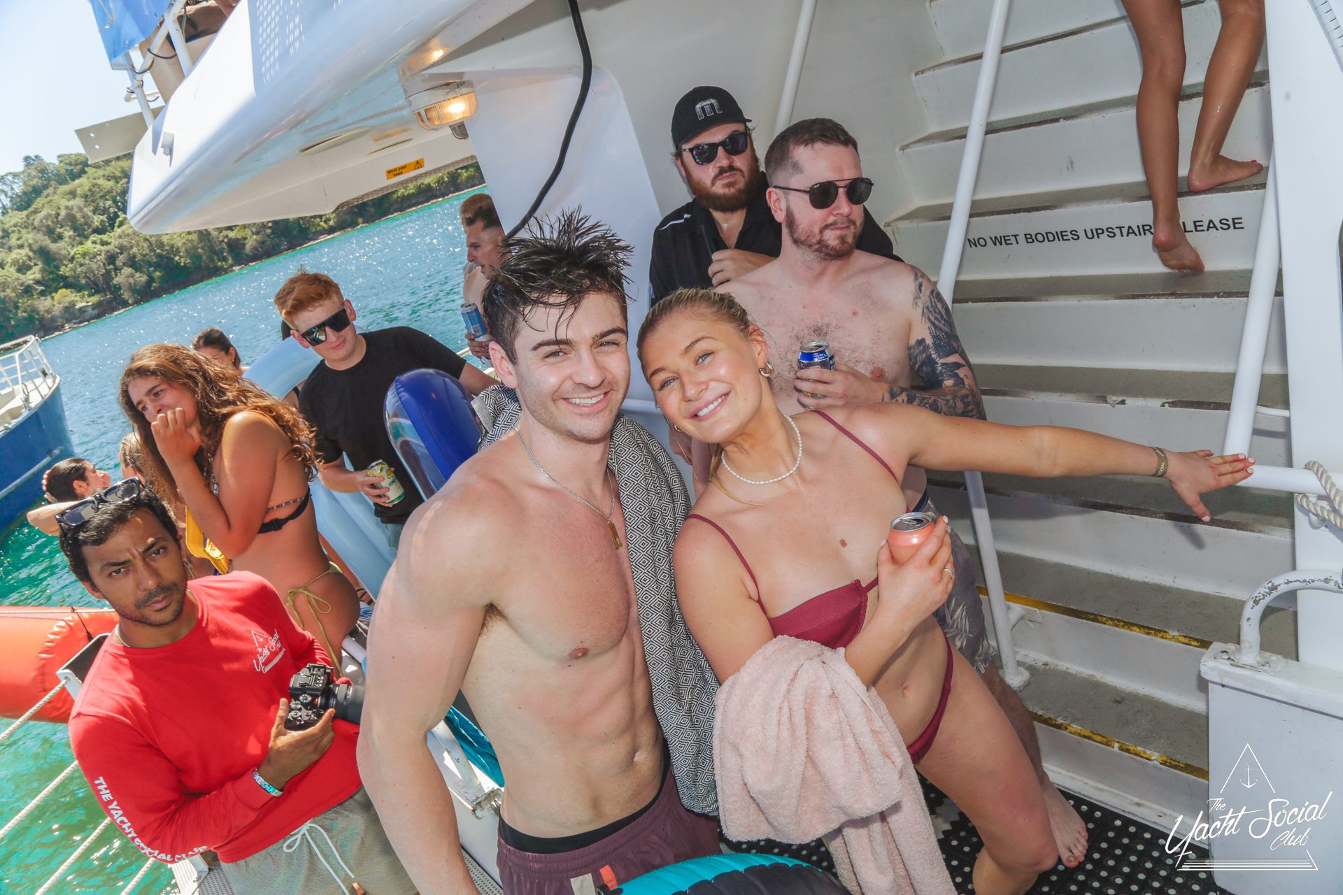 A group of young adults smile and pose with drinks on a boat, wearing swimsuits. Other people relax in the background, with more boats and water visible behind them on a sunny day.