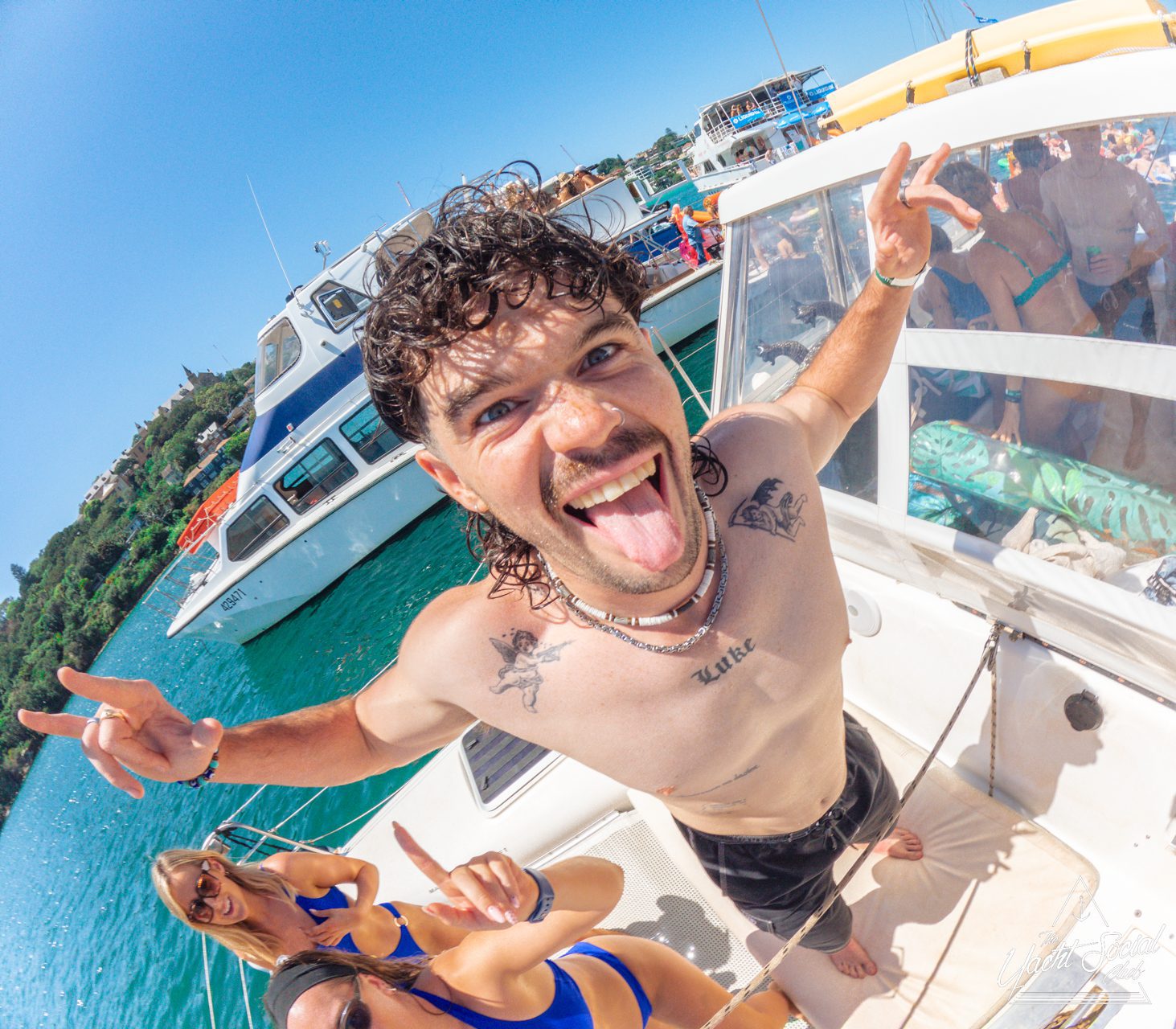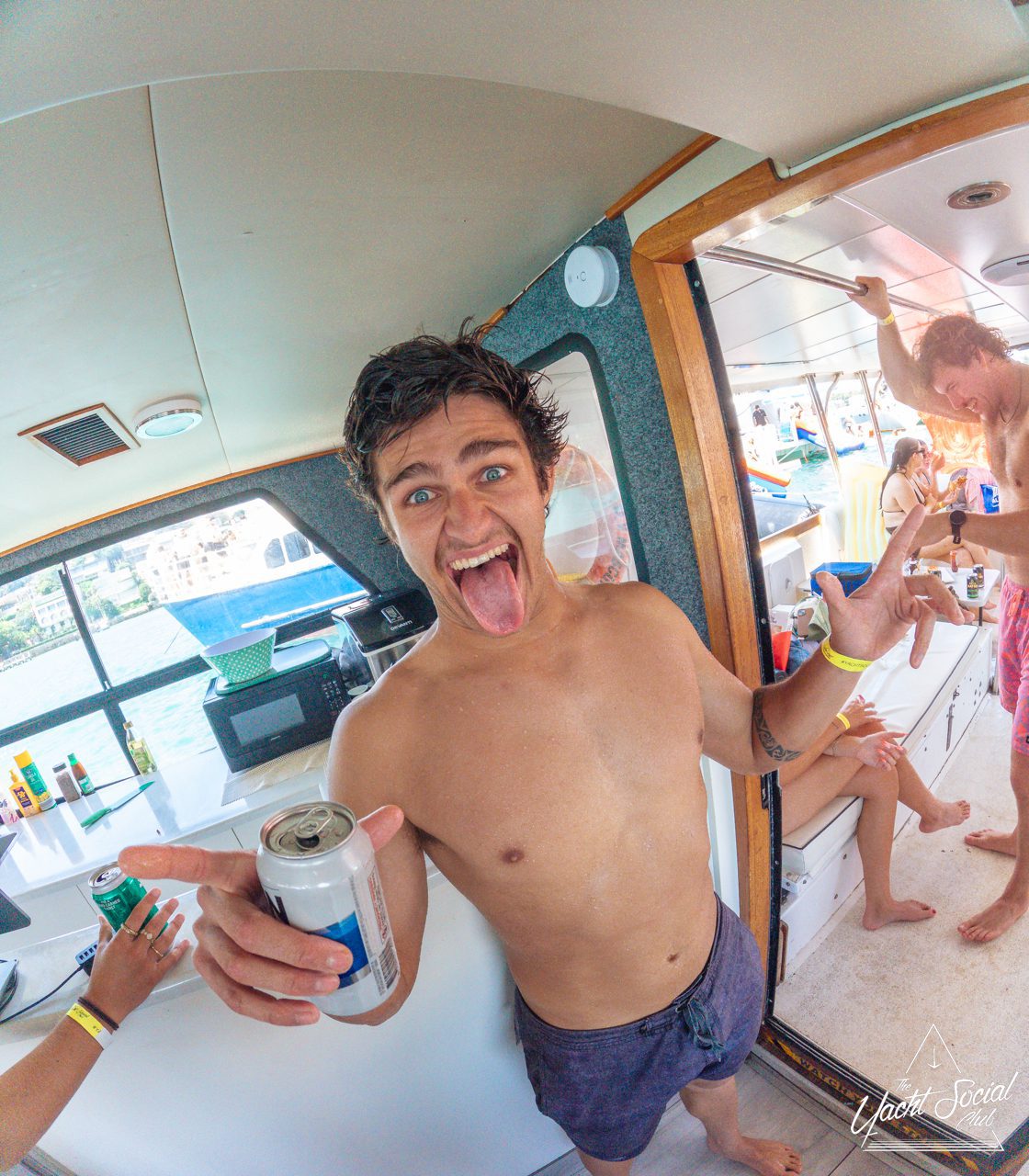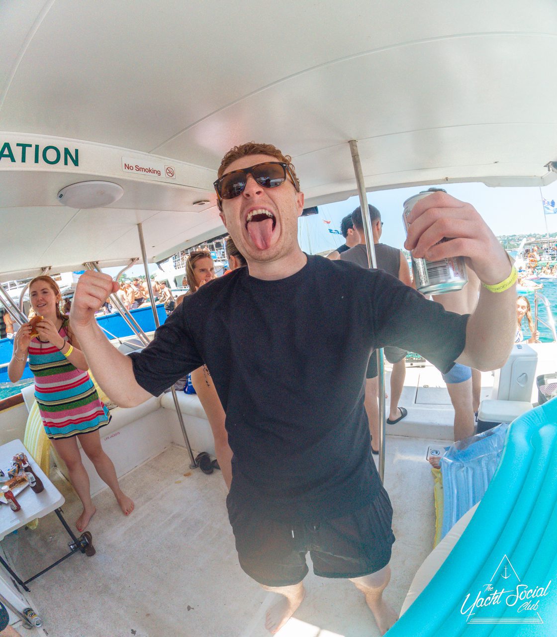 A shirtless young man with wet hair stands on a boat, smiling and sticking out his tongue, holding a can and gesturing with his hand. Other people are in the background, enjoying the party atmosphere.
