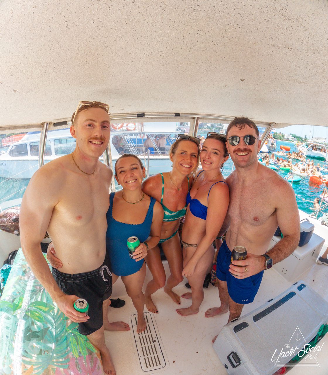 A group of five friends in swimwear relax and smile on a boat, with crowded party boats and people swimming in the blue water under a sunny sky in the background.
