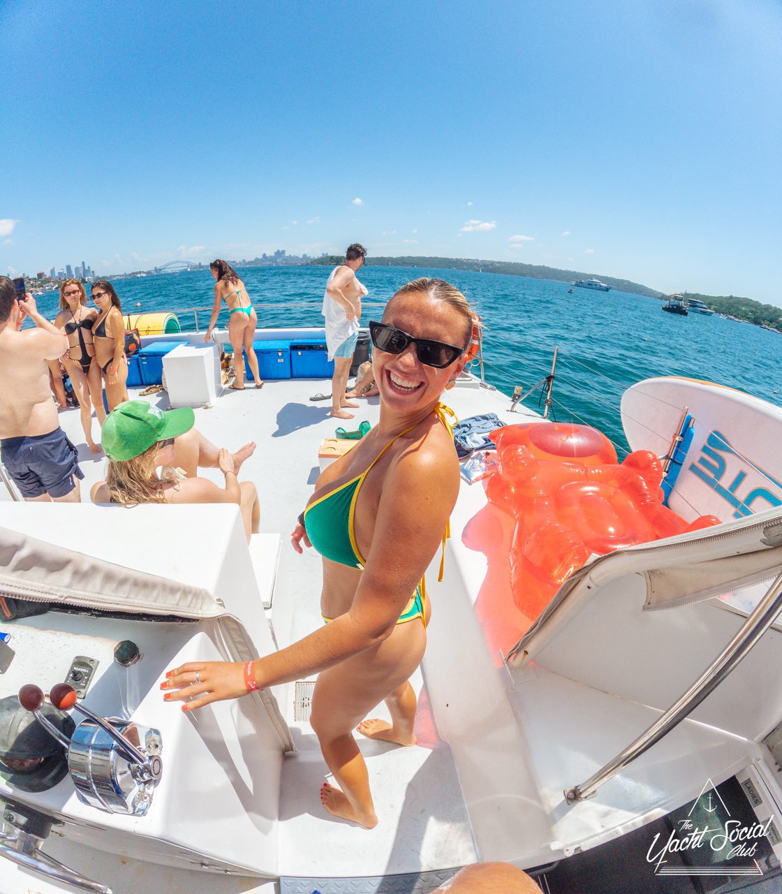 A woman in a green and yellow bikini smiles at the camera on a boat with people relaxing around her under a clear blue sky. The boat is on a bright, calm sea with city buildings visible in the distance.