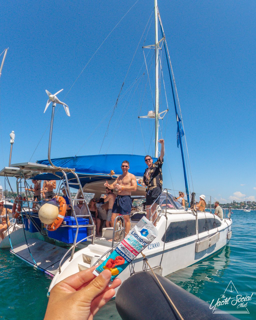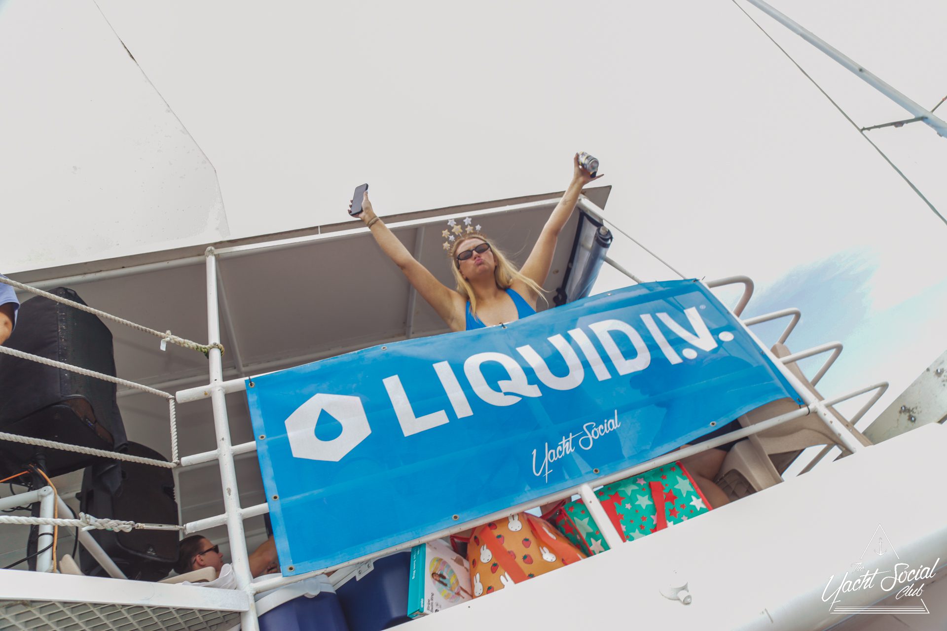 Two women in swimsuits smiling and posing with arms raised under a blue LIQUID I.V. umbrella at a lively boat party with people swimming and relaxing on floats in the ocean.