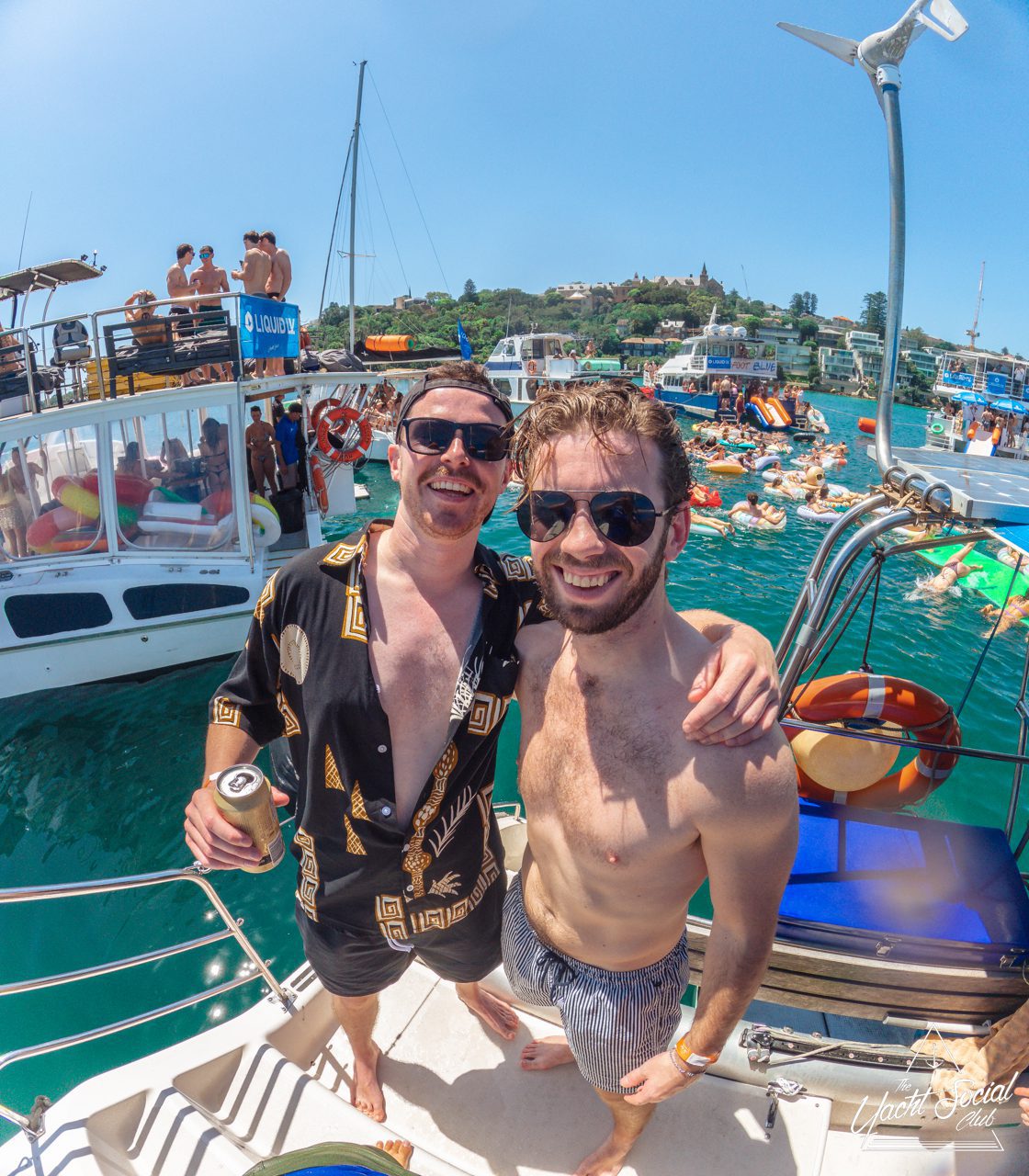 Two smiling men in swim trunks pose with drinks at a lively boat party. Other people socialize and dance on boats in the background on a sunny day, with clear blue water and green trees nearby.